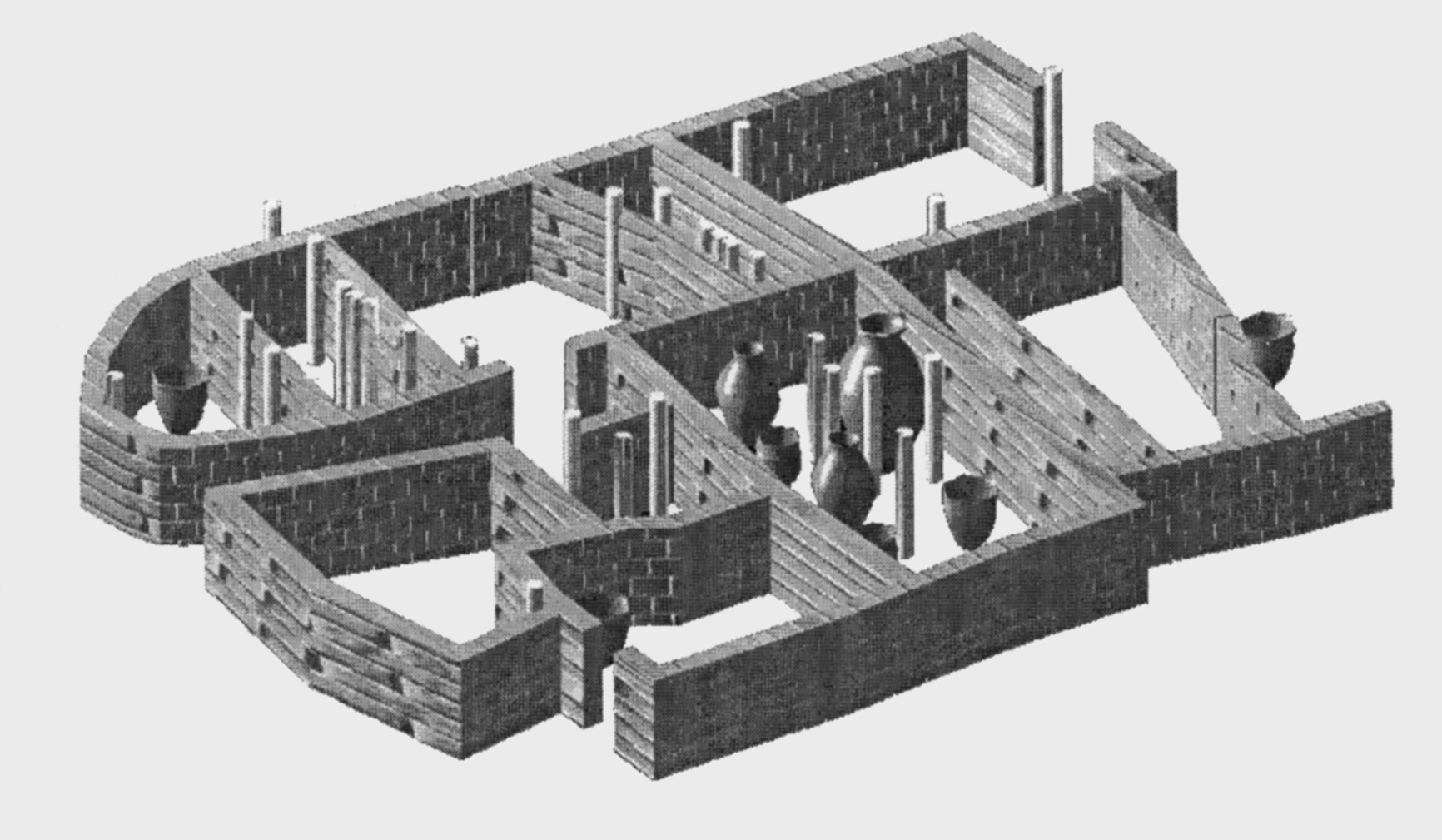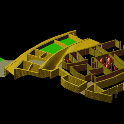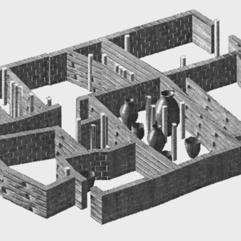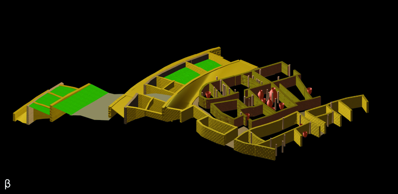 • 3α-β. Τούμπα Θεσσαλονίκης: αναπαράσταση με Η/Υ του κεντρικού οικοδομήματος και της βαθμιδωτής διάταξης των ανδήρων στην άκρη του οικισμού κατά το τέλος της ύστερης εποχής του χαλκού (από Ανδρέου - Κωτσάκης 1999, εικ. 6 και 10).
