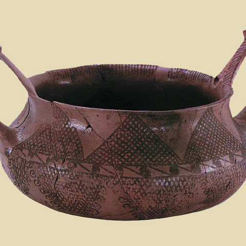 • 8.8. Σταθμός Αγγίστας Ν. Σερρών: χειροποίητο δίωτο κανθαρόσχημο αγγείο με εγχάρακτη διακόσμηση που τονίζεται από λευκή ασβεστώδη ύλη (ΜΚΑ 4314). (Από Αρχαία Μακεδονία, Κατάλογος έκθεσης Αυστραλίας, ΥΠΠΟ-ICOM, Αθήνα 1988 και από Ελληνικός Πολιτισμός. Μακεδονία. Το βασίλειο του Μ. Αλεξάνδρου, Κατάλογος έκθεσης Μοντρεάλ, ΥΠΠΟ-ICOM, Αθήνα 1993).