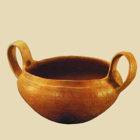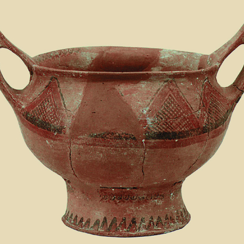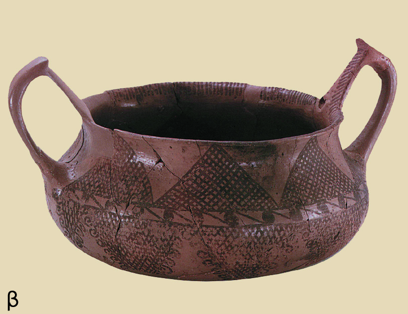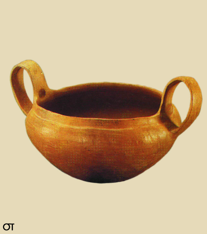 • 8.2. Καλινδριά Ν. Θεσσαλονίκης: δίωτο κανθαρόσχημο χειροποίητο αγγείο, με αμαυρόχρωμη διακόσμηση (ΜΘ 4556).