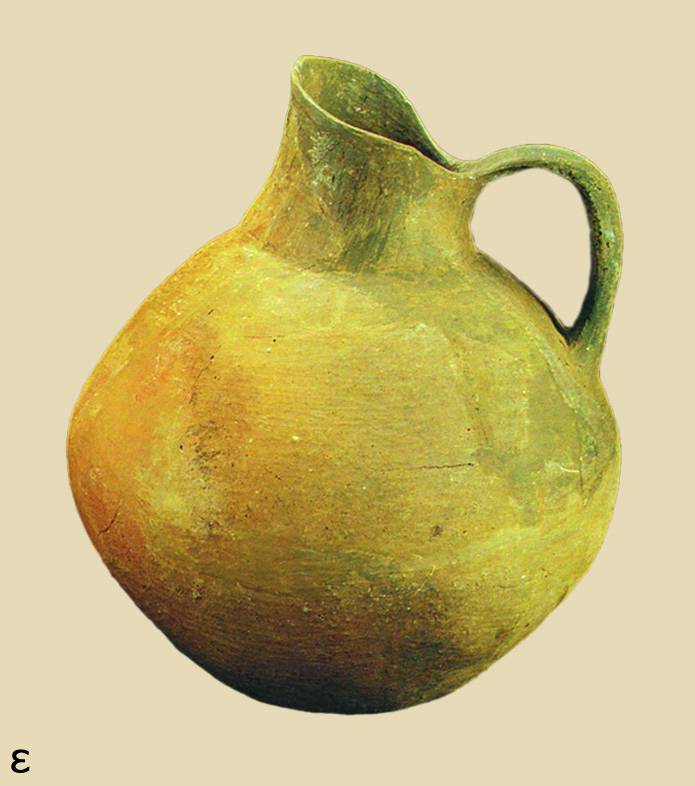 α) Αδιακόσμητη κεραμική καθημερινής χρήσης, με χαρακτηριστικά αγγεία την πρόχου με λοξότμητη προχοή και τα φιαλόσχημα με λαβές διχαλωτές (wish bone handles).