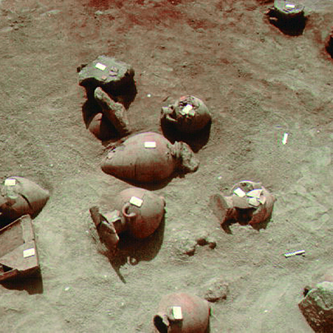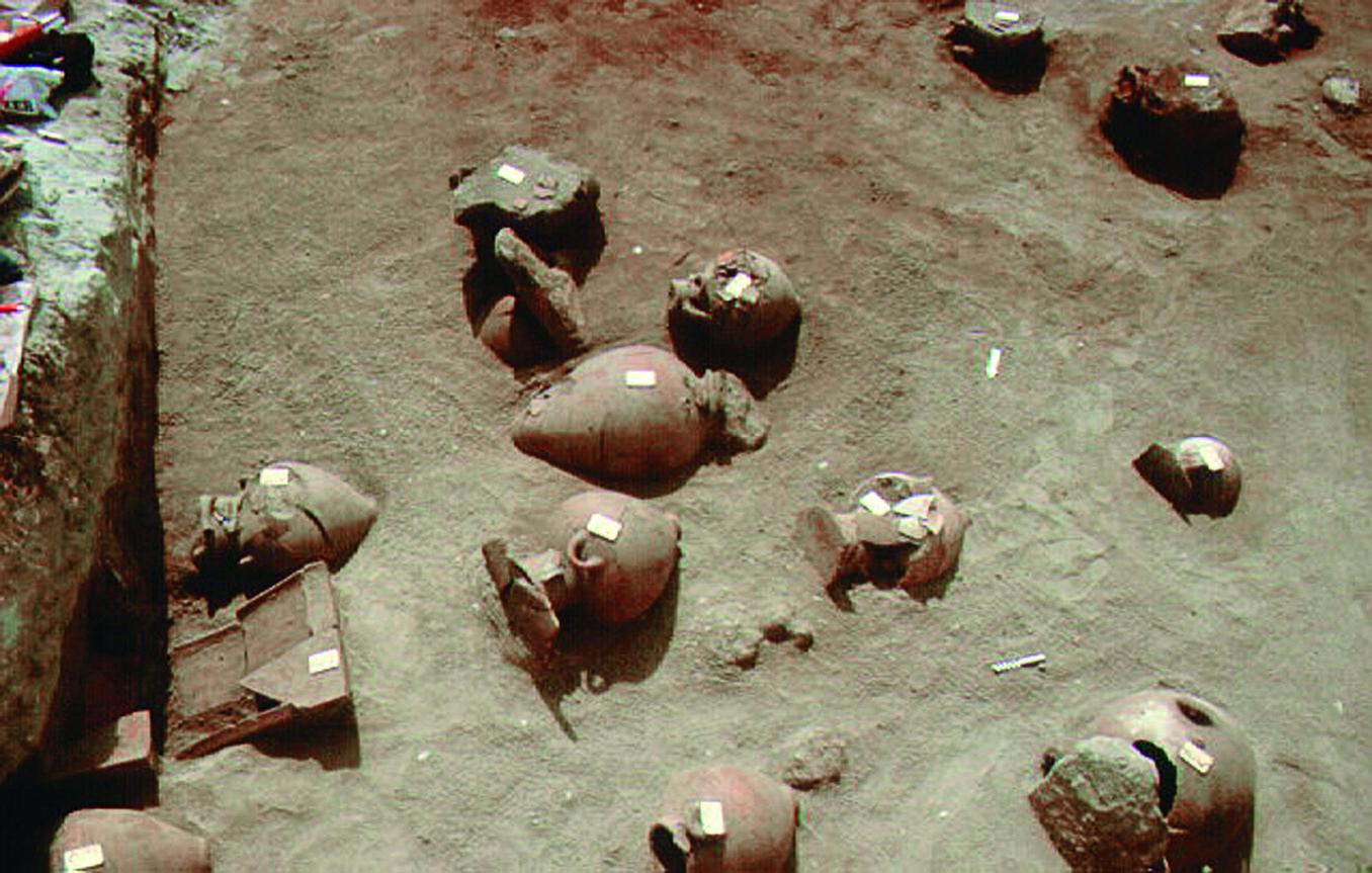 Τρεις μεγάλοι τροχήλατοι πιθαμφορείς και ένας πίθος αποτελούν χαρακτηριστικά παραδείγματα αγγείων τα οποία αποδίδονται σε εργαστήρια της Αγχιάλου ή σε κάποια γειτονική περιοχή στον μυχό του Θερμαϊκού κόλπου. Οι δύο πρώτοι πιθαμφορείς εντάσσονται στον τύπο ΙΙ των αμφορέων της Τροίας, μίας ευρύτατα διαδεδομένης ομάδας αγγείων με εμπορική χρήση, η παραγωγή των οποίων ξεκινά περίπου στα μέσα του 9ου αι. και φαίνεται ότι διακόπτεται μόλις στον πρώιμο 7ο αι. π.Χ. Η διακόσμηση των αγγείων, σε καστανέρυθρο χρώμα, αποτελείται κυρίως από επάλληλες οριζόντιες ταινίες και γραμμές, ενώ την περιοχή του ώμου κοσμούν ομόκεντροι κύκλοι. Αγγεία του τύπου αυτού έχουν βρεθεί επίσης στον οικισμό της Μένδης, την Αγχίαλο, τη Θάσο, τον Καστανά, αλλά και την Ιωλκό και το Λευκαντί. Ο τρίτος πιθαμφορέας και ο πίθος αντιπροσωπεύουν μια ενδιαφέρουσα κατηγορία «ασημίζουσας» κεραμικής, η παραγωγή της οποίας ξεκινά στο α' μισό του 8ου αι. π.Χ. και είναι ιδιαίτερα συχνή στο α' μισό του 7ου αι. π.Χ. Διακρίνεται για τα μεγάλα σχήματα των αγγείων της και την πυκνή διακόσμηση, σε επάλληλες ζώνες, από γεωμετρικά μοτίβα τα οποία αποδίδονται με ιώδες χρώμα. Δείγματα της συγκεκριμένης κατηγορίας, έχουν αποκαλυφθεί και στο Καραμπουρνάκι, τη Σάνη, την Άκανθο, τη Θάσο και αλλού.