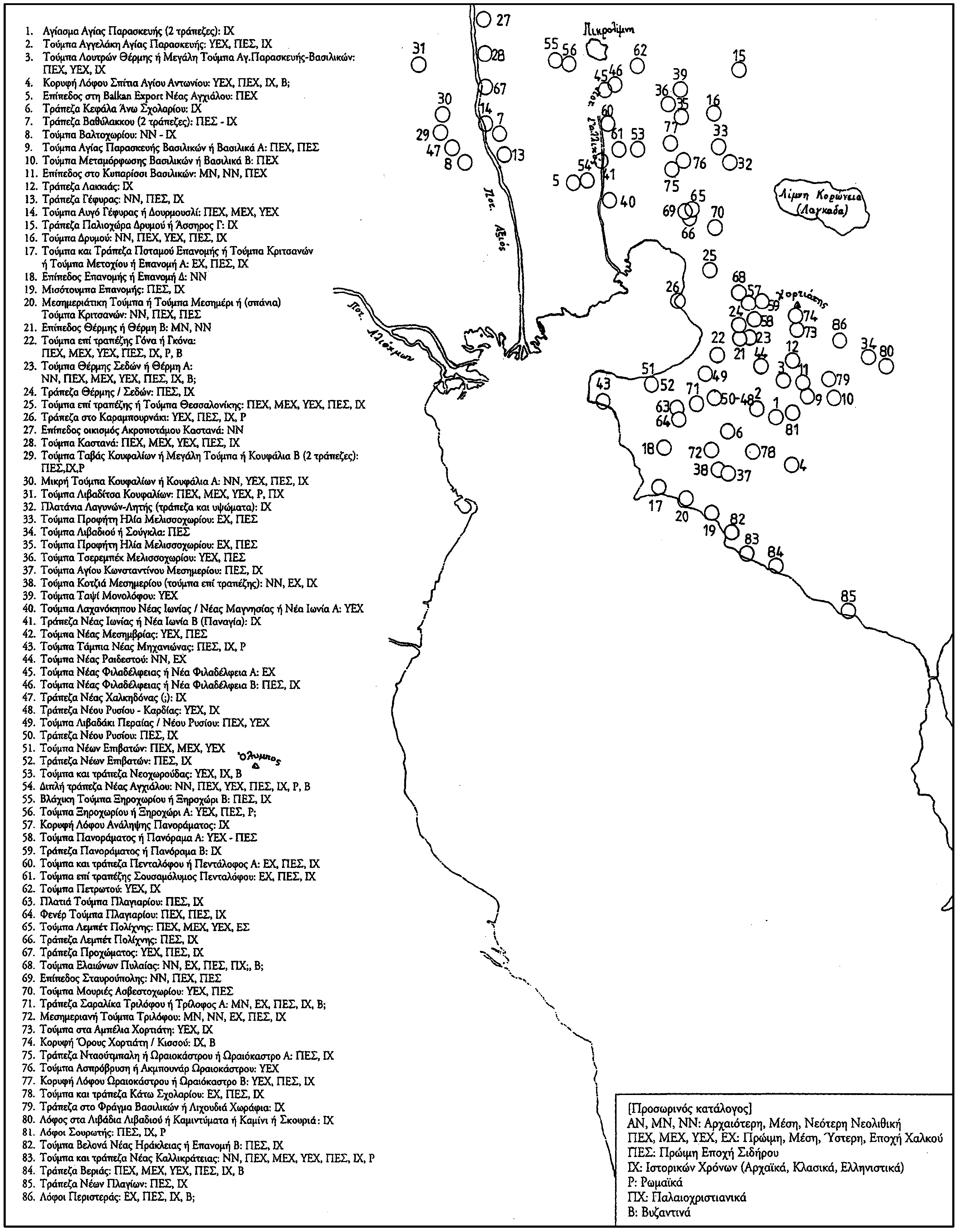 Α) Ανάμεσα στις ανατολικές όχθες των εκβολών του Αξιού και τις δυτικές όχθες των εκβολών του Γαλλικού, κυριαρχούν οι αρχαίες θέσεις τράπεζα της Γέφυρας και διπλή τράπεζα της Νέας Αγχιάλου, μέχρι τα όρια της πεδινής ζώνης βορειότερα της οποίας διακρίνονται η τούμπα του Καστανά και οι τράπεζες της Νέας Φιλαδέλφειας. Στην περιοχή καταλήγουν παρόχθιες διαδρομές από τη βορεινή ενδοχώρα. Παραμένει ωστόσο ανοικτό το πρόβλημα κατανόησης των γεωλογικών μεταβολών, όπου συναντώνται παραπόταμοι, ρέματα, παλαιές και νεότερες διαμορφώσεις εκβολών. Κατά συνέπεια δυσχεραίνεται και η αναγνώριση της ακτογραμμής και των παράλιων τοπίων της εποχής του σιδήρου καθώς και των ευλίμενων σημείων.