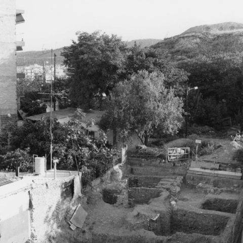 • 10. Τούμπα Θεσσαλονίκης 1993. Αποψη ανασκαφής επί της οδού Δρυός 10 στην τράπεζα. Διακρίνονται αριστερά φάσεις της ΥΕΧ και της ΠΕΣ, αποθήκες και πηγάδια της εποχής του σιδήρου και λείψανα σπιτιού του 6ου αι. π.Χ. (στο κέντρο και επάνω δεξιά), από νότια (φωτ. Κ.Σ.).