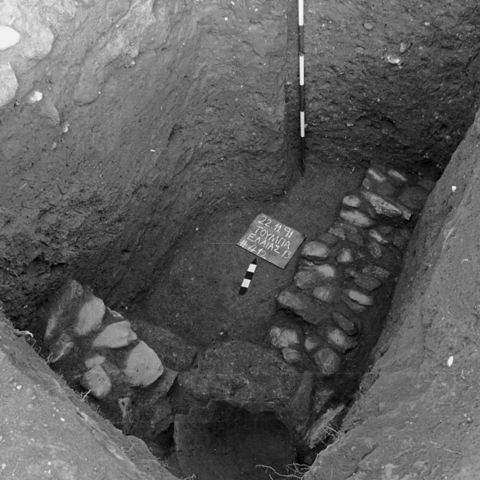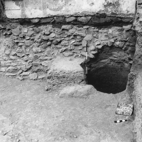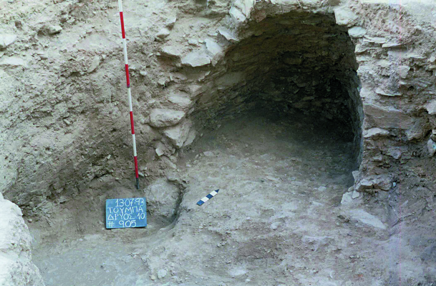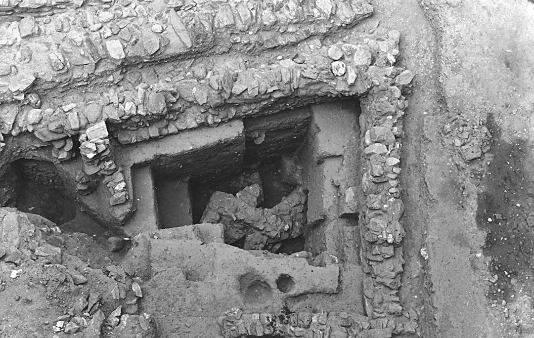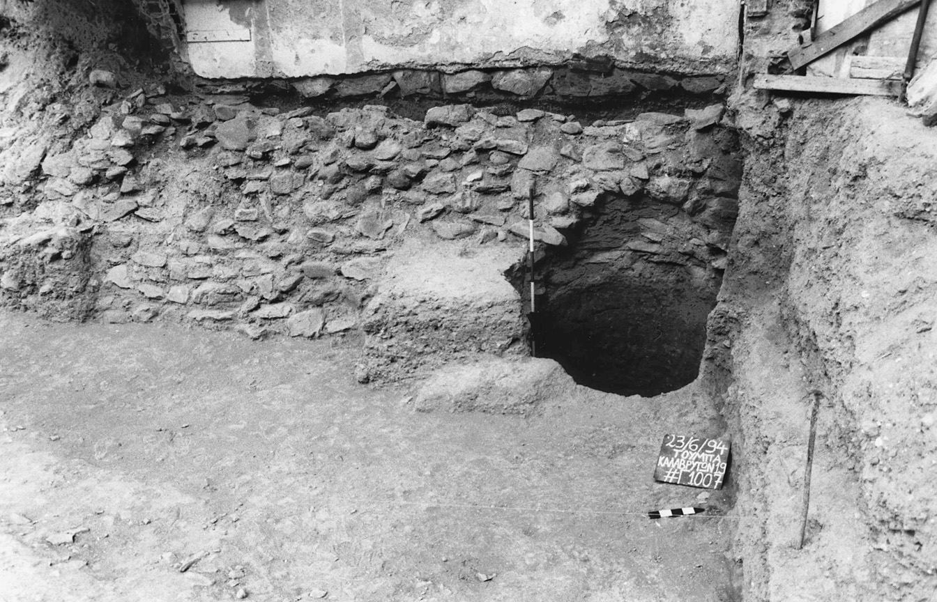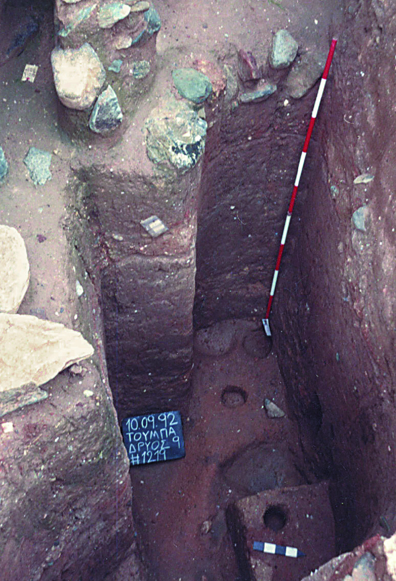 • 12. Τούμπα Θεσσαλονίκης 1993. Λεπτομέρεια ανασκαφής επί της οδού Δρυός 10 στην τράπεζα. Κτιστή υπόσκαφη αποθήκη (φωτ. Κ.Σ.).