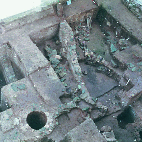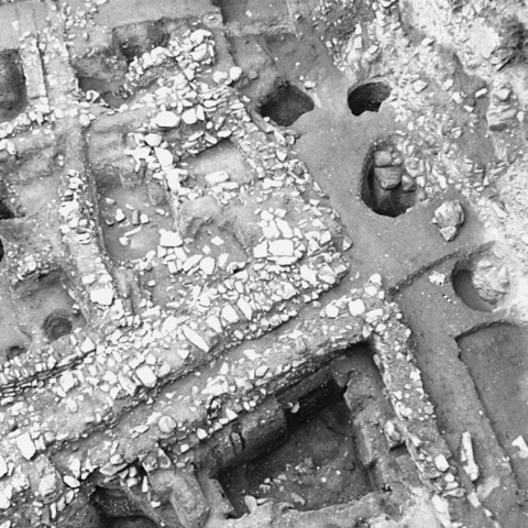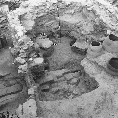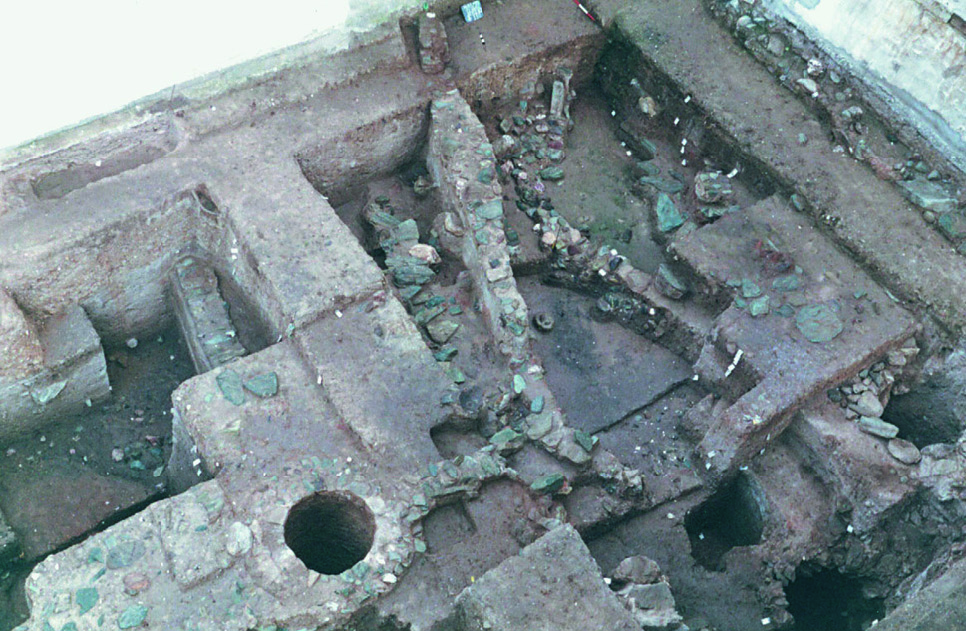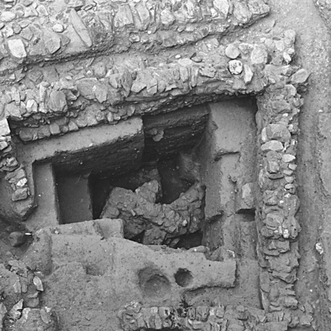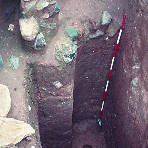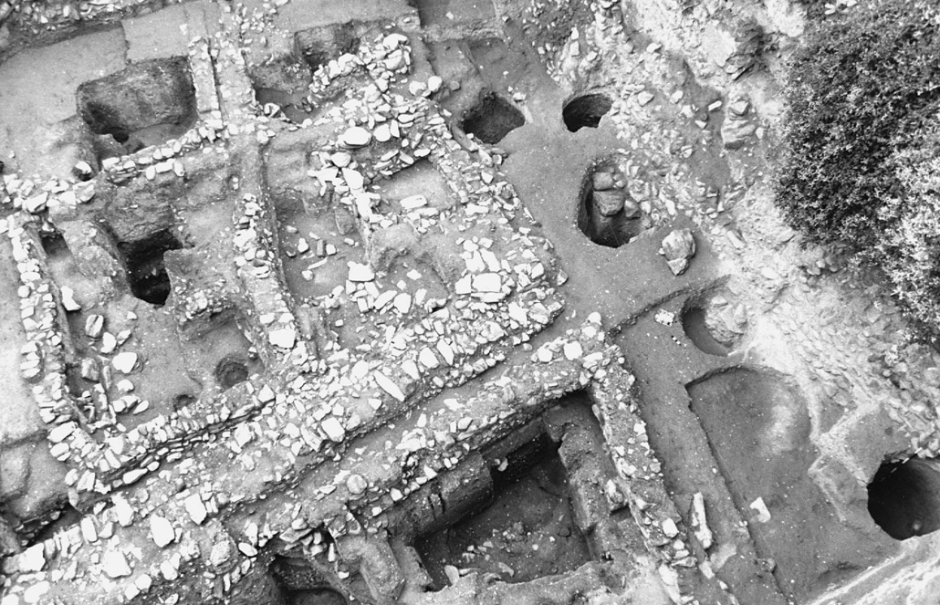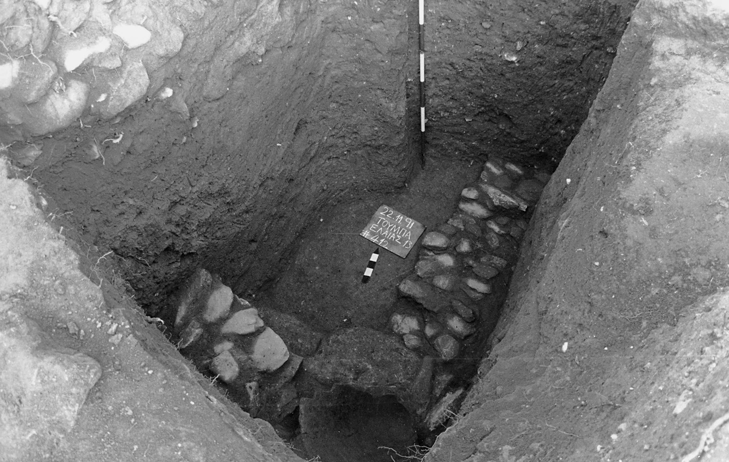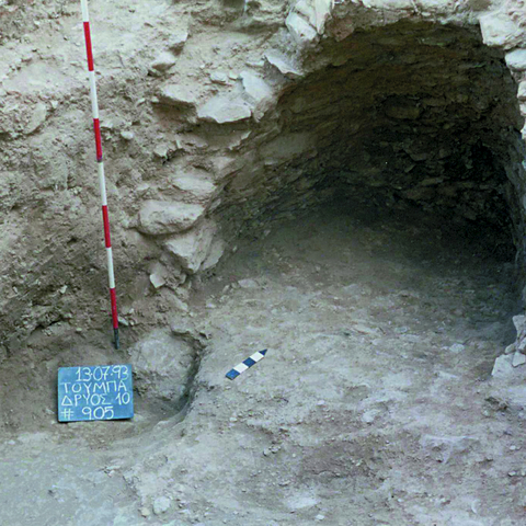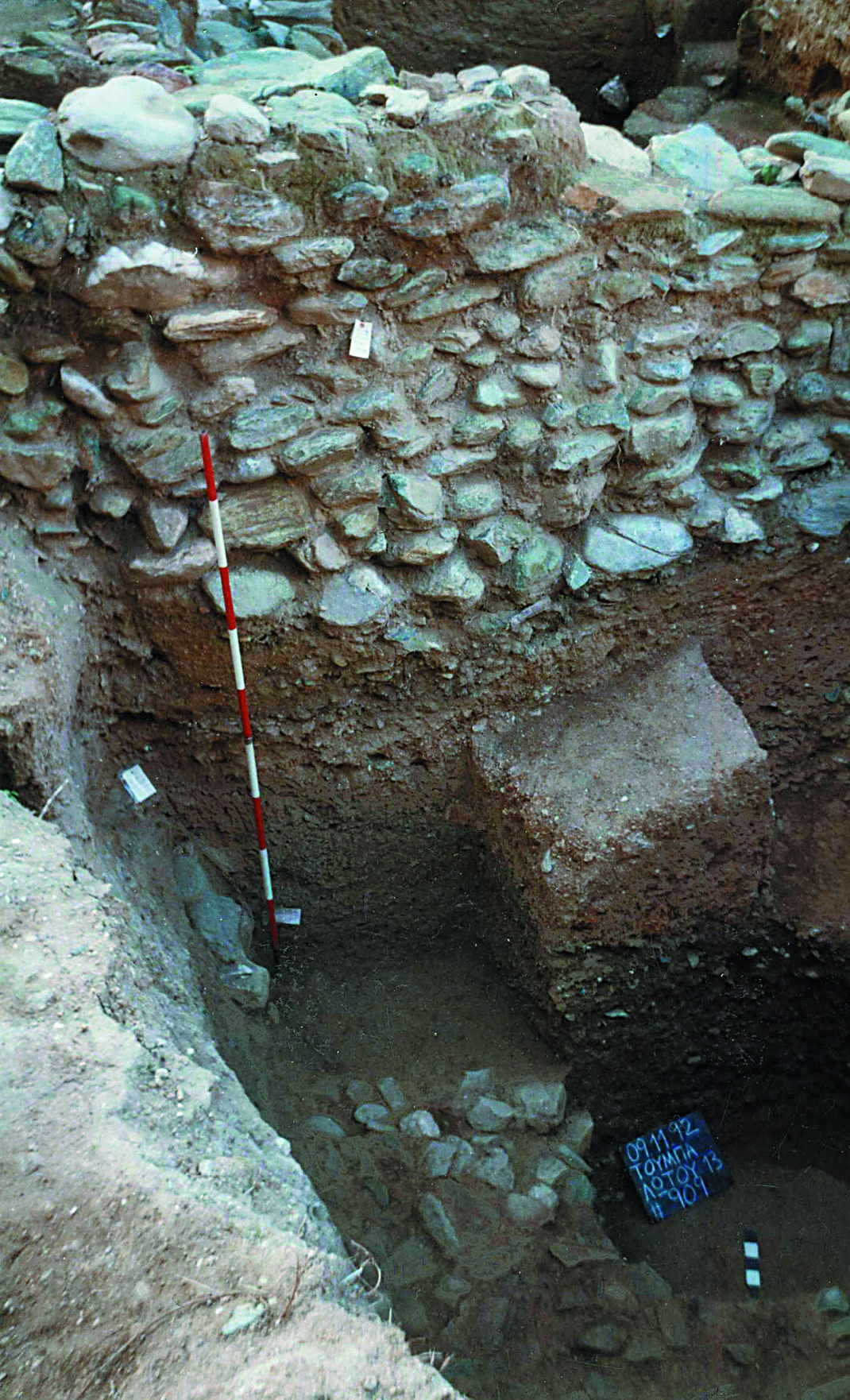 • 12. Τούμπα Θεσσαλονίκης 1993. Λεπτομέρεια ανασκαφής επί της οδού Δρυός 10 στην τράπεζα. Κτιστή υπόσκαφη αποθήκη (φωτ. Κ.Σ.).