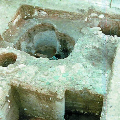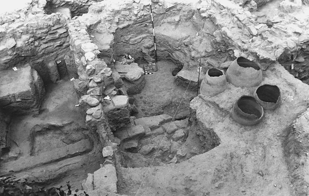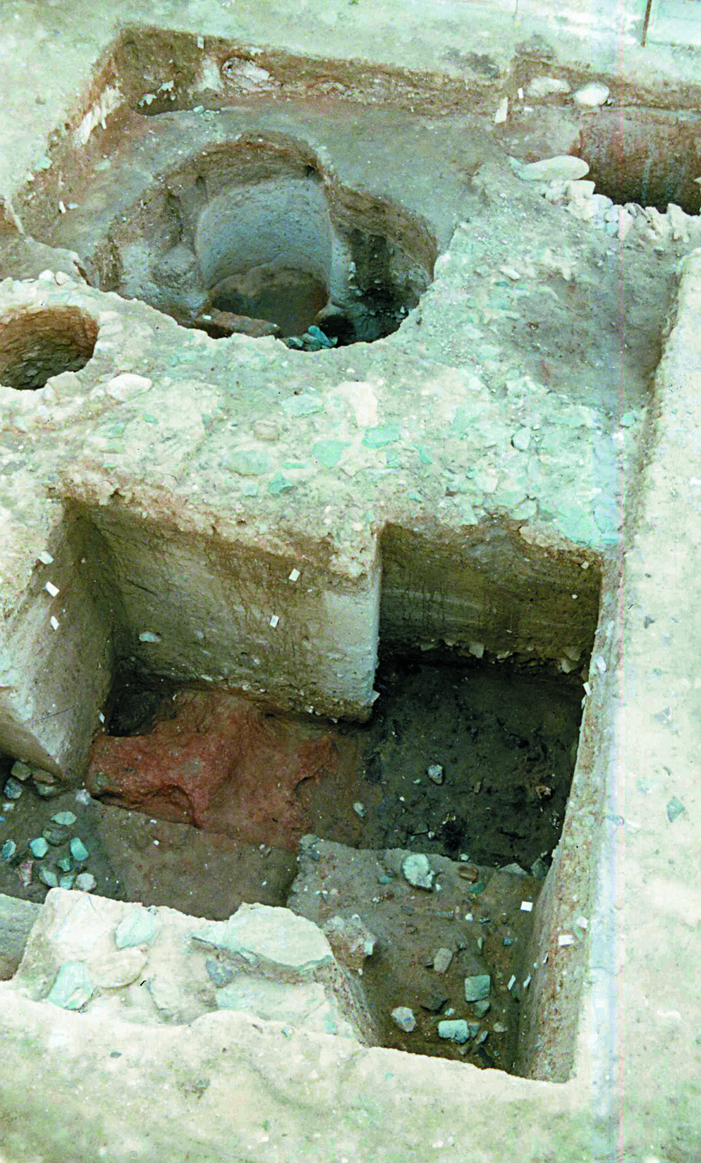 • 19. Τούμπα Θεσσαλονίκης 1994. Λεπτομέρεια ανασκαφής επί της οδού Καλαβρύτων 19 στη τράπεζα. Αποθηκευτικοί χώροι (φωτ. Κ.Σ.).