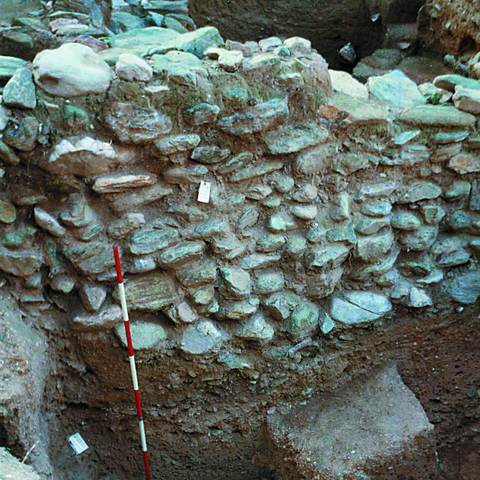 • 14. Τούμπα Θεσσαλονίκης 1992. Άποψη ανασκαφής επί της οδού Λωτού 11-13 στην τράπεζα. Διακρίνεται φάση της εποχής του σιδήρου με πλινθόκτιστο τοίχο, φερτό πηλόχωμα και θεμελίωση οικοδομικών φάσεων του 6ου και 5ου αι. π.Χ., από ανατολικά (φωτ. Κ.Σ.).