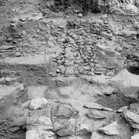 • 16. Τούμπα Θεσσαλονίκης 1991. Λεπτομέρεια ανασκαφής επί της οδού Ελαίας 13 στην τράπεζα. Οικοδομική φάση της εποχής του σιδήρου και φερτό πηλόχωμα πριν από τις φάσεις του 6ου-4ου αι. π.Χ. (φωτ. Κ.Σ.).