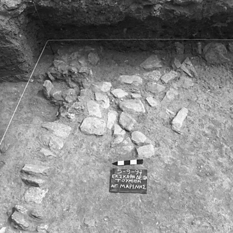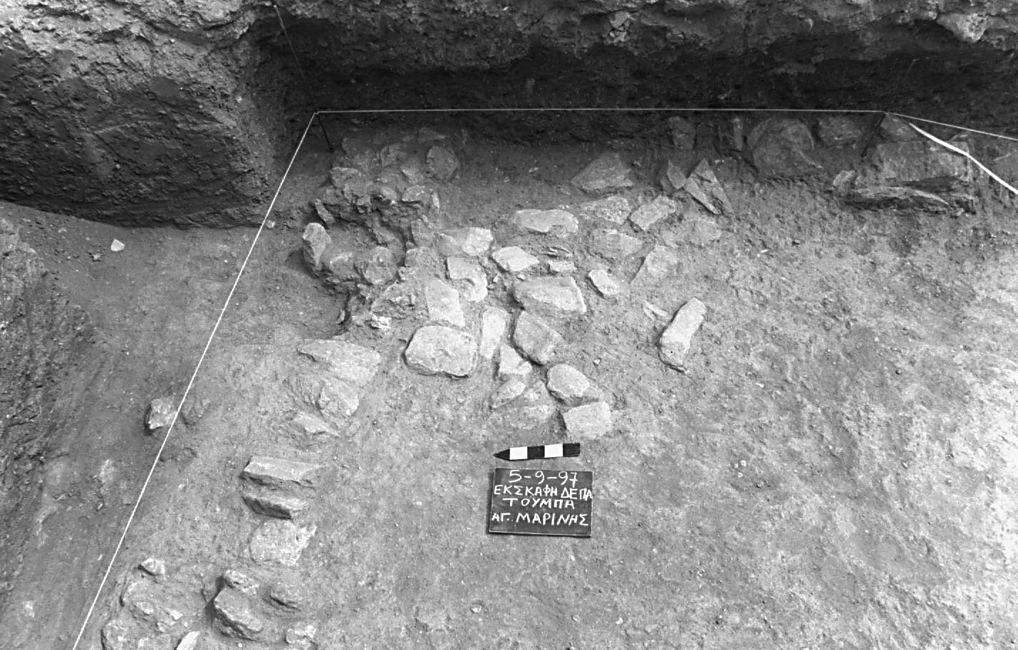 Δ) Περίπου 60 μ. ανατολικά των ορίων της τράπεζας, σε ανωφέρεια, νότια του ίδιου ρέματος που περιβάλλει από βόρεια και δυτικά την Τούμπα, στην είσοδο της εκκλησίας της Αγίας Μαρίνας στην ομώνυμη οδό, δύο λίθινες θεμελιώσεις τοιχαρίων 6 μ. ερευνήθηκαν ανασκαφικά (Σουέρεφ 1997) (Eικ. 21, 22, 23). Αποτελούσαν τμήμα ορθογώνιου κτίσματος με δύο χώρους εκ των οποίων ο ένας ήταν στεγασμένος και περιλάμβανε αποθηκευτικό αγγείο στη θέση του και κυκλικό λιθόστρωτο που συγκρίνεται με ανάλογη κατασκευή γνωστή από το Λευκαντί της Εύβοιας, το Ποσείδι Χαλκιδικής και την τράπεζα Πολίχνης της Θεσσαλονίκης. Η κεραμική που συνόδευε τα ευρήματα αυτά ανήκε στην πρώιμη εποχή του σιδήρου πριν από τον 8ο αι. π.Χ.