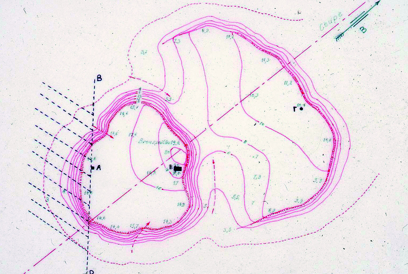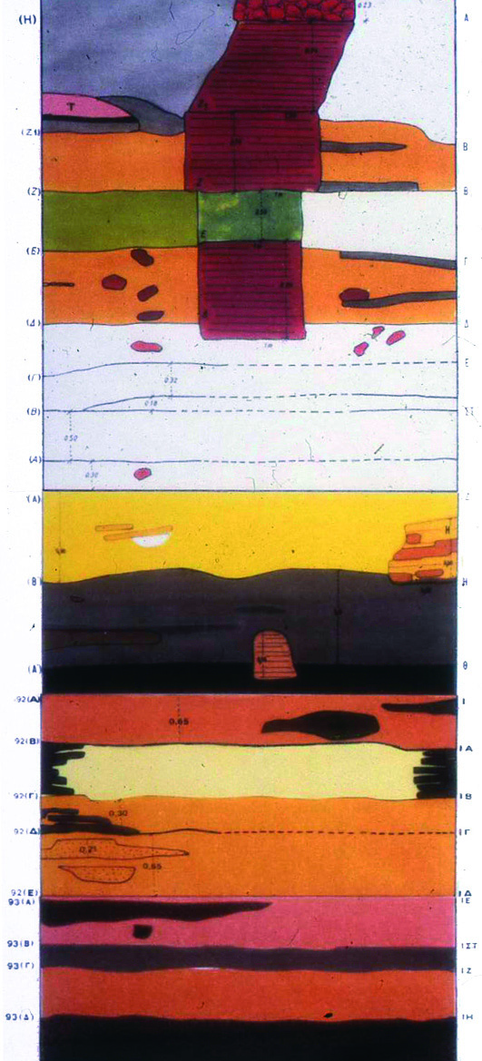 Ερευνήθηκαν λίγες θέσεις του αρχαίου οικισμού τόσο στην πάνω όσο και στην κάτω τράπεζα. Στη νότια παρυφή της ψηλότερης τράπεζας ανοίχτηκε ένα σκάμμα (Α) διαστάσεων 2 x 4 μ. και βάθους γύρω στα 16 μ. από την επιφάνεια του εδάφους και η μελέτη της στρωματογραφίας του έδωσε ένα πλήρες σχεδόν σχεδιάγραμμα της ιστορίας του αρχαίου αυτού οικισμού (Εικ. 3). Πάνω σε ένα έξαρμα του εδάφους που σχηματιζόταν από παχύ στρώμα άμμου και το οποίο εντοπίστηκε σε βάθος γύρω στα 12 μ., επισημάνθηκε η πρώτη ανθρώπινη εγκατάσταση. Σύμφωνα με τον γεωλόγο Κ. Αλμπανάκη το παχύ αυτό στρώμα της άμμου έχει σχηματιστεί πριν από εκατομμύρια χρόνια, πριν ακόμη δημιουργηθεί ο Θερμαϊκός Κόλπος, από ποτάμιες αποθέσεις, οι οποίες στη συνέχεια καλύφτηκαν από τα νερά λίμνης. Η πρώτη αυτή εγκατάσταση, που χρονολογείται στην Ύστερη Εποχή του Χαλκού (13ος-12ος αι. π.Χ.), είχε αναπτυχθεί πάνω σ' ένα στρώμα που είχε δημιουργηθεί από φερτά χώματα μέσα στα οποία υπήρχαν όστρακα από αγγεία της Ύστερης Νεολιθικής Εποχής και της Ύστερης Εποχής του Χαλκού. Πάνω από αυτό το στρώμα εντοπίστηκαν πολλές και επάλληλες εγκαταστάσεις από τις οποίες η νεότερη χρονολογείται στις πρώτες δεκαετίες του 5ου αι. π.Χ. Οι ακόμη οψιμότερες φάσεις που σίγουρα υπήρχαν, όπως βεβαιώνουν σχετικά επιφανειακά ευρήματα, φαίνεται ότι έχουν χαθεί από νεότερες επεμβάσεις. Ενδιαφέροντα ήταν τα κινητά και ακίνητα ευρήματα που αποκαλύφτηκαν στο σκάμμα αυτό. Ανάμεσα στα άλλα ήλθαν στο φως διώροφος πεταλόσχημος μαγειρικός φούρνος σε στρώμα που χρονολογείται, από την υστερομυκηναϊκή κεραμική που βρέθηκε εδώ, στον 12ο-11ο αι. π.Χ., οικοδομικά λείψανα διαφόρων εποχών, πιθανά υπολείμματα από εργαστήριο χαλκουργίας του 9ου αι. π.Χ., ωοειδείς εστίες με πήλινους κρατευτές που χρονολογούνται γύρω στο 800 π.Χ., πιθεών του 8ου αι. π.Χ. και μια εργαστηριακή εγκατάσταση του 6ου αι. π.Χ. που προφυλασσόταν με σκέπαστρο από καλαμιές και πηλό. Από τα κινητά ευρήματα σημειώνουμε ένα σπάνιο πτηνόμορφο ειδώλιο που χρονολογείται γύρω στο 800 π.Χ. και την κεραμική, ντόπια και εισαγμένη. Τα εισαγμένα αγγεία στα βαθύτερα στρώματα ήταν σπάνια και ανάμεσά τους ξεχώριζαν όστρακα μιας τροχήλατης, τεφρής (γκρίζας) κεραμικής, γνωστής από πολλές θέσεις της Αν. Μεσογείου, με κέντρο παραγωγής της ίσως τη βορειοδυτική Μ. Ασία και κυρίως την Τρωάδα. Είναι πολύ πιθανόν ότι παρόμοια κεραμική τουλάχιστον από τον 9ο αι. π.Χ. άρχισαν να παράγουν και ντόπια κεραμικά εργαστήρια. Στον 8ο αι. π.Χ. αρχίζει να κάνει αισθητή την παρουσία της γεωμετρική εισαγμένη κεραμική. Σε στρώμα που χρονολογείται γύρω στο 720 π.Χ. εντοπίστηκαν έντονα ίχνη φωτιάς και μεγάλος αριθμός οστράκων, πολλά από τα οποία συγκολλήθηκαν και σχημάτισαν ολόκληρα αγγεία, εγχώρια και εισαγμένα. Είχαμε λοιπόν εδώ μια καταστροφή. Πλούσια ήταν στο σκάμμα αυτό και τα βοτανολογικά κατάλοιπα που εντοπίστηκαν και τα οποία σε μία πρώτη φάση μελέτησε η αείμνηστη Μ. Μαγκαφά. Αναγνωρίστηκαν απανθρακωμένοι σπόροι σταφυλιών και δημητριακών (όπως π.χ. από κουκκιά, φακές, ρεβίθια). Φαίνεται ότι οι κάτοικοι του οικισμού καλλιεργούσαν οι ίδιοι πολλά από τα παραπάνω είδη αφού για αρκετά από αυτά εντοπίστηκαν προϊόντα και υποπροϊόντα από όλα τα στάδια της επεξεργασίας τους. Και εκτός από τα σιτηρά, τα όσπρια, τα διάφορα χορταρικά και το κρέας, βασικό είδος διατροφής των κατοίκων του οικισμού φαίνεται ότι ήταν και τα θαλασσινά 