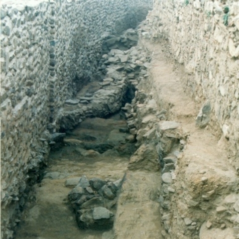 Στο βορειότερο τμήμα του δρόμου αποκαλύφθηκε σε μήκος 14 μ. και πλ. 1,60-2 μ., το βορειοδυτικό τμήμα ενός ορθογώνιου κτιρίου (κτίριο Α) κτισμένου στον άξονα Β > Ν (Σχ. 2) (Εικ. 3). Τα όρια του κτιρίου προς τα νότια δεν ήταν δυνατό να εντοπιστούν με ακρίβεια και η συνέχειά του προς τα ανατολικά είχε διακοπεί με την κατασκευή του αναλημματικού τοίχου που στήριζε τον ρωμαϊκό δρόμο.[128]