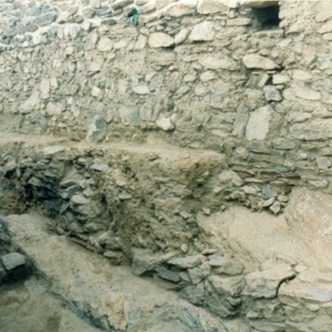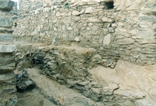 Στα δύο άκρα ενός τμήματος του δυτικού τοίχου, μήκους 3 μ., όπου το πλάτος της επίπεδης επιφάνειας θεμελίωσης ήταν κατά 0,50 μ. μεγαλύτερο από το πάχος του τοίχου, (Σχ. 2) (Εικ. 4) διαμορφώνονταν δύο εσοχές όπου, όπως φάνηκε από τις λιγοστές πέτρες που είχαν παραμείνει στη θέση τους, προσαρμόζονταν δύο εγκάρσιοι τοίχοι που χώριζαν τον εσωτερικό χώρο σε τρία δωμάτια· δύο ισομεγέθη μήκους 3 μ. στο βορειότερο τμήμα και ένα τρίτο με αδιευκρίνιστες διαστάσεις στα νότια.