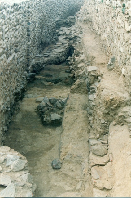 128 Η ανασκαφή των κτισμάτων της εποχής του Σιδήρου γινόταν αναγκαστικά μέσα στα όρια του δρόμου της ρωμαϊκής περιόδου, δηλαδή ανάμεσα στα ρωμαϊκά οικοδομήματα που υπήρχαν στα δυτικά και τον αναλημματικό τοίχο, που είχε κατασκευαστεί για να στηρίζει τον δρόμο από τα ανατολικά. Αυτό είχε ως αποτέλεσμα να είναι δυνατή η ανασκαφή μόνο ενός τμήματος (του δυτικού κατά κανόνα) των κτιρίων της εποχής του Σιδήρου, ενώ η συνέχειά τους προς τα ανατολικά ανιχνευόταν στα χαμηλότερα στρώματα των ρωμαϊκών οικοδομημάτων που είχαν κατασκευαστεί ανατολικά του αναλημματικού τοίχου. Έτσι, στα χαμηλότερα στρώματα του ρωμαϊκού κτίσματος ΙΧ, ανατολικά του αναλημματικού τοίχου (σχ. 2), υπήρξαν εμφανείς ενδείξεις, όπως βαθμιδωτά επίπεδα που διαμορφώνονταν στον φυσικό βράχο και οριοθετούνταν σε αρκετές περιπτώσεις από πασσαλότρυπες και λάκκοι διαφόρων μεγεθών και σχημάτων με κεραμική της εποχής του Σιδήρου, που μαρτυρούσαν τη συνέχεια του κτιρίου Α προς τα ανατολικά. Η αναλυτική μελέτη αυτών των ευρημάτων θα δώσει περισσότερα στοιχεία για τη συνολική εικόνα του κτιρίου.