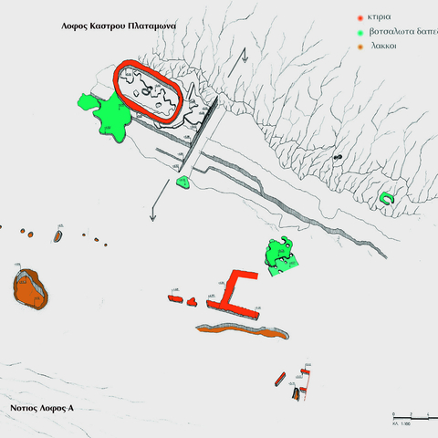 Όπως συμβαίνει στο Αιγαίο αυτή την εποχή, η εγκατάσταση βρισκόταν σε ακρωτήριο, στον λόφο δηλαδή του κάστρου του Πλαταμώνα.[172] Η λέξη «πλαταμών» σηματοδοτεί μία λεία «πέτρα» (λείο βράχο) που περιβάλλεται ή καλύπτεται με νερό, όπως και του λόφου του Κάστρου Πλαταμώνα. Ο βυζαντινός Πλαταμών λοιπόν δεν θα μπορούσε παρά να είναι και ένας αρχαίος πλαταμών. Το Ηράκλειο θα μπορούσε να εκτείνεται και πέραν του συγκεκριμένου λόφου, οπότε ο λόφος του Κάστρου θα ήταν ο πλαταμώνας του.[173]