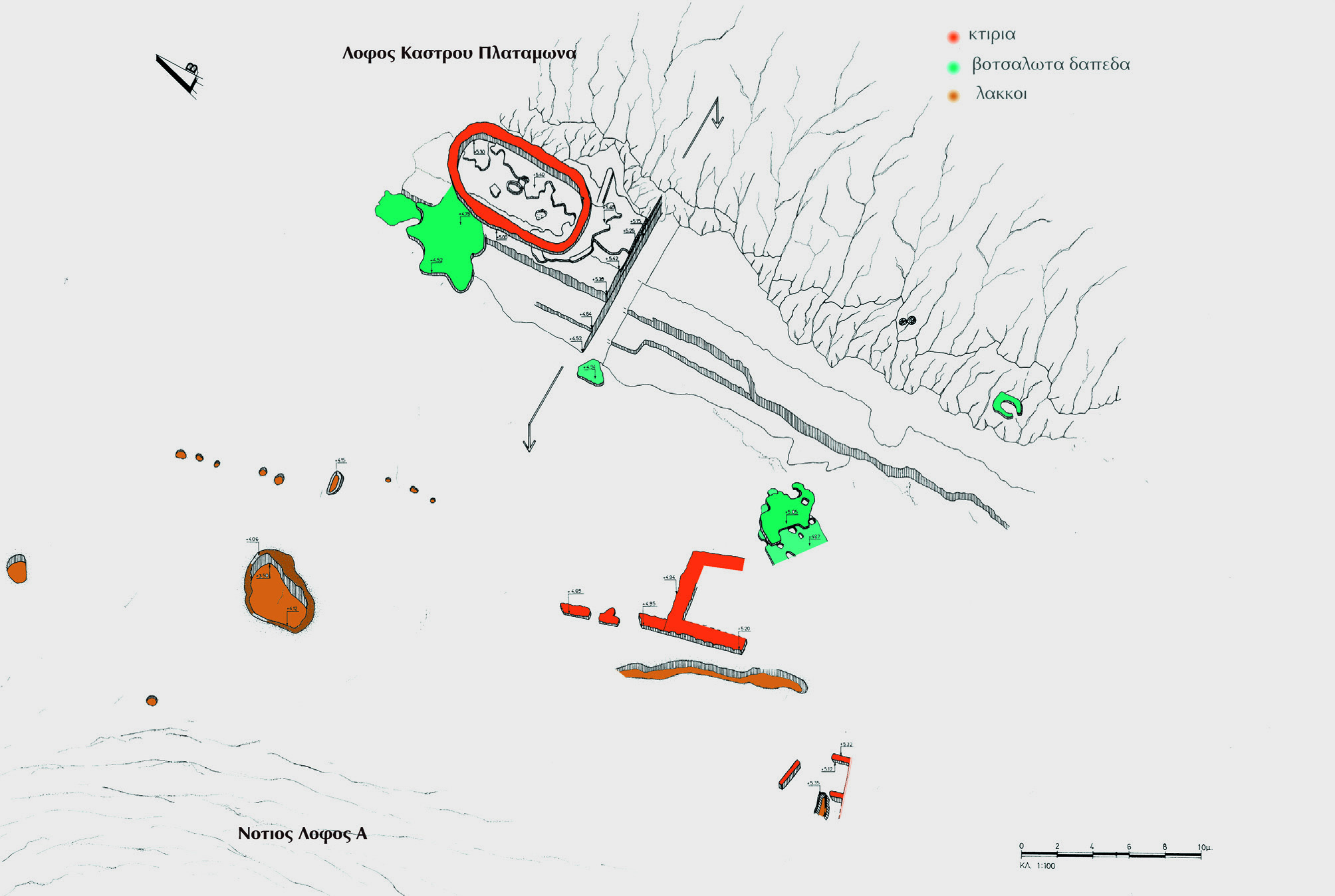 Σήμερα, ο υδροφόρος ορίζοντας πρωτοεμφανίζεται στη στάθμη της Μέσης Χαλκοκρατίας και η Πρώιμη Εποχή Χαλκού καλύπτεται από τα υπόγεια ρεύματα. Η Εποχή του Σιδήρου αποκαλύφθηκε στο μέσον περίπου του βάθους των ανασκαμμένων επιχώσεων (Σχ. 1). Η παλιότερη φάση της εποχής έληξε με την καταστροφή από φωτιά ενός μνημειακού περιβόλου της Ύστερης Εποχής Χαλκού, σε πλαγιά που την εποχή της πρώτης του κατασκευής είχε ακόμη μεγάλη κλίση. Επεμβάσεις της πρώτης αυτής φάσης της Εποχής Σιδήρου εξομάλυναν τις κλίσεις με την κατασκευή λίθινων ανδήρων στον περίβολο, δίνοντας τη δυνατότητα κάποιων δραστηριοτήτων που άφησαν αδιάγνωστα υπολείμματα τοίχων, λιθόστρωτα, διάσπαρτα πλιθιά και προϊόντα εκκαμίνευσης. Η κεραμική έδωσε ευρεία χρονολόγηση από την Ύστερη Εποχή Χαλκού μέχρι τον 8ο αιώνα, αλλά με την κύρια εγκατάσταση εκτός ανασκαφικής τομής και αδιάγνωστη.