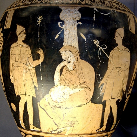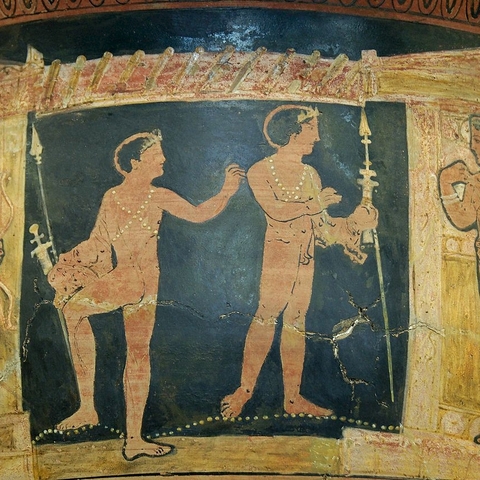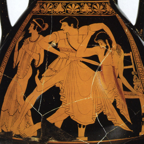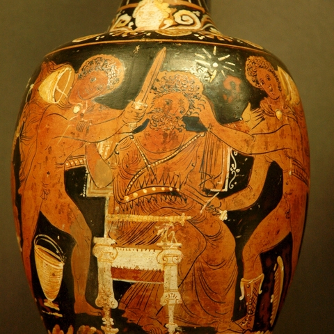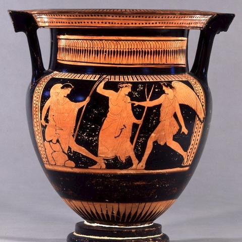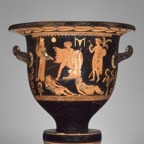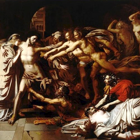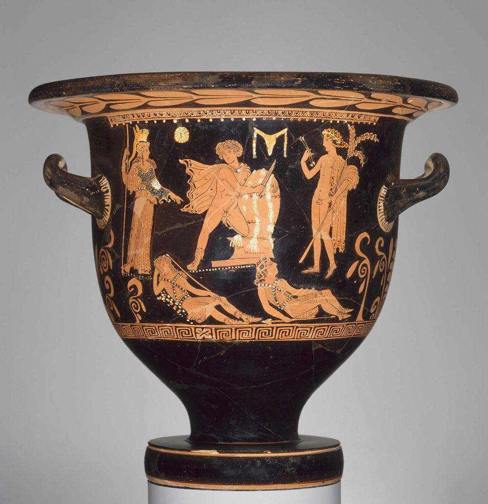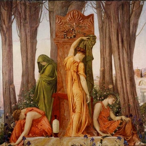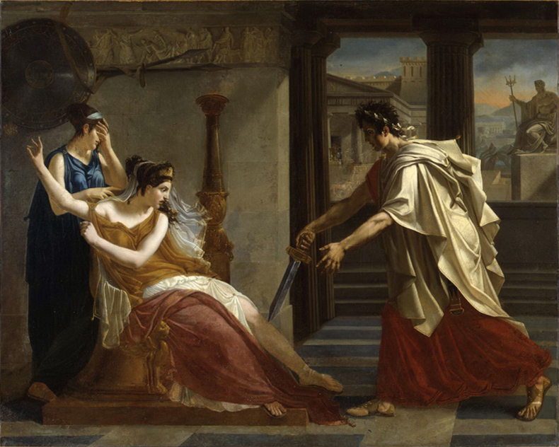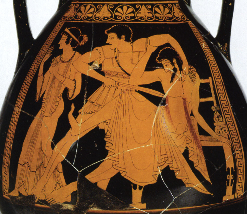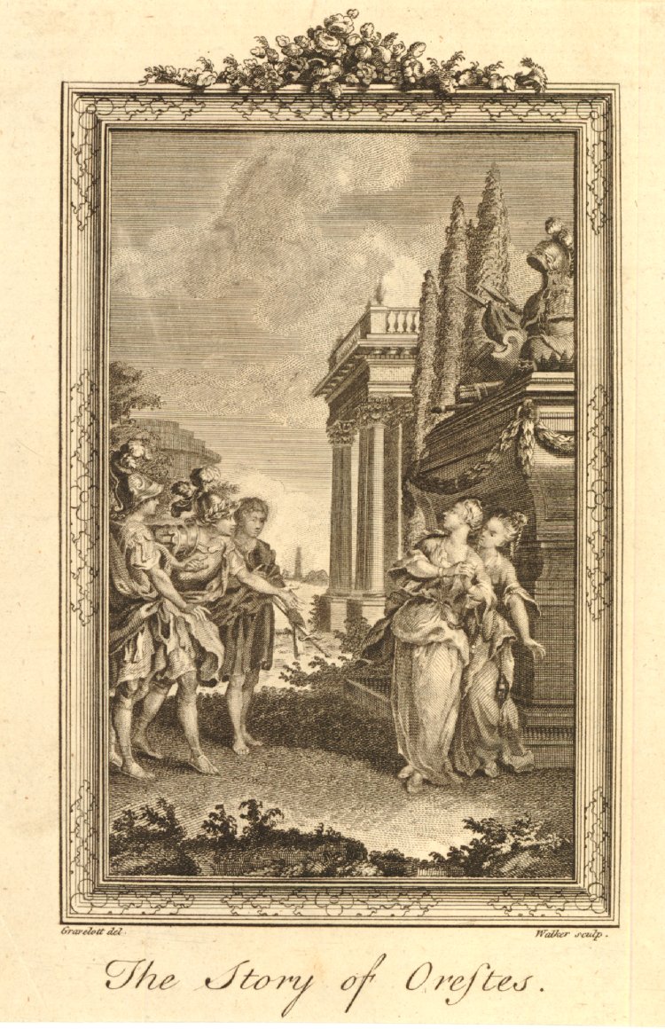 Σύμφωνα με την ευριπίδεια εκδοχή, ο Ορέστης σκότωσε τον Αίγισθο την ώρα που πρόσφερε θυσία στις Νύμφες στον κήπο του. Οι φύλακες του βασιλιά διστάζουν να επιτεθούν στον δολοφόνο Ορέστη, τον γιο του Αγαμέμνονα.