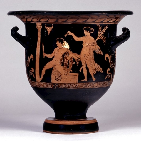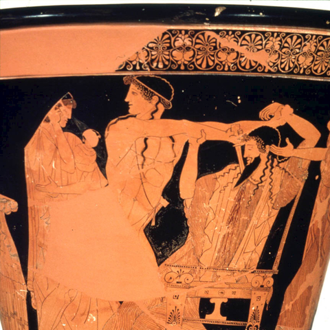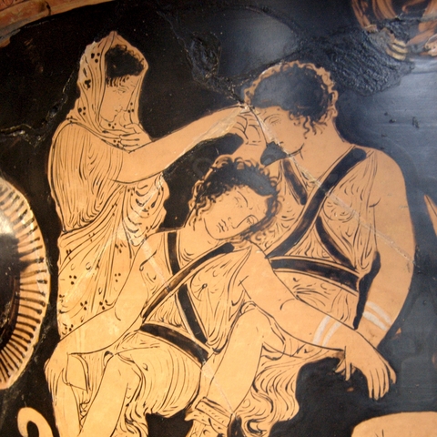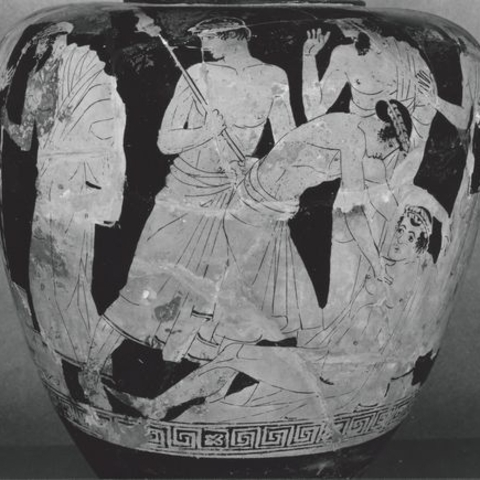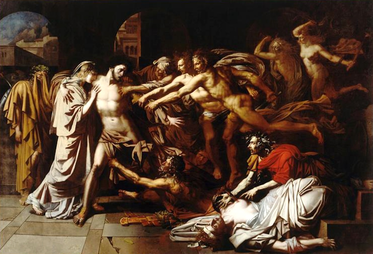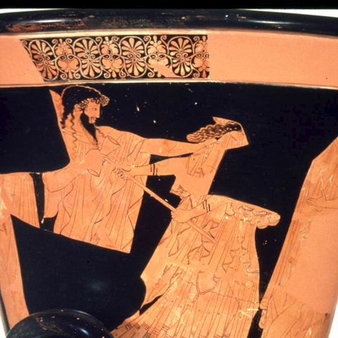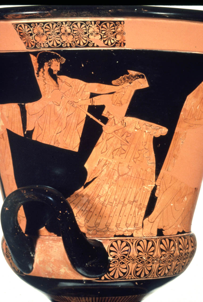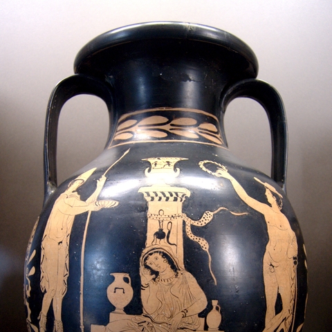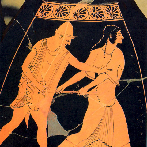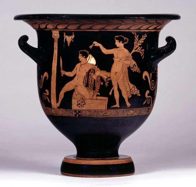 Σύμφωνα με την ευριπίδεια εκδοχή, ο Ορέστης σκότωσε τον Αίγισθο την ώρα που πρόσφερε θυσία στις Νύμφες στον κήπο του. Οι φύλακες του βασιλιά διστάζουν να επιτεθούν στον δολοφόνο Ορέστη, τον γιο του Αγαμέμνονα.