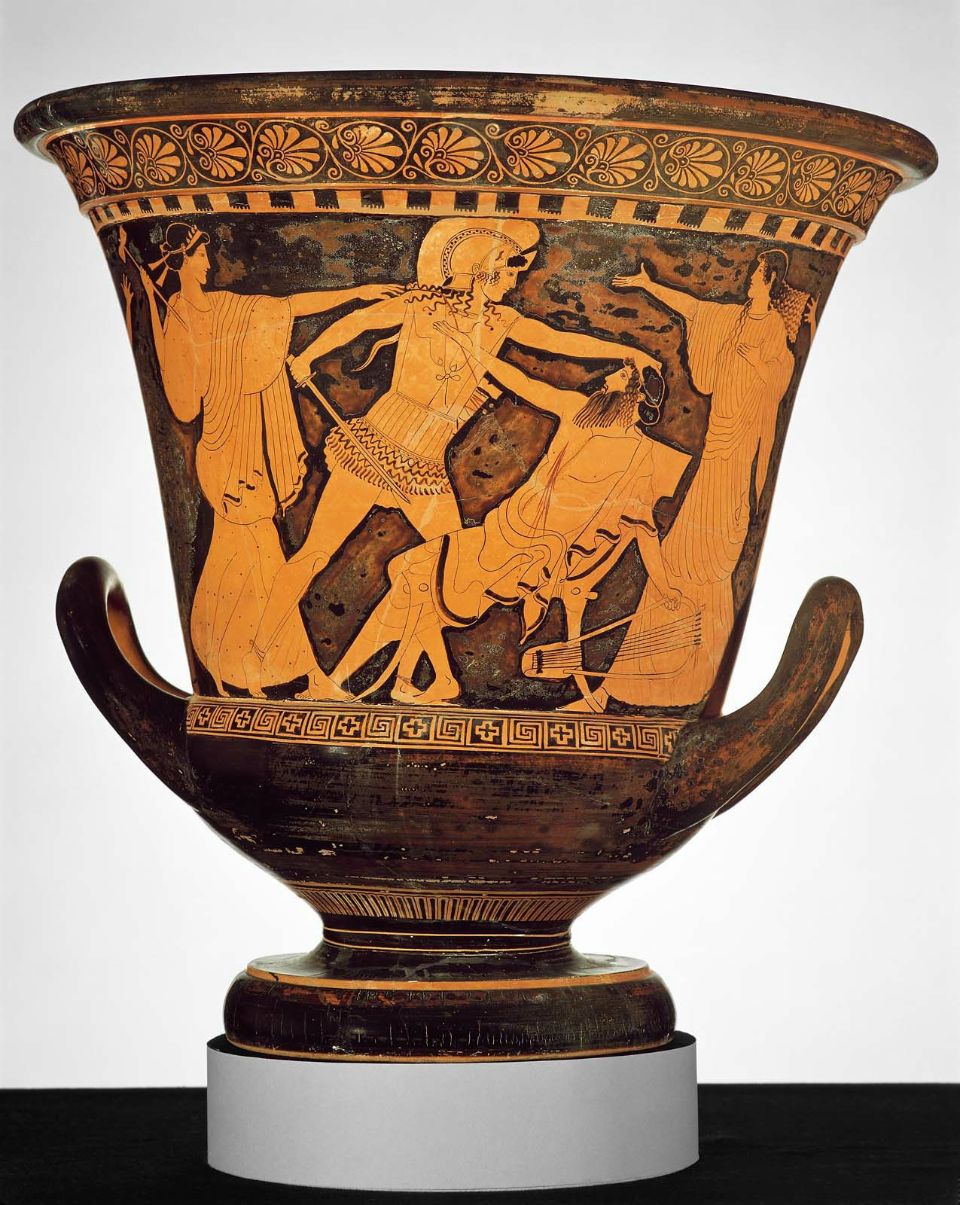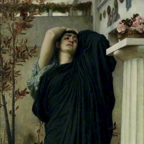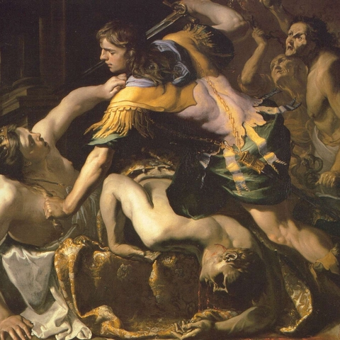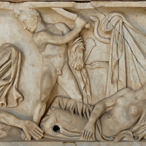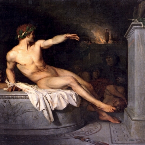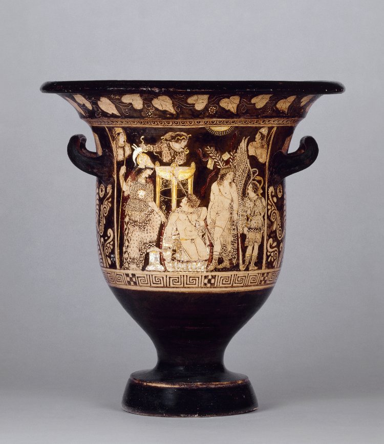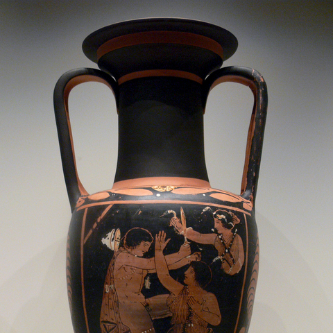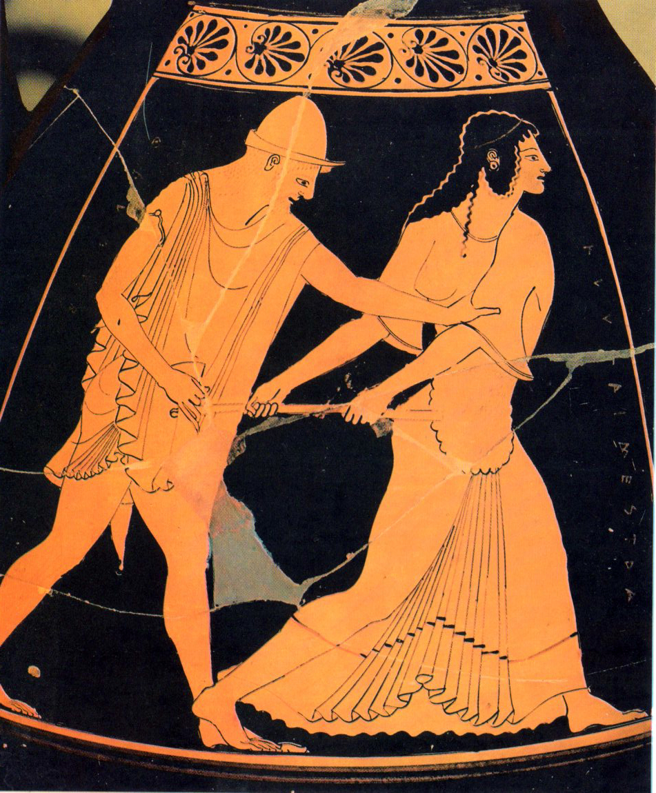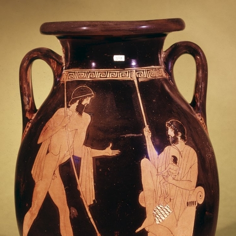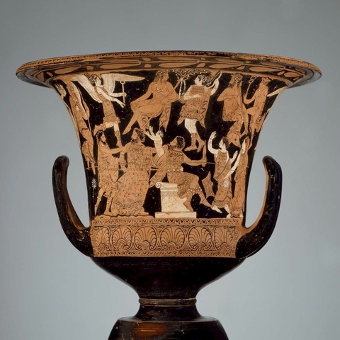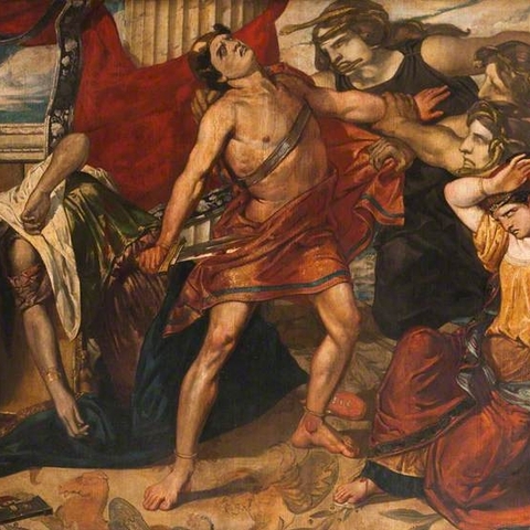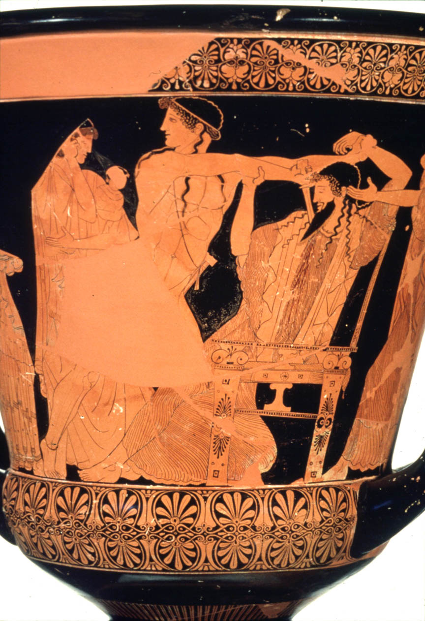 Σύμφωνα με την ευριπίδεια εκδοχή, ο Ορέστης σκότωσε τον Αίγισθο την ώρα που πρόσφερε θυσία στις Νύμφες στον κήπο του. Οι φύλακες του βασιλιά διστάζουν να επιτεθούν στον δολοφόνο Ορέστη, τον γιο του Αγαμέμνονα.