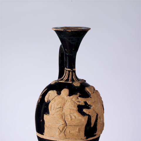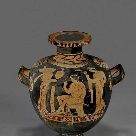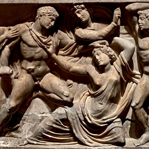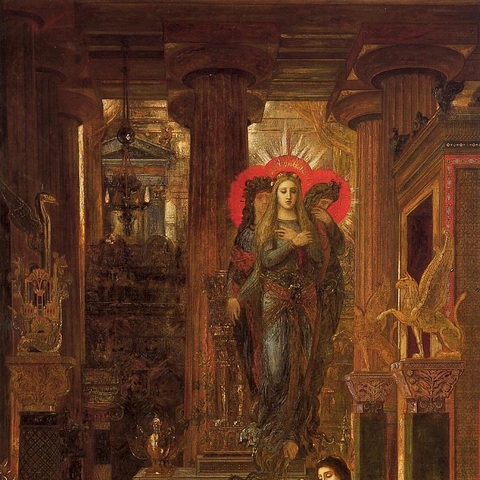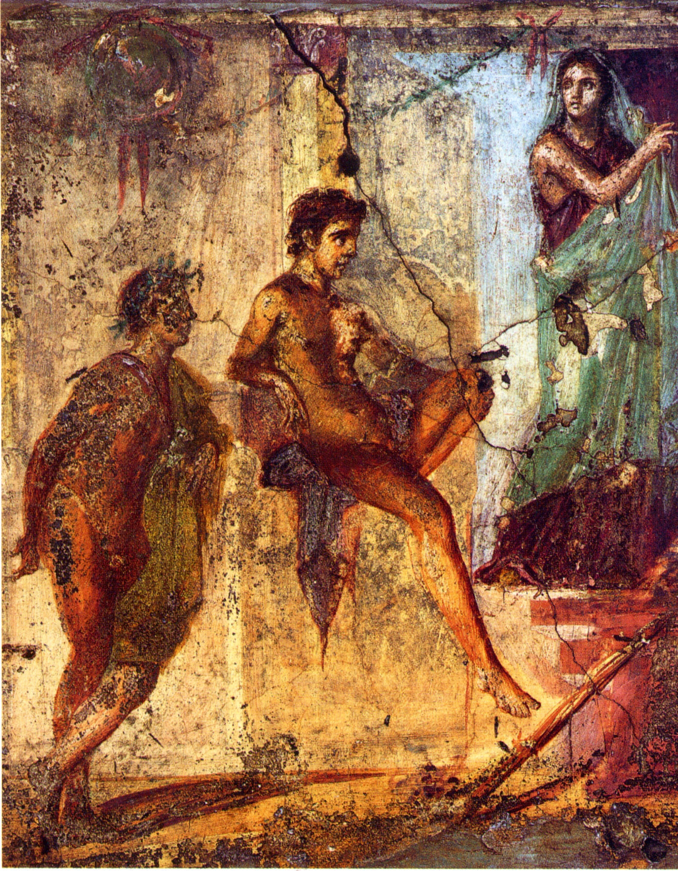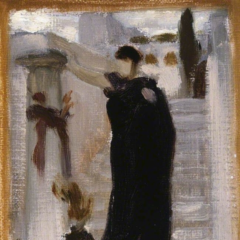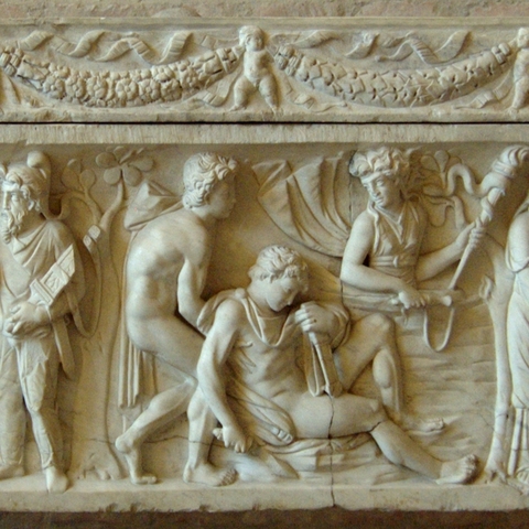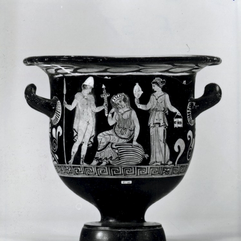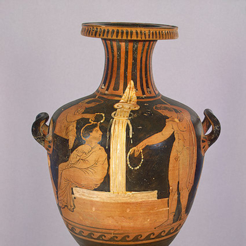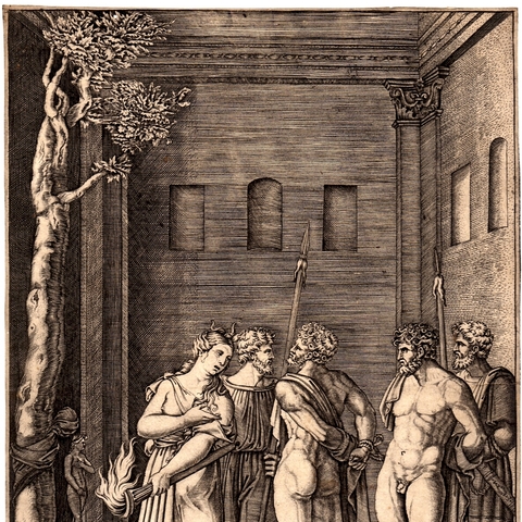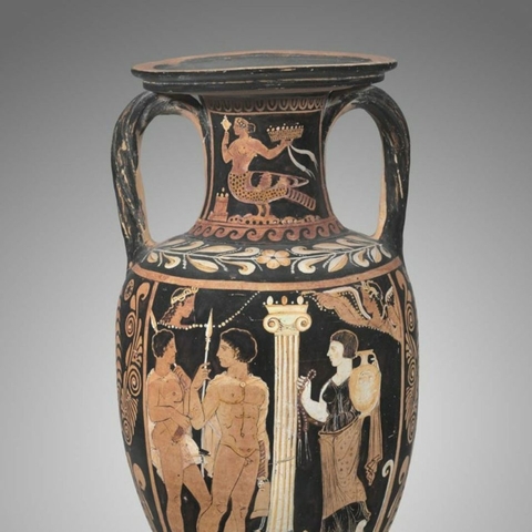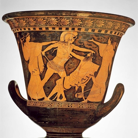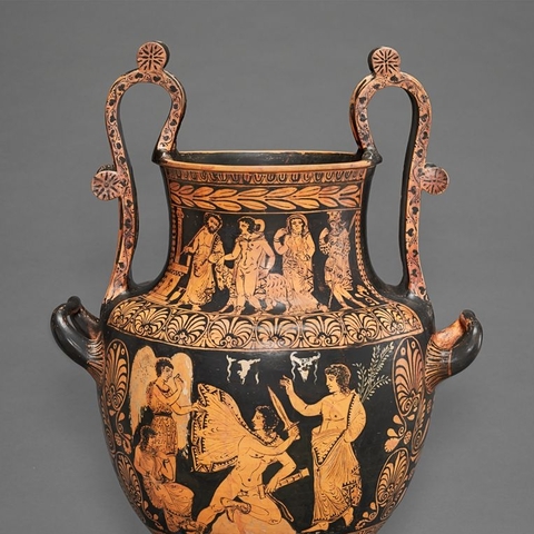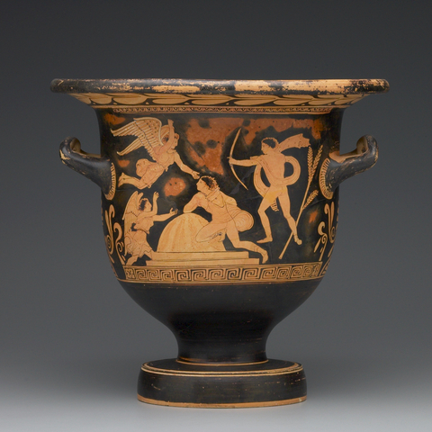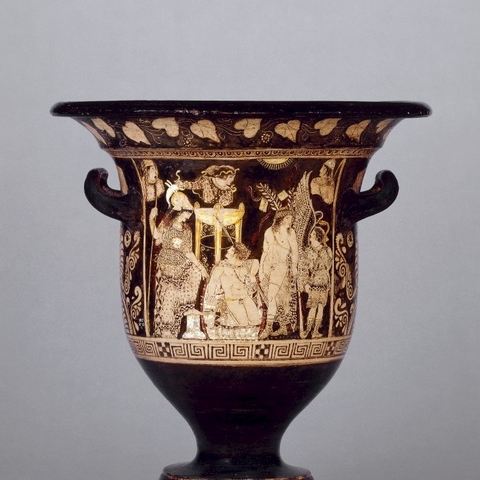 Σύμφωνα με την ευριπίδεια εκδοχή, ο Ορέστης σκότωσε τον Αίγισθο την ώρα που πρόσφερε θυσία στις Νύμφες στον κήπο του. Οι φύλακες του βασιλιά διστάζουν να επιτεθούν στον δολοφόνο Ορέστη, τον γιο του Αγαμέμνονα.