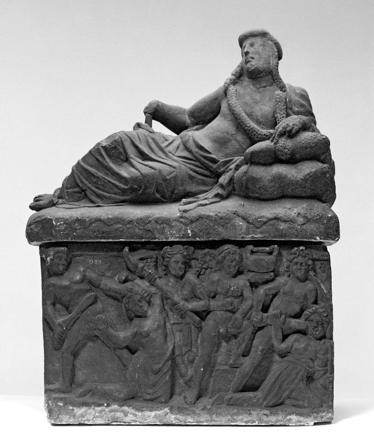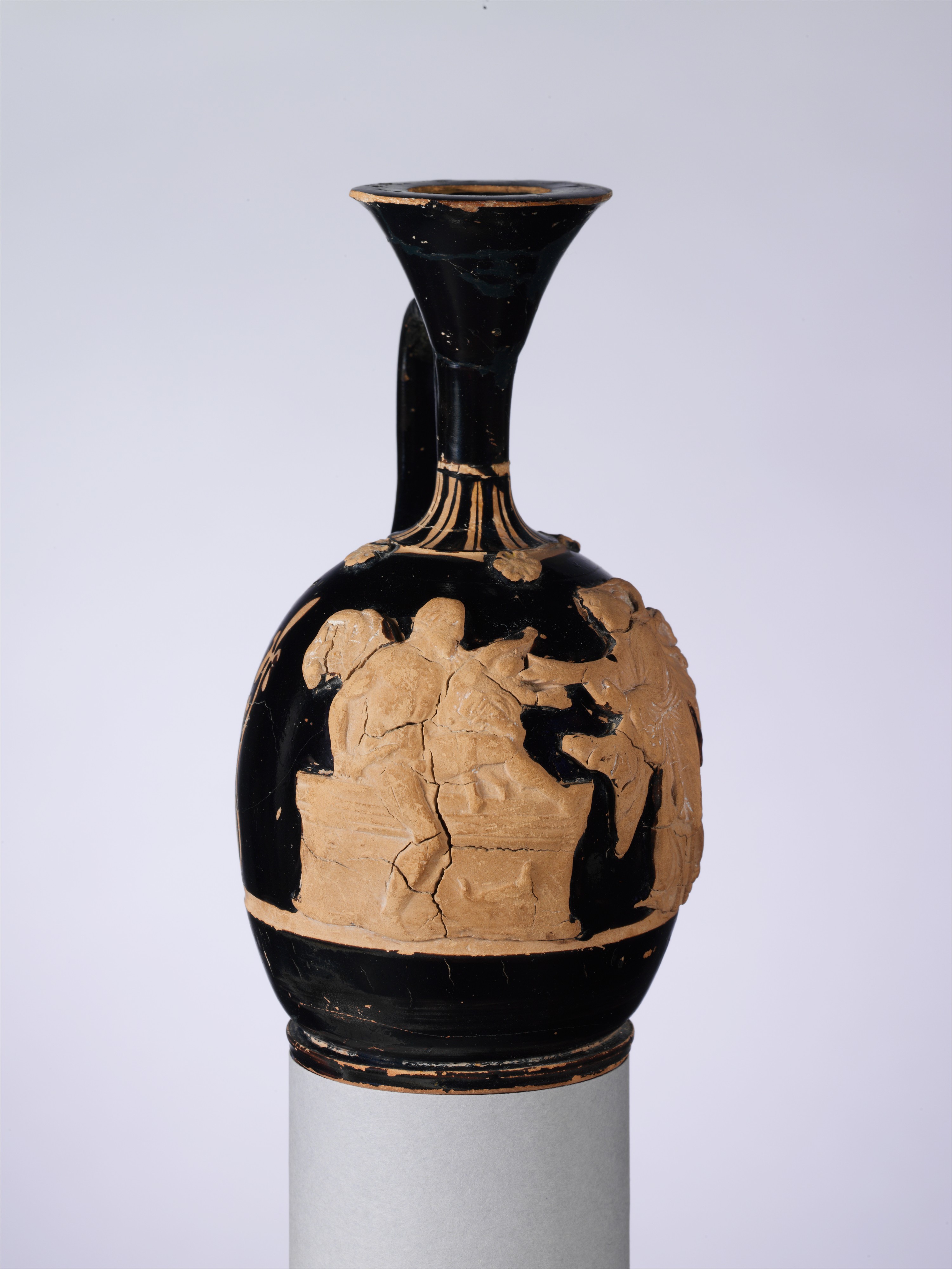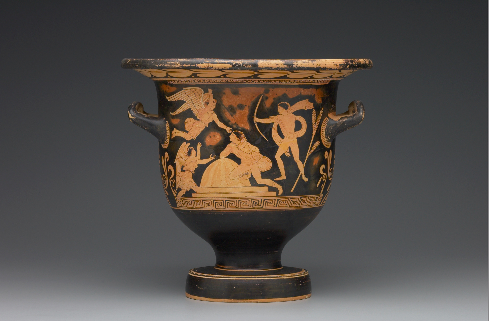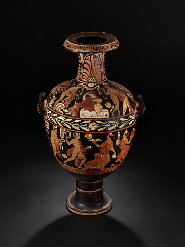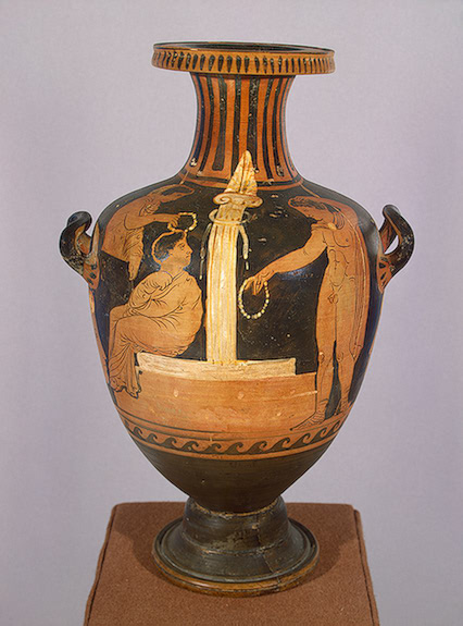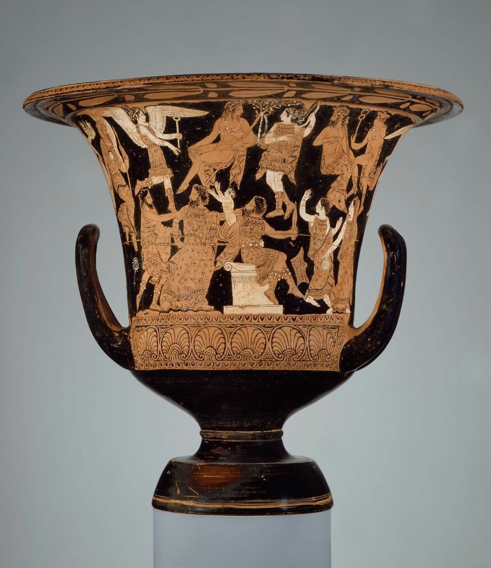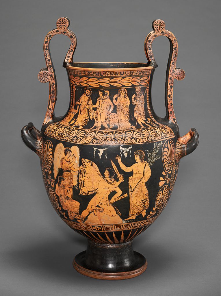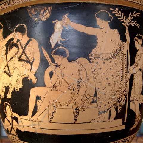 Η ίδια η Κλυταιμνήστρα [ Εικ. 189], το φάντασμά της, προσπαθεί να αφυπνίσει τις Ερινύες που, καθώς ο Ορέστης προσπέφτει ικέτης στον ομφαλό, αποκοιμιούνται, και να καταδιώξουν τον δολοφόνο γιο της. Ο ίδιος ο Απόλλωνας θα σφάξει ένα γουρουνάκι και με το αίμα του νεοσφαγμένου ζώου θα περιλούσει τον Ορέστη, πιθανόν σε μια σκηνή αναπαράστασης του φόνου μέσω της οποίας επέρχεται η παραδοχή της πράξης. Στη συνέχεια, το αίμα θα ξεπλυθεί με νερό της πηγής σε ένα πραγματικό αλλά και συμβολικό λουτρό απαλλαγής από τους πραγματικούς ρύπους αλλά και τους ρύπους της ενοχής που τρέλαιναν τον Ορέστη: