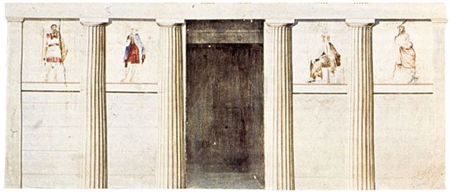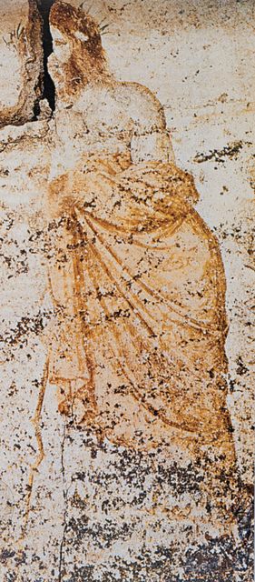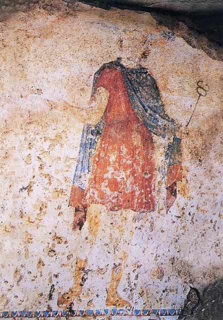 Στον τάφο της κρίσεως στη Μίεζα (τελευταίο τέταρτο του 4ου αι. π.Χ.), (Εικ. 159) αριστερά και δεξιά της εισόδου του τάφου στέκονται τέσσερις μεμονωμένες μορφές (Εικ. 160, 161), που όμως αποτελούν τμήματα ενιαίας σύνθεσης που διακόπτονται από την παρεμβολή των ημικιόνων και του ανοίγματος του τάφου. Το θέμα της απεικόνισης είναι η κάθοδος του νεκρού στον Άδη με τη συνοδεία του Ερμή (Εικ. 162). Οι κριτές Ραδάμανθυς (Εικ. 163) και Αιακός θα αποφασίσουν για την τύχη του νεκρού, αν δηλαδή θα σταλεί στο νησί των Μακάρων ή στα Τάρταρα. Ο Αιακός, γιος του Δία και της νύμφης Αίγινας, κρίνει όσους προέρχονται από την Ευρώπη, ο Ραδάμανθυς, καρπός του Δία και της Ευρώπης, όσους έρχονται από την Ασία, ενώ στη διαιτησία του Μίνωα καταλήγουν οι δύσκολες κρίσεις (Πλ., Γοργίας 523e-524a). Εδώ κύριος κριτής του νεκρού είναι ο Αιακός.
