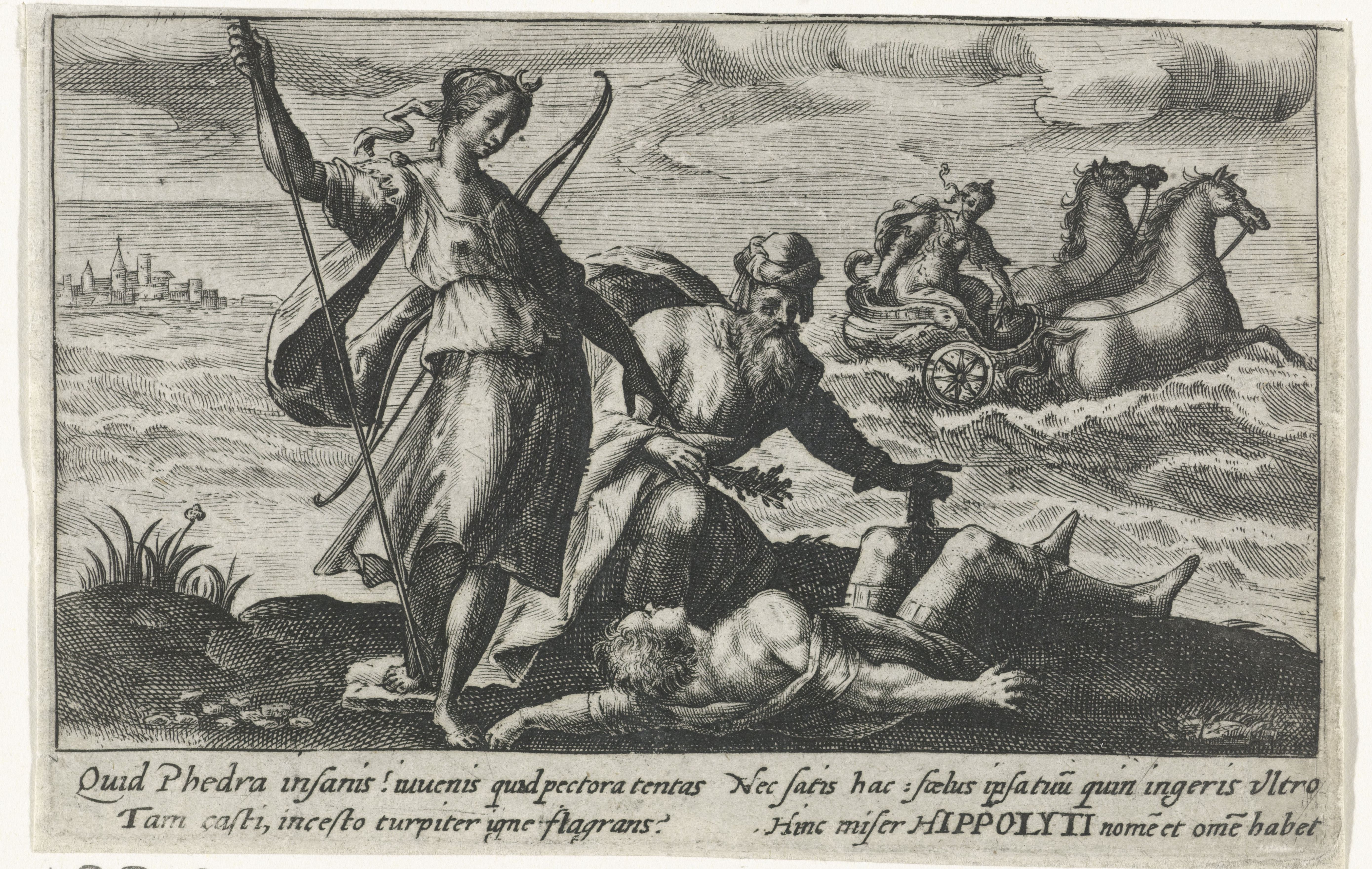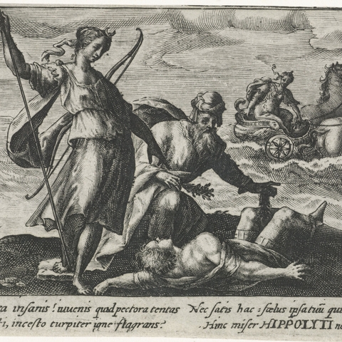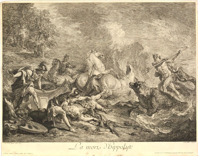 Ξαναείδε τον Ιππόλυτο στην Αθήνα, όταν ο νέος ήρθε για να πάρει μέρος στα Παναθήναια. Μη αντέχοντας η νέα γυναίκα, έστειλε στον προγονό της ένα γράμμα, όπου του εξομολογούνταν τα αισθήματά της. (Εικ. 278) Ο Ιππόλυτος την απέκρουσε, όπως και κάθε άλλη γυναίκα, πόσο μάλλον που αυτή ήταν και η σύζυγος του πατέρα του. Η Φαίδρα, από φόβο μήπως ο Ιππόλυτος φανερώσει το μυστικό της στον πατέρα του Θησέα, τον κατηγόρησε ότι προσπάθησε να τη βιάσει, ο Θησέας την πίστεψε και ζήτησε από τον Ποσειδώνα να σκοτώσει τον Ιππόλυτο. Όταν η Φαίδρα έμαθε για τον θάνατο του Ιππόλυτου, κυριευμένη από ενοχές και απελπισία, κρεμάστηκε. Σύμφωνα με άλλη εκδοχή, η Φαίδρα κρεμάστηκε, όμως άφησε στον Θησέα ένα γράμμα με το οποίο ενοχοποιούσε τον Ιππόλυτο για ανήθικες προτάσεις απέναντί της. Ο Θησέας, γυρνώντας από ταξίδι, βρήκε τη γυναίκα του νεκρή και το γράμμα. Καταράστηκε τον γιο του ζητώντας από τον θεϊκό πατέρα του Ποσειδώνα να εκπληρώσει μία από τις τρεις ευχές που του είχε υποσχεθεί και εξόρισε τον γιο του. Στον δρόμο του προς την Πελοπόννησο, ένας ταύρος βγήκε από τη θάλασσα, τα άλογα τρόμαξαν, αφήνιασαν, έκοψαν τα λουριά που τα συνέδεαν με το άρμα, ο Ιππόλυτος τυλίχτηκε με αυτά και σκοτώθηκε πάνω στις πέτρες όπου τον έσυραν τα άλογα. (Εικ. 279, 280, 281, 282, 283, 284, 285, 286, 287, 288, 289, 290, 291, 292, 293, 294, 295, 296, 297, 298, 299, 300, 301, 302, 303, 304, 305, 306, 307, 308, 309, 310, 311, 312)