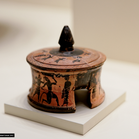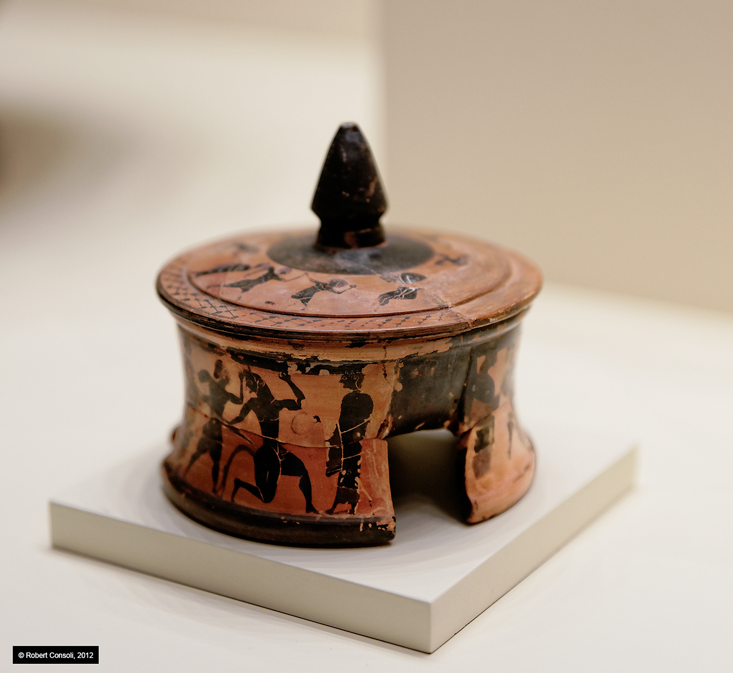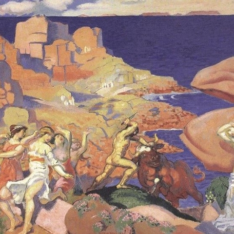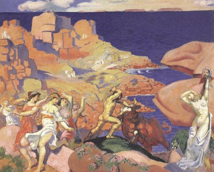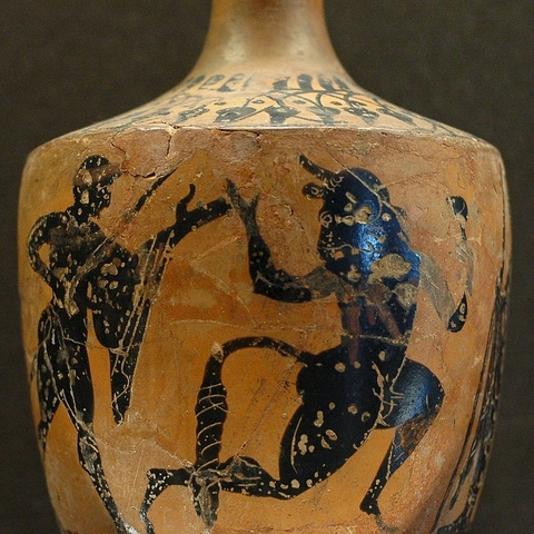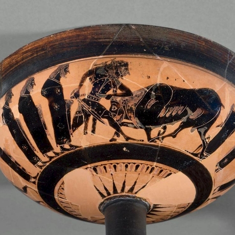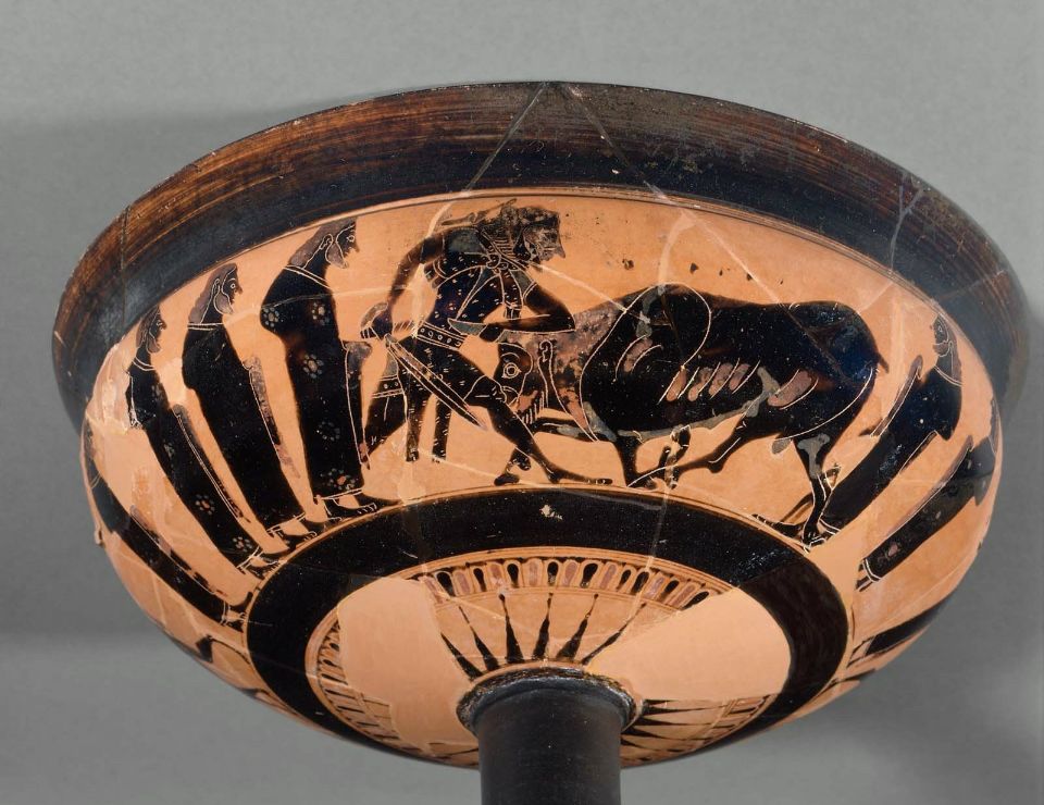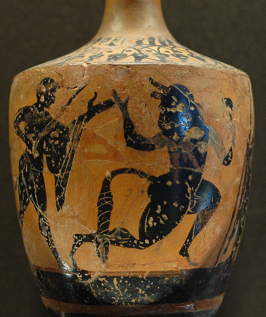 Γ) Γνωρίζουμε επίσης ότι οι νέοι, παίρνοντας μέρος σε διαβατήριες τελετές ενηλικίωσης, είναι πιθανό ότι χρησιμοποιούσαν προσωπεία ταύρου ή ότι αγωνίζονταν εναντίον κάποιου που φορούσε προσωπείο ταύρου. Για παράδειγμα, στο Καβείριο των Θηβών, σε θραύσμα σκύφου (Εθνικό Αρχαιολογικό Μουσείο Αθηνών, αρ. 548) παριστάνεται ένας γυμνός άνδρας να φορά προσωπείο ταύρου, προφανώς συμμετέχοντας σε τελετουργικά δρώμενα και συνοδευόμενος από δύο άλλες γυμνές ανδρικές φιγούρες σε ιθυφαλλική κατάσταση. Δύο ερωτήματα προκύπτουν εδώ: α) Ποιος είναι ο συμβολισμός του ταύρου; β) Τι επιδιωκόταν με τη χρήση του προσωπείου;