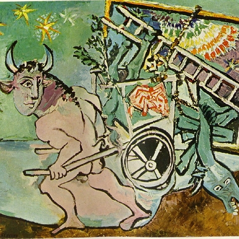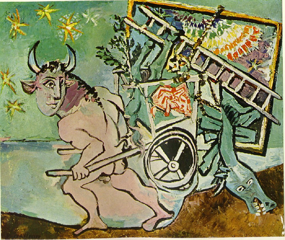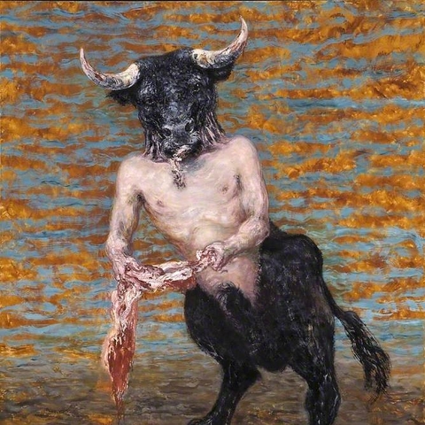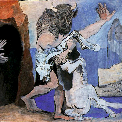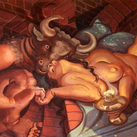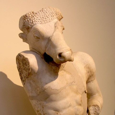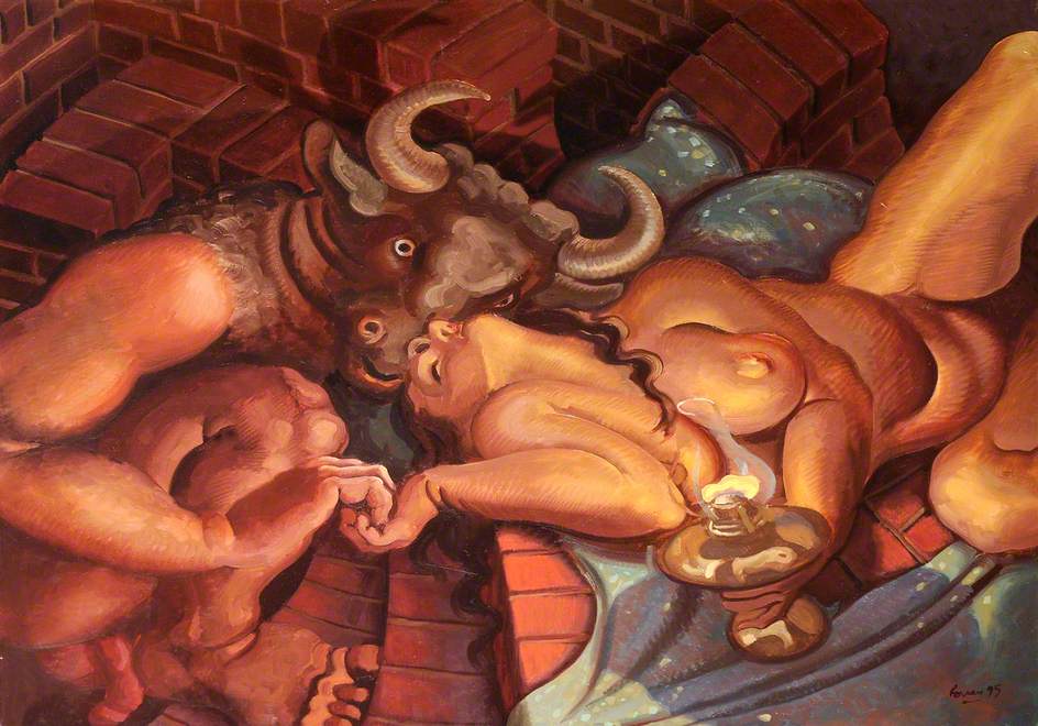 Η Πασιφάη, σύζυγος του Μίνωα, ερωτεύτηκε τον ταύρο του Ποσειδώνα που ο βασιλιάς δεν θυσίασε στον θεό, όπως είχε υποσχεθεί, επειδή ήταν πολύ όμορφος. Ο Δαίδαλος, προκειμένου η βασίλισσα να ενωθεί με τον ταύρο, κατασκεύασε ομοίωμα αγελάδας, μέσα στο οποίο μπήκε η Πασιφάη. (Εικ. 88, 89, 90, 91, 92, 93, 94, 95, 96, 97, 98, 99, 100, 101) Το παιδί που γεννήθηκε,