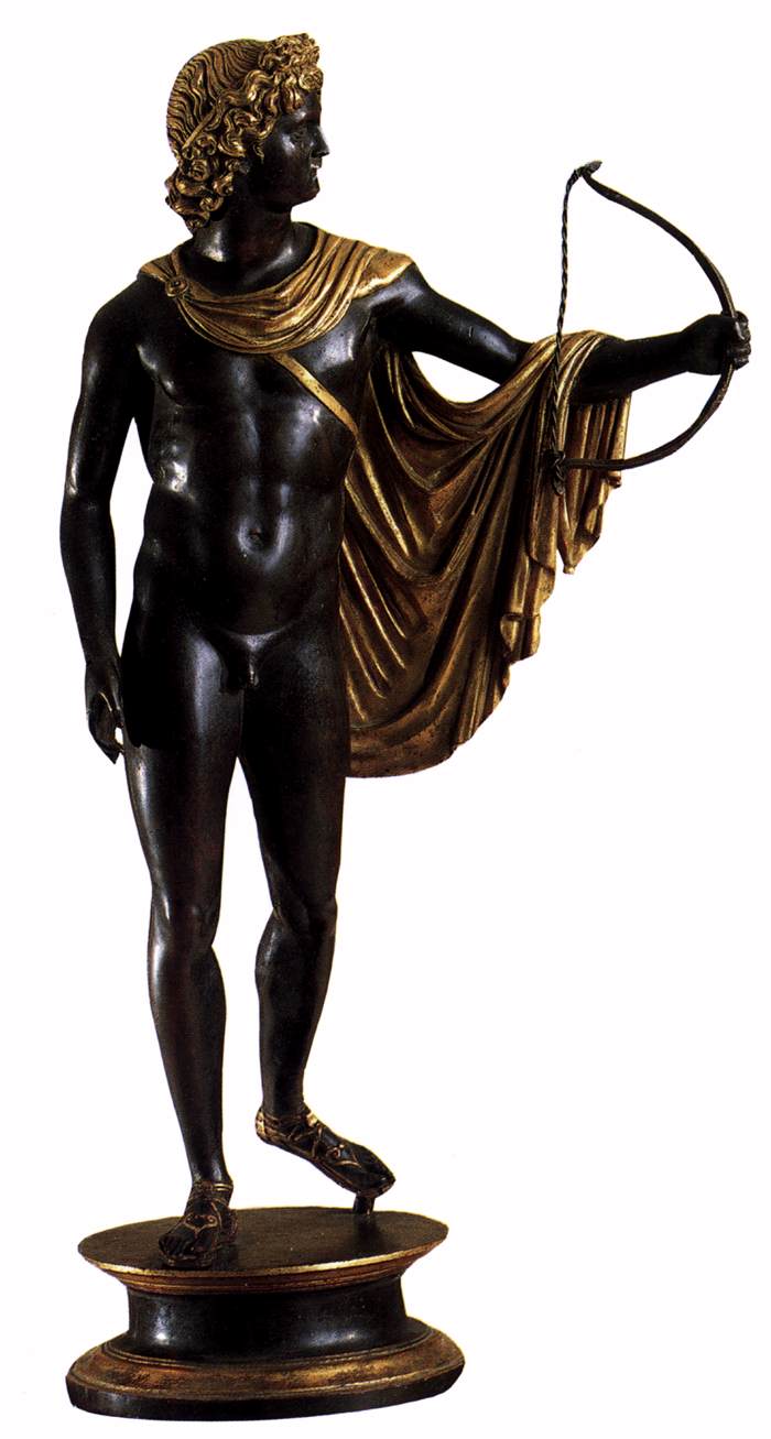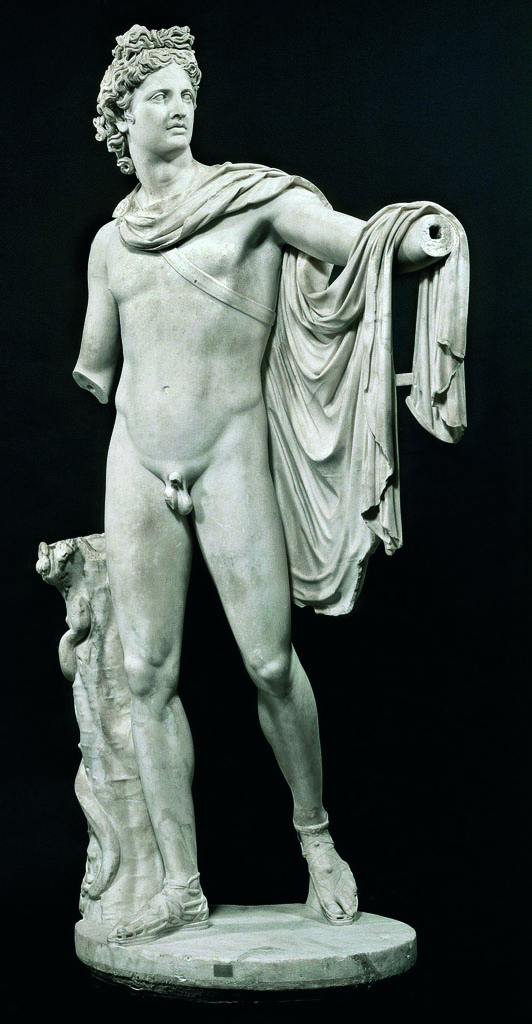 Ο θεός παριστάνεται συνήθως να κρατά λύρα ή κιθάρα (Εικ. 8, 10, 12, 13, 14, 23, 33, 39, 40, 41, 49, 55, 107, 108, 109, 110, 111, 112, 113, 114, 115, 116, 117, 118, 119, 120, 121, 122, 123, 124, 125, 126, 127, 128, 129, 131, 133, 134, 135, 137, 138, 139, 142, 143, 144, 147, 148, 150, 154, 156, 158, 159, 160, 162, 163, 165, 166, 175, 244, 247, 252, 278), τόξο (Εικ. 21, 22, 34, 45, 47, 52, 53, 61, 62, 66, 78, 79, 80, 81, 83, 85, 86, 87, 88, 89, 90, 91, 92, 93, 94, 95, 96, 97, 98, 99, 100, 103, 104, 105, 106, 177, 178, 181, 182, 183, 184, 212, 213, 228, 229, 230, 232, 236, 241, 254, 255, 256, 258, 259, 261, 269), να είναι δαφνοστεφανωμένος ή να κρατά δάφνη, (Εικ. 9, 36, 47, 49, 51, 52, 53, 235, 239) να βρίσκεται κοντά σε τρίποδα (Εικ. 12, 38, 48, 213) ή στον ομφαλό των Δελφών (Εικ. 13, 302).