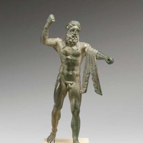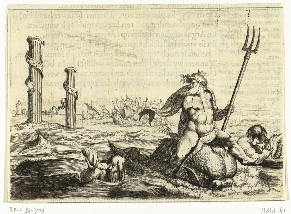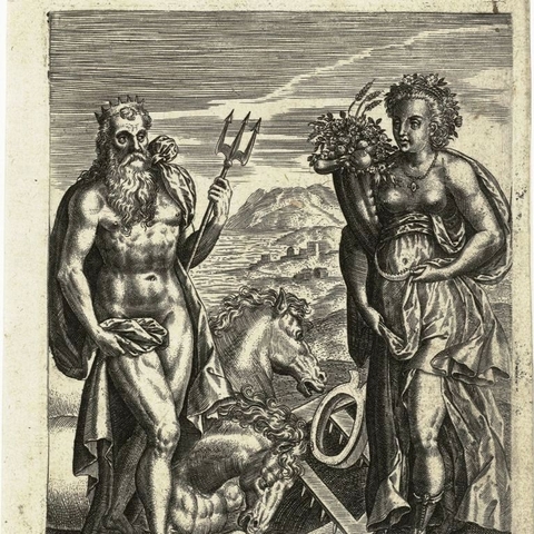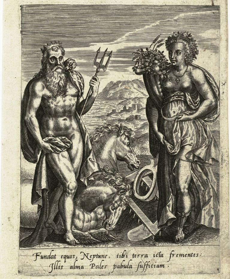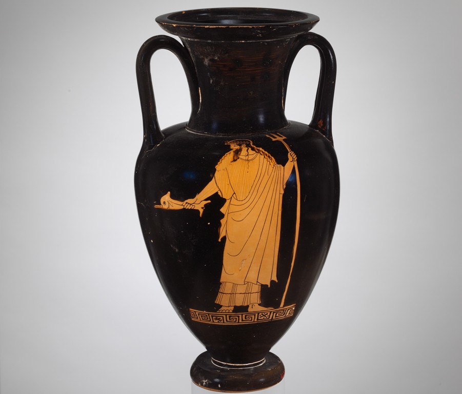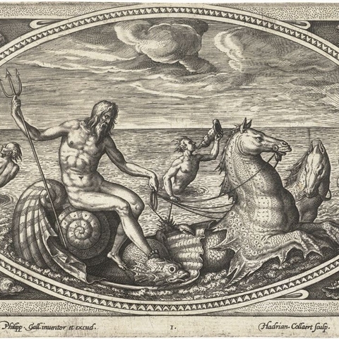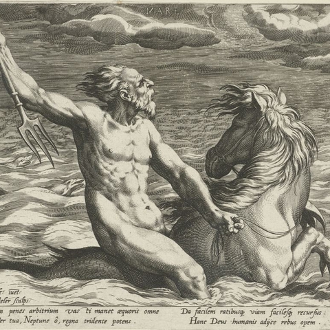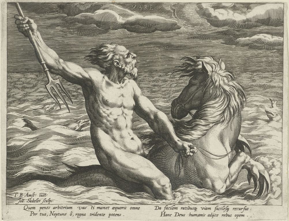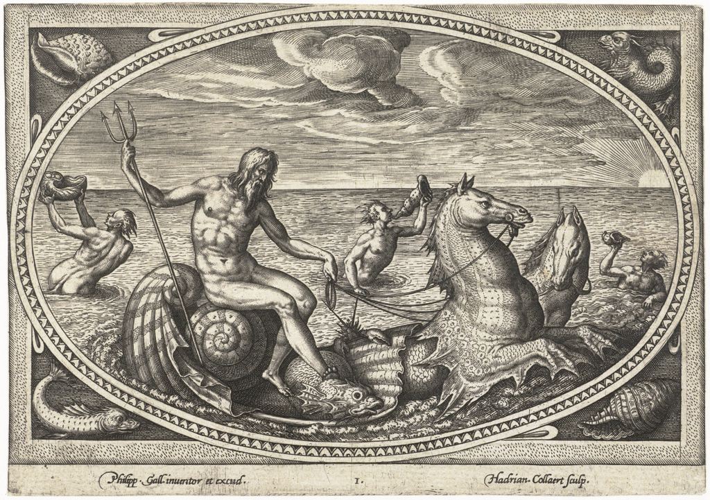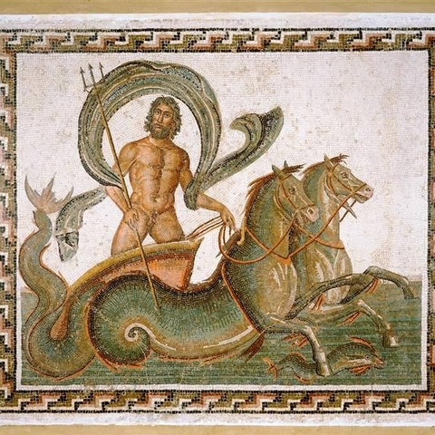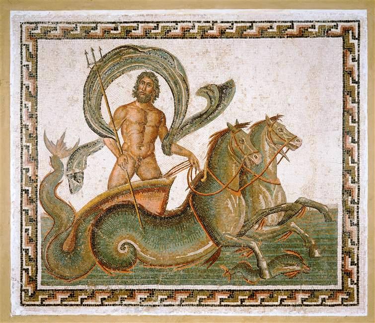 Σύμφωνα με τον Όμηρο, όταν τα τρία αδέλφια μεγάλωσαν, μοιράστηκαν με κλήρο την κυριαρχία του κόσμου· έτσι, κύριος του ουρανού έγινε ο Δίας, του Κάτω Κόσμου ο Πλούτωνας, της θάλασσας ο Ποσειδώνας (Ιλ., Ο 187-190). Μέσω του έπους, λοιπόν, ο Ποσειδώνας καθιερώθηκε ως θεός της θάλασσας, ήταν, επομένως, αγαπητός στους Έλληνες των θαλασσών, μαζί με τη σύζυγό του Αμφιτρίτη (Αρρ., Κυνηγ., 35.2, Αρρ., Ινδ. 18.11). Ως προστάτης των ναυτικών και των αλιέων απεικονιζόταν, πάντα αυστηρός και γενειοφόρος, με τα αντίστοιχα σύμβολα, το ψάρι και την τρίαινα, όπλο των ψαράδων του τόνου, ανεβασμένος σε άρμα που το έσερναν μειξογενή τερατώδη ζώα, μισό άλογα, μισό φίδια. Το άρμα του περιστοιχιζόταν από ψάρια, δελφίνια, άλλα θαλάσσια όντα, Νηρηίδες, άλλες θεότητες των αλμυρών υδάτων, όπως ο Γλαύκος και ο Πρωτέας. Λόγω της θαλάσσιας υπόστασής του διέθετε σημαντικά ιερά σε παράκτιες περιοχές, όπως η Ισθμία και το Σούνιο (εξ ου και τα επίθετα Πελάγιος και Πελαγαίος). (Εικ. 1, 2, 3, 4, 5, 6, 7, 8, 9, 10, 11, 12, 13, 14, 15, 16, 17, 18, 19, 20, 21, 22, 23, 24, 25, 26, 27, 28, 29, 30, 31, 32, 33, 34, 35, 36, 37)