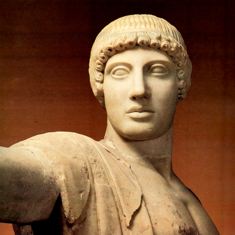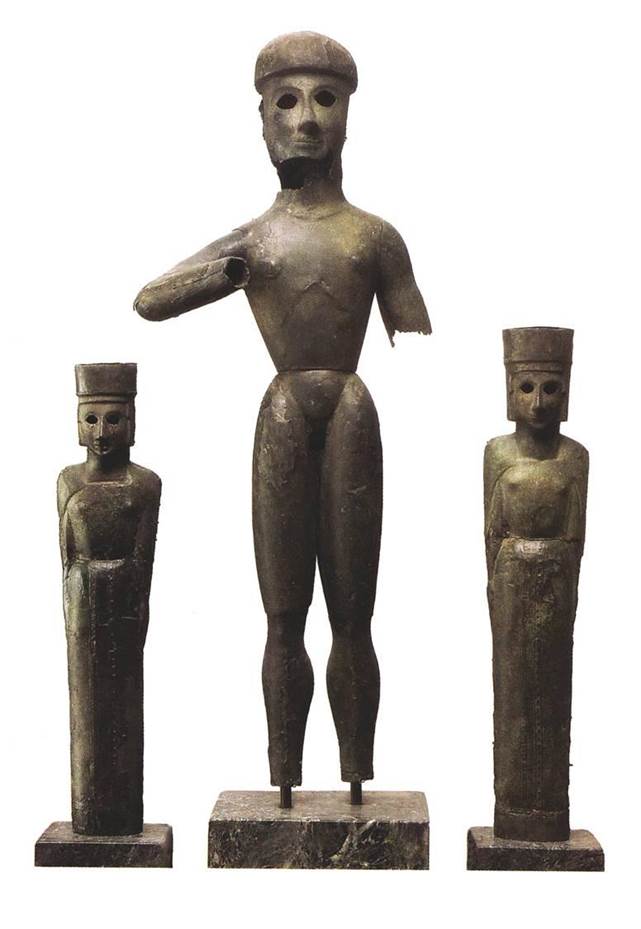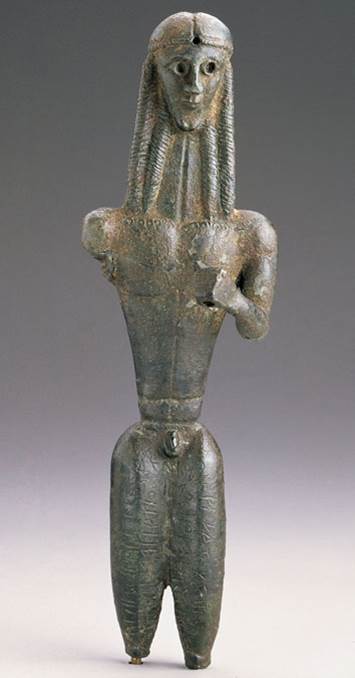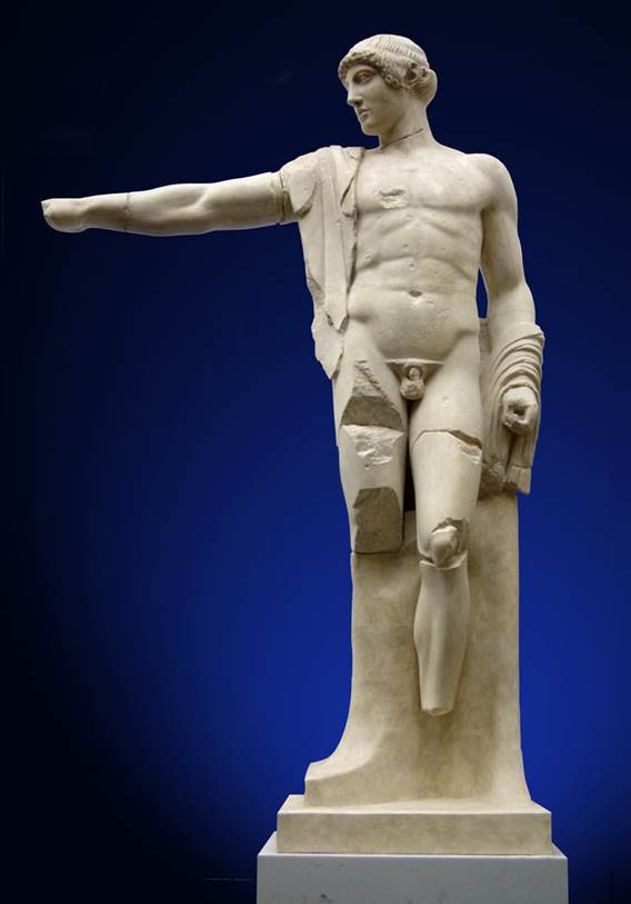 Περισσότερο με την ιδιότητα του πολεμικού θεού παρά ως θεός του μέτρου και της αρμονίας, της έλλογης σκέψης και της μαντικής ικανότητας, παριστάνεται ο Απόλλωνας σε χάλκινο αγαλμάτιο του 7ου αι. π.Χ. (Εικ. 45, 46) Αν μάλιστα συμπληρώσουμε ένα ασημένιο τόξο στο αριστερό του χέρι, ασημένιο κράνος στο κεφάλι, ασημένιους βολβούς στα μάτια, τότε έχουμε τον «αργυρότοξο» Απόλλωνα των ομηρικών επών, τον θεό τιμωρό που χτυπά και σκοτώνει, είτε με τα βέλη του τις Νιοβίδες σε ερυθρόμορφο αγγείο του 5ου αι. π.Χ. (Εικ. 48) είτε με λοιμό την πόλη των Θηβών που άφησε ατιμώρητο τον δολοφόνο του Λάιου (Σοφ., Οιδ. Τ.). Ως τιμωρός για παραβίαση των νόμων της φιλοξενίας από τους Κένταυρους εμφανίζεται και στο δυτικό αέτωμα του ναού του Δία στην Ολυμπία, σύμφωνα όμως με τις αξίες και τα ιδανικά της εποχής που τον δημιούργησε, περισσότερο πνευματοποιημένος, με ανάμειξη στη μάχη περισσότερο νοητική και βουλητική παρά αυτοπρόσωπα ενεργητική. (Εικ. 49, 50, 51, 52)