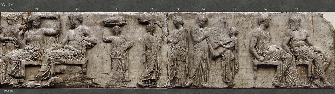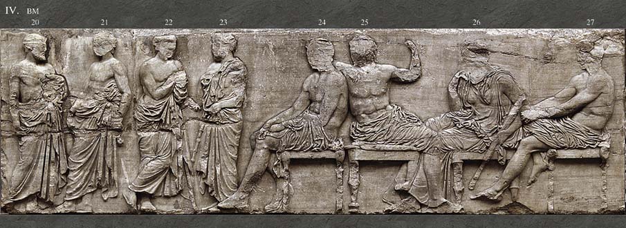 Στη ζωφόρο του Παρθενώνα οι θεοί εμφανίζονται σε ομάδες, κάτι που αποσαφηνίζει και την ταυτότητά τους. Όλοι είναι καθισμένοι σε δίφρους εκτός από τον Δία, που είναι ένθρονος, και την Ίριδα, την θεά που μεταφέρει τα μηνύματα, που στέκεται όρθια. Οι πρώτοι που παρακολουθούν την προσέλευση της πομπής των Παναθηναίων είναι τα αδέλφια Ερμής και Διόνυσος που γέρνει νωχελικά στη ράχη του αδελφού του· δίπλα η μητροπρεπής Δήμητρα στηρίζει το πηγούνι στο υψωμένο χέρι της· ακολουθεί ο νευρικός Άρης. (Εικ. 28) Ακολουθεί η όρθια Ίρις που τακτοποιεί τα μαλλιά της και μετά το ζεύγος Δίας - Ήρα. (Εικ. 29). Η Ήρα, σε μια χαρακτηριστική κίνηση ανάμεσα στα ζευγάρια, αποκαλύπτει στον ένθρονο Δία το πρόσωπό της σηκώνοντας το πέπλο της. Ακολουθεί η σκηνή με την παράδοση του πέπλου, ενώ δίπλα άλλοι επτά θεοί (σύνολο δεκατέσσερις) παρακολουθούν την προσέλευση του βορινού σκέλους της πομπής των Παναθηναίων. Η πρώτη θέση έχει δοθεί αυτονόητα στην τιμώμενη θεά Αθηνά, την οποία συντροφεύει ο Ήφαιστος· Ποσειδών και Απόλλων δημιουργούν αντίθεση, καθώς ο μεγαλύτερος και γενειοφόρος θεός είναι δίπλα στον ιδιαιτέρως νεανικό θεό της δεύτερης γενιάς Απόλλωνα· Άρτεμις και Αφροδίτη συναποτελούν ενότητα, μαζί με τον Έρωτα που, γερμένος στα πόδια της θεάς, την προστατεύει από τον ήλιο με σκιάδιο. (Εικ. 30) Δήμητρα και Αφροδίτη είναι οι μόνες από τους θεούς που έχουν συνοδευτικά χαρακτηριστικά, δαυλό και τον Έρωτα αντίστοιχα.