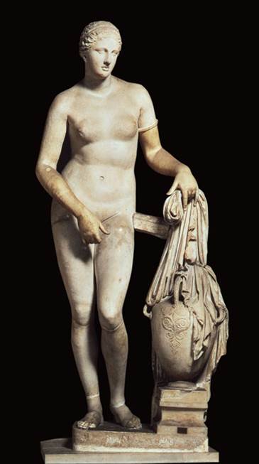 Η αρχαία τέχνη κατέγραψε και τις δύο παραδόσεις, η ησιόδεια όμως θα οδηγήσει στο ολοκληρωτικό ξεγύμνωμα της θεάς από τον Πραξιτέλη. (Εικ. 43)