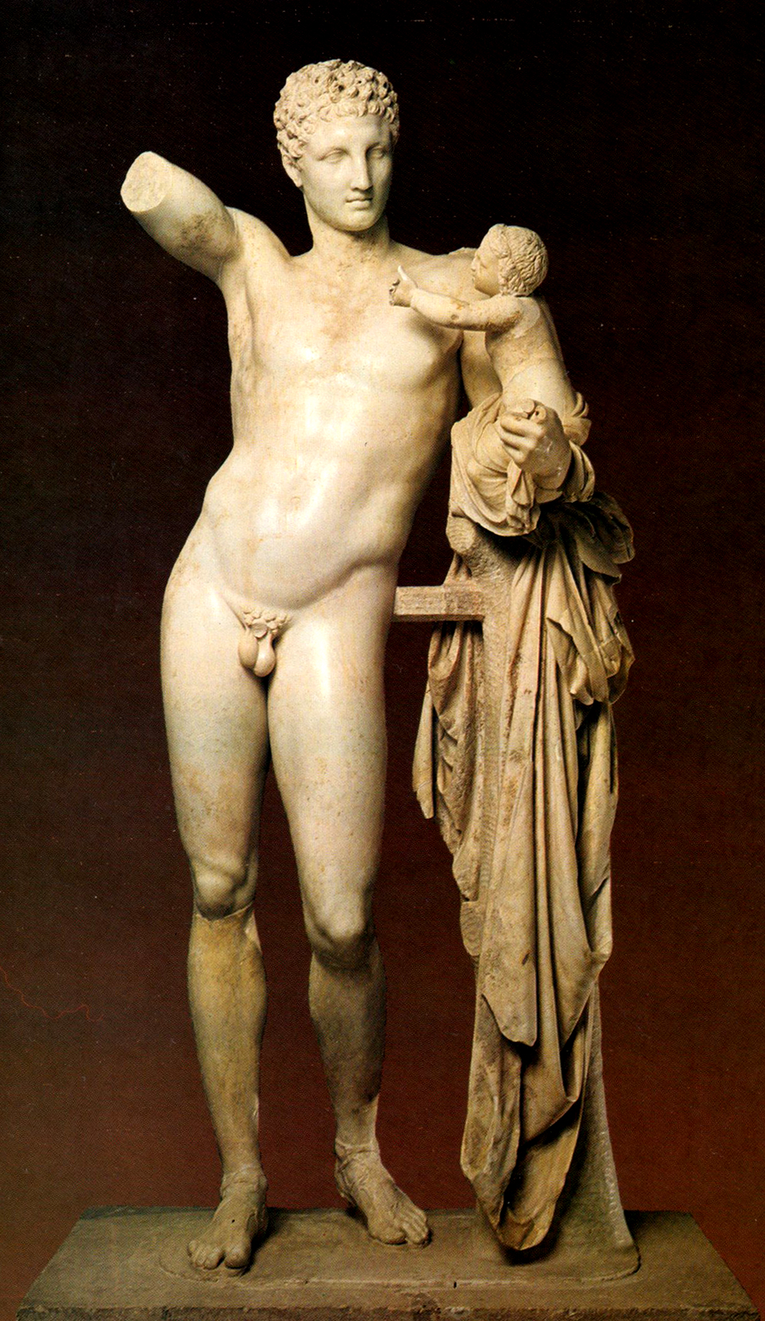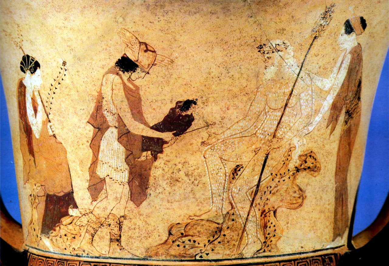 Όμως, στο μέσο της στήλης ξεχωρίζει σε ιθυφαλλική κατάσταση το μόριο του θεού, που υποδεικνύει θεότητα όχι του θανάτου αλλά της βλάστησης. Εξάλλου, ο θεός προέρχεται από τον αγροτικό πελασγικό πληθυσμό (Ηρ. 2, 51) και συνδέεται με αγροτικές και μυστηριακές λατρείες για την αναγέννηση και τον θάνατο της φύσης. Η προέλευση αυτή, βαθιά ριζωμένη στις συνειδήσεις, εξηγεί την προσκόλληση στην πεσσόμορφη απεικόνιση, παρά τις προσπάθειες του Ομήρου να δημιουργήσει έναν ωραίο, εφηβικό Ερμή (Ω, 347), όπως περίπου τον παρέστησε ο Πραξιτέλης στον γνωστό Διονυσοφόρο Ερμή (Μουσείο Ολυμπίας). (Εικ. 54, 55) Ποσειδώνας, Αφροδίτη, Ερμής αποδεικνύονται στην ουσία τους θεότητες τόσο της ζωής όσο και του θανάτου.