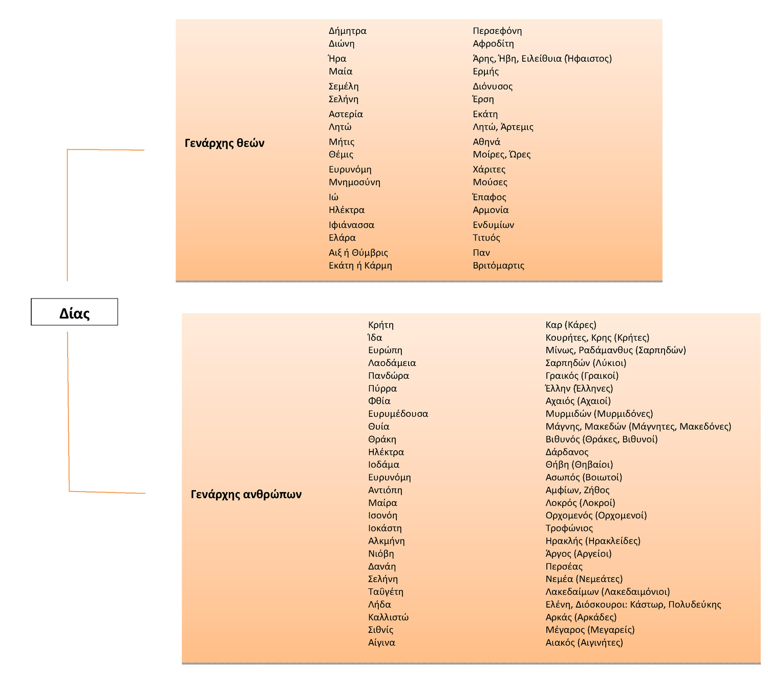 Δίας + Λήδα → Διόσκουροι, Ελένη, Κλυταιμνήστρα· Αλκμήνη → Ηρακλής· Δανάη → Περσέας· Αντιόπη → Αμφίονας και Ζήθος· Ιώ → Έπαφος· Καλλιστώ → Αρκάς· Γανυμήδης