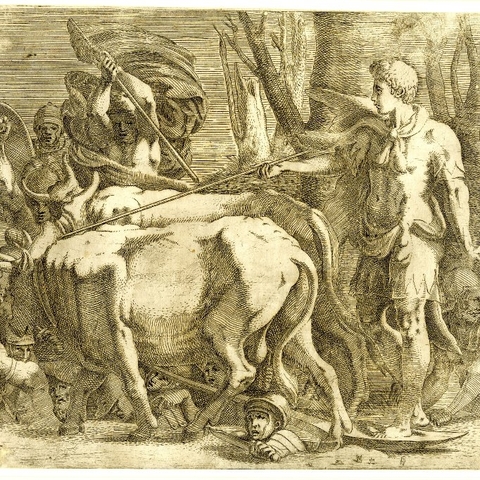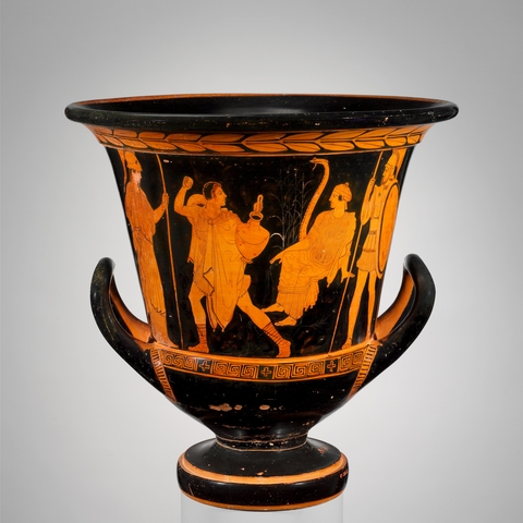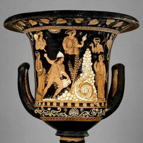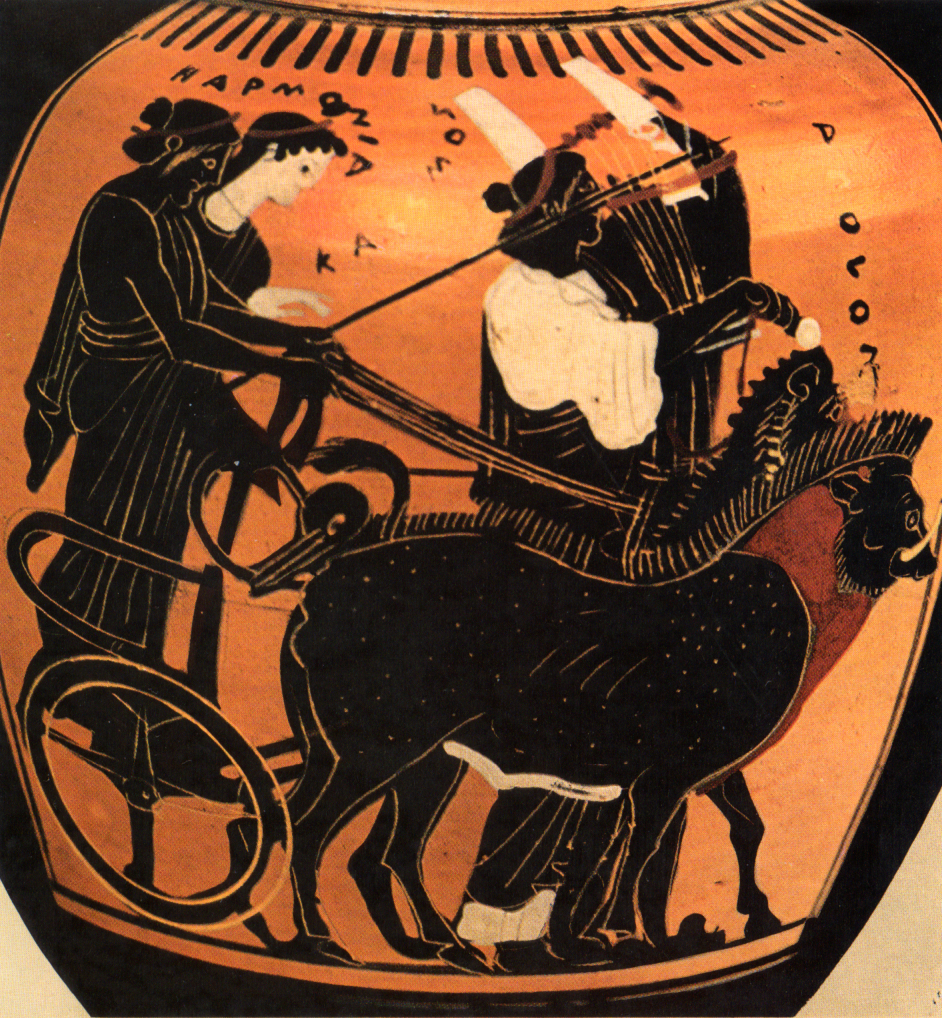 Στον γάμο αυτό [του Κάδμου και της Αρμονίας] παρακάθισαν για πρώτη φορά σε γαμήλιο γεύμα οι θεοί, και η Δήμητρα, που ερωτεύτηκε τον Ιασίονα, του χάρισε τον καρπό του σιταριού, ο Ερμής τη λύρα, η Αθηνά το περίφημο περιδέραιο και πέπλο και αυλούς και η Ηλέκτρα τα μυστήρια της λεγόμενης μεγάλης μητέρας των θεών που τελούνται με κύμβαλα[2] και τύμπανα και ό,τι άλλο ταιριάζει στις οργιαστικές τελετές· και ο Απόλλωνας έπαιξε κιθάρα και οι Μούσες τον αυλό και οι άλλοι θεοί με λέξεις ευοίωνες[3] συνεργούσαν για την ευγονία αυτού του γάμου. (Διόδ. Σ., 5.49.1)