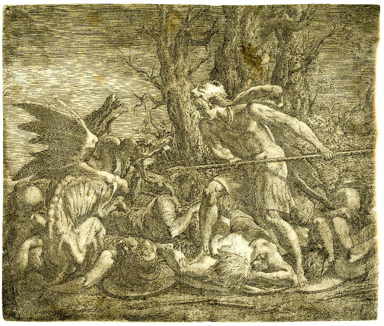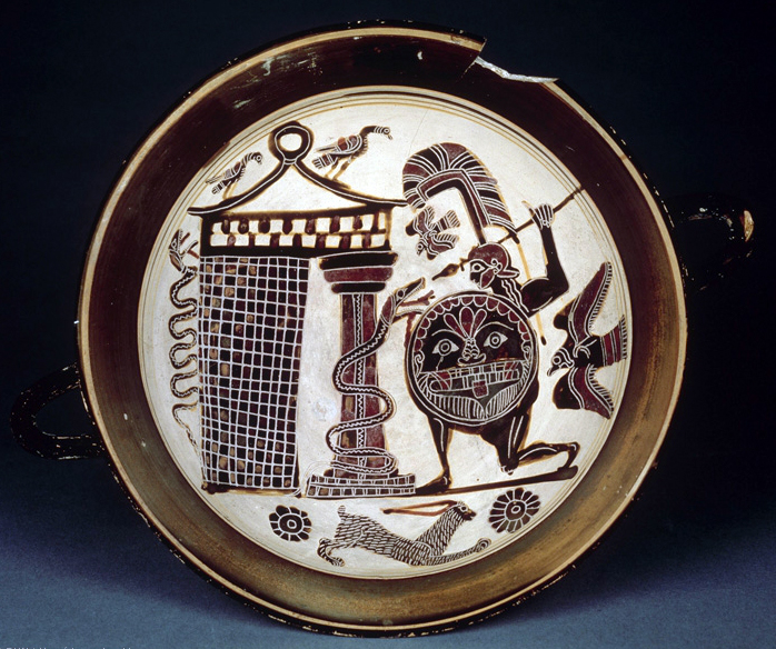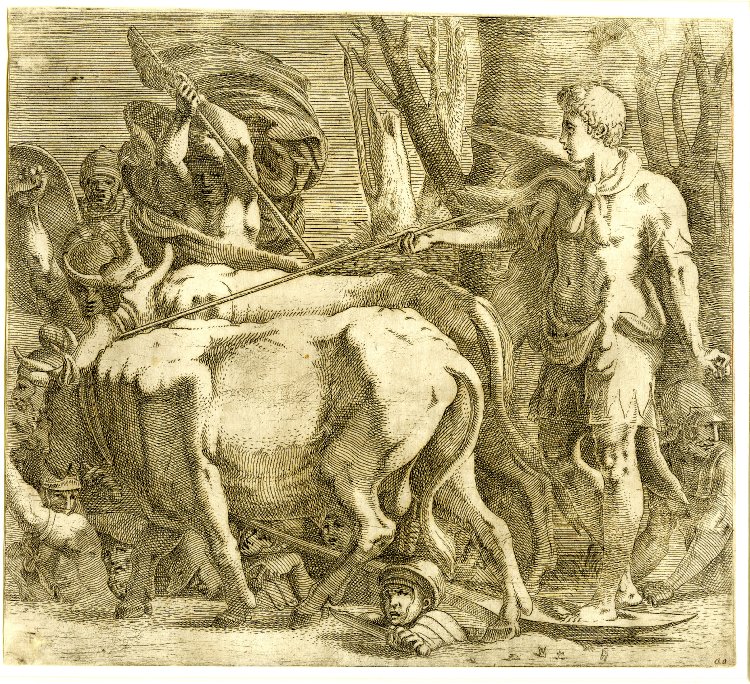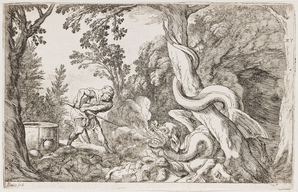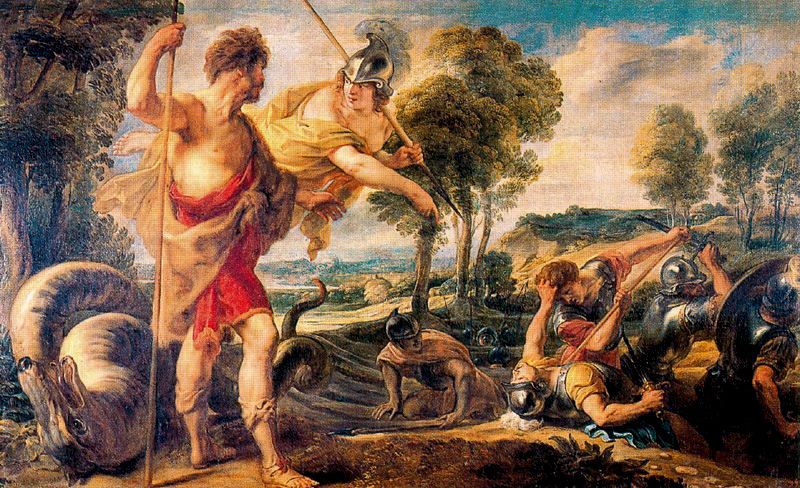 β) Το ζώο έπρεπε να θυσιαστεί. Για τη θυσία χρειαζόταν νερό για τον καθαρμό του ζώου και των συμμετεχόντων στη θυσία. Όμως το νερό της μοναδικής πηγής της περιοχής, που ονομαζόταν Πηγή του Άρη, το φυλούσε ένας δράκος από τη γενιά του Άρη, εξού και το όνομα της πηγής. Ο Κάδμος σκότωσε τον δράκοντα, που είχε στο μεταξύ εξοντώσει όλους τους απεσταλμένους του, και καθ' υπόδειξη της Αθηνάς, προς τιμή της οποίας θα θυσίαζε την αγελάδα, (Εικ. 12, 13, 14, 15, 16, 17, 18, 19, 20, 21, 22, 23, 24, 25, 26, 76 27, 28) έσπειρε τα δόντια του δράκου από τα οποία προέκυψαν σπαρμένοι άνδρες, οι Σπαρτοί. (Εικ. 29) Αυτά τα αυτόχθονα δημιουργήματα της γης των Θηβών ήταν απειλητικά. Όμως, και σε αυτή την περίπτωση απέναντι στη βία ορθώθηκε η ευφυΐα του Κάδμου. Έριξε πέτρες ανάμεσά τους κι εκείνοι, μη γνωρίζοντας τον υπαίτιο, αλληλοκατηγορήθηκαν και τελικά αλληλοσκοτώθηκαν εκτός από πέντε. (Εικ. 30) Το γένος των Καδμείων, και των Λαβδακιδών μεταγενέστερα, προήλθαν από τους γάμους Σπαρτών ή απογόνων των Σπαρτών με απογόνους του Κάδμου· για παράδειγμα, η κόρη του Κάδμου Αγαύη παντρεύτηκε τον Σπαρτό Εχίονα, η εγγονή του Σπαρτού Χθόνιου Νυκτηίς τον Καδμείο Πολύδωρο.