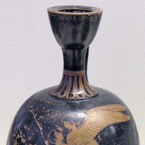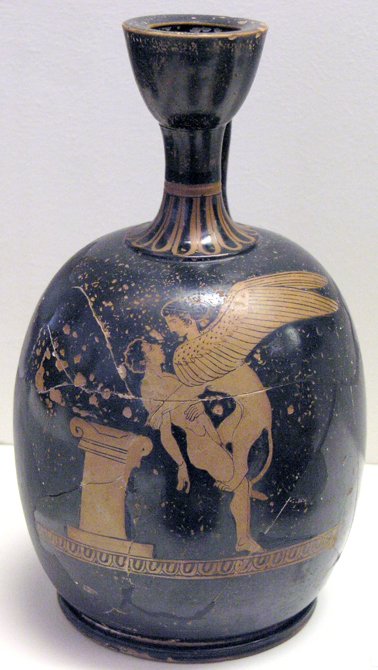«Στη διάρκεια της βασιλείας του έπεσε μεγάλη συμφορά στη Θήβα. Έστειλε δηλαδή η Ήρα τη Σφίγγα, που για μητέρα της είχε την Έχιδνα και πατέρα της τον Τυφώνα, και είχε πρόσωπο γυναίκας, στήθος, πόδια και ουρά λιονταριού και πτερά πουλιού. Αυτή έμαθε ένα αίνιγμα από τις Μούσες, θρονιάστηκε στο Φίκιο όρος και το έλεγε στους Θηβαίους. Και να ποιο ήταν το αίνιγμα· τι είναι αυτό που ενώ έχει μια μόνο φωνή, γίνεται τετράποδο και δίποδο και τρίποδο;» (Απολλόδωρος 3.52) (Εικ. 37)