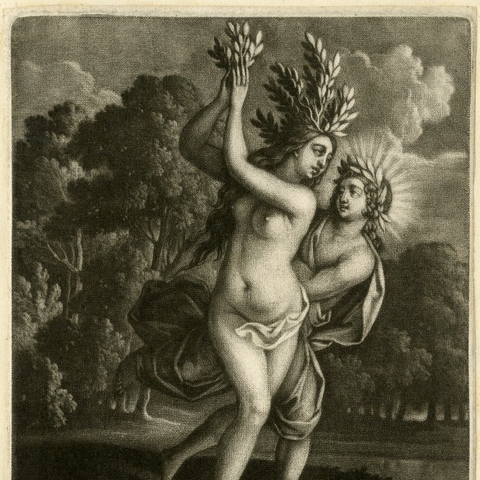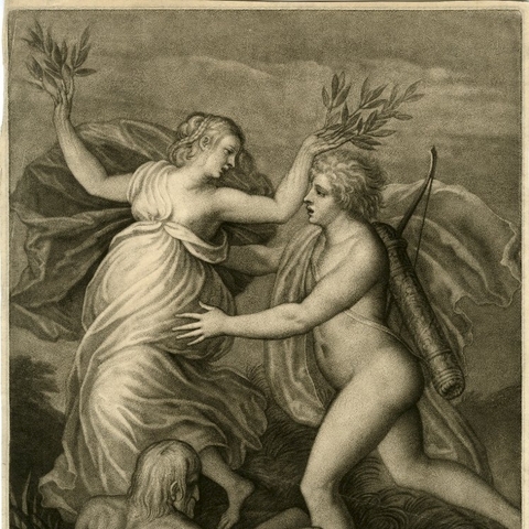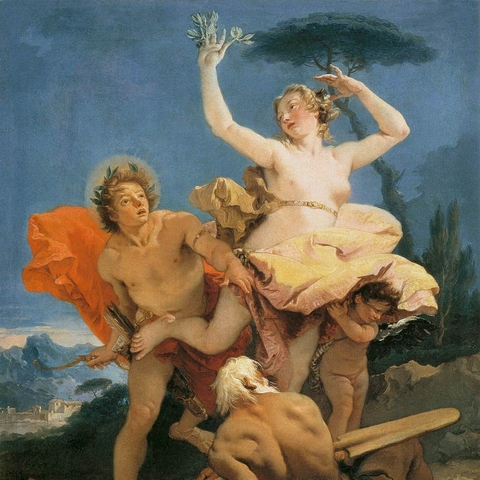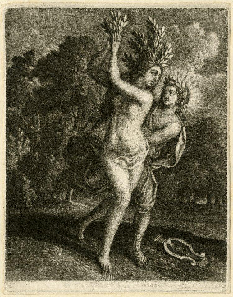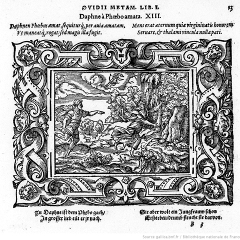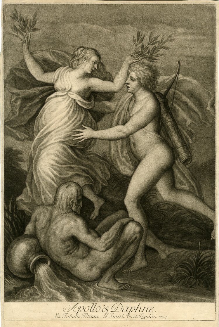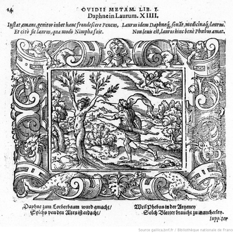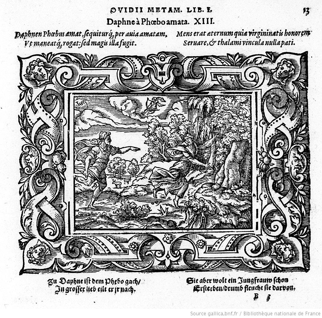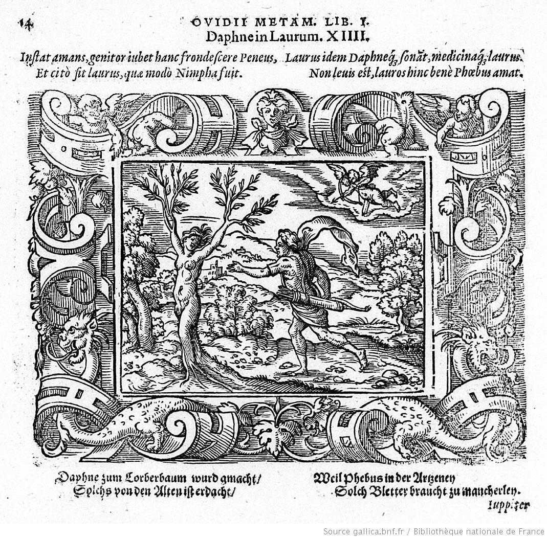 Η Δάφνη είναι το αντιπρότυπο της κόρης που υπόκειται στους κοινωνικούς κανόνες του γάμου. Σαν θηλυκός Ιππόλυτος και αγαπημένη νύμφη της Άρτεμης, αδελφής του Απόλλωνα, περνούσε τον χρόνο της στα βουνά, αποφεύγοντας τη συναναστροφή των ανδρών και κυνηγώντας. Και γι' αυτή την παρθένο νύμφη τα προβλήματα ανακύπτουν με τον έρωτα. Την ερωτεύτηκε ο Λεύκιππος, ο γιος του βασιλιά της Ήλιδας Οινόμαου. Ο νέος γρήγορα παραιτήθηκε από την προσπάθεια να την κάνει γυναίκα του, επινόησε όμως ένα τέχνασμα για να βρίσκεται κοντά της: Έπλεξε κοτσίδα τα μαλλιά του, που τα άφησε να μακρύνουν για να τα προσφέρει στον ποταμό Αλφειό, ντύθηκε σαν κόρη, παρουσιάστηκε στη Δάφνη ως κόρη του πατέρα του και την παρακάλεσε να τον/την αφήνει να κυνηγά μαζί της. Η φιλία που αναπτύχθηκε μεταξύ τους ξύπνησε τη ζήλια του Απόλλωνα που, θέλοντας να εκδικηθεί, εμφύσησε στις κοπέλες την επιθυμία να κάνουν μπάνιο στα νερά του ποταμού. Εκείνες υποχρέωσαν τον διστακτικό Λεύκιππο να ξεντυθεί, ανακάλυψαν το πραγματικό του φύλο και τον σκότωσαν με τα ακόντια και τα μαχαίρια τους. Σύμφωνα με άλλες εκδοχές, οι θεοί τον έκαναν αόρατο. Ο Απόλλωνας τότε όρμηξε να αρπάξει τη Δάφνη. Κυνηγημένη η κόρη, έτρεχε ως τη στιγμή που, καθώς θα την έπιανε, ζήτησε από τον πατέρα της να τη μεταμορφώσει. (Εικ. 48, 49, 50, 51, 52, 53, 54, 55, 56, 57, 58, 59, 60, 61, 62, 63, 64, 65) Μεταμορφώθηκε σε δάφνη, το αγαπημένο φυτό του θεού, το οποίο θα έφερε στο εξής στην κεφαλή του. Η δαφνηφορία θα έφτανε μέχρι την κεφαλή της πολιτικής εξουσίας στη Ρώμη. (Οβ., Μετ. 1.452-567)