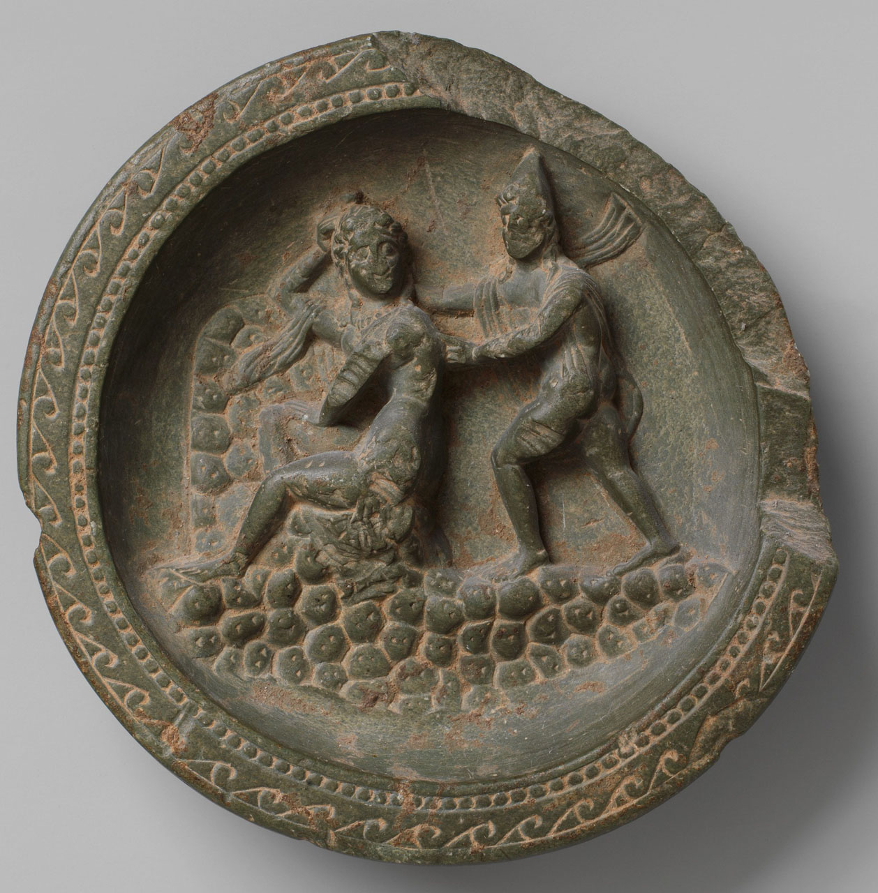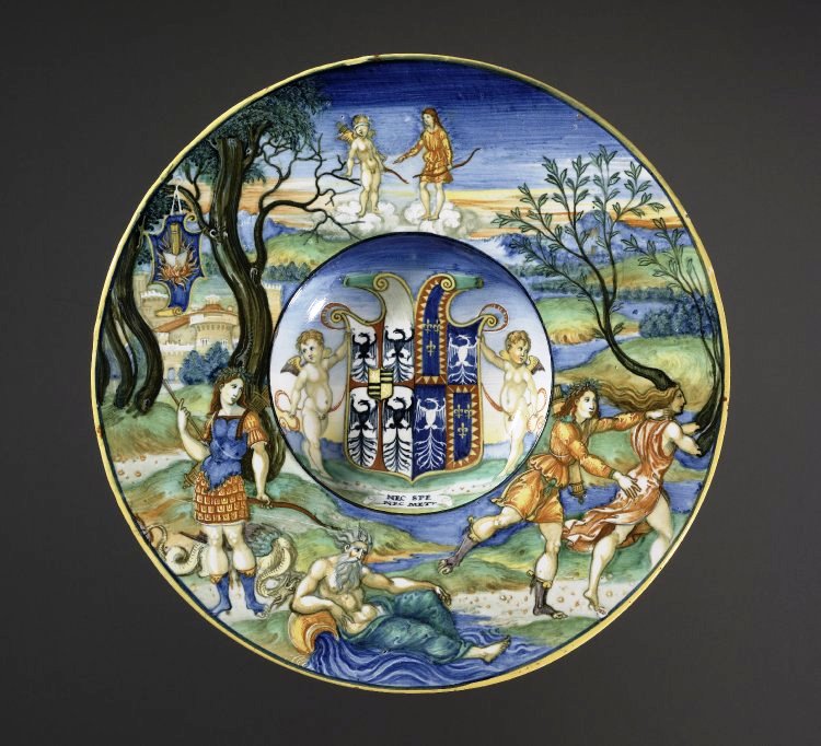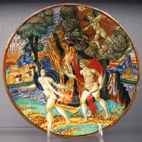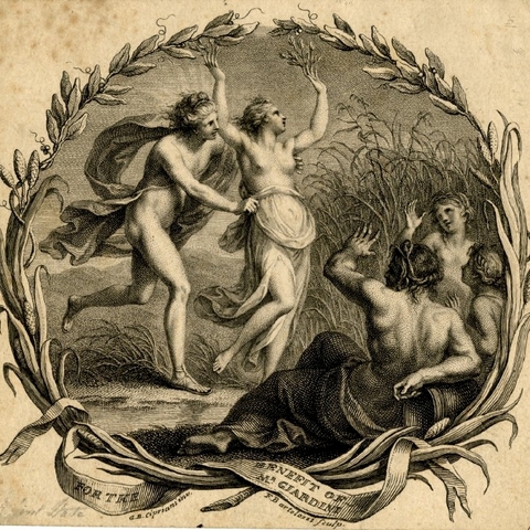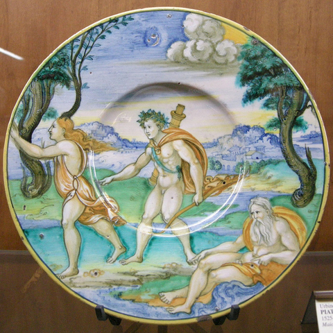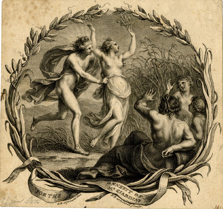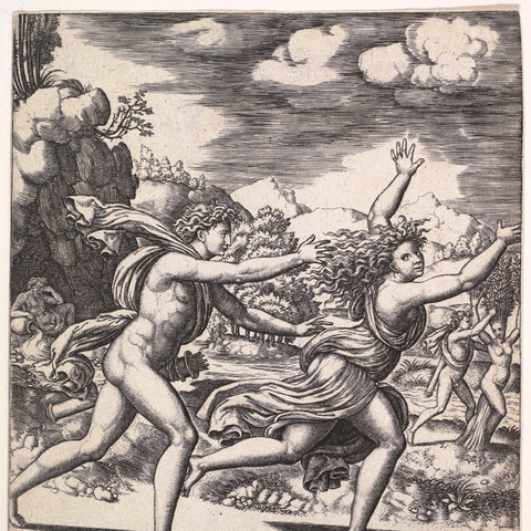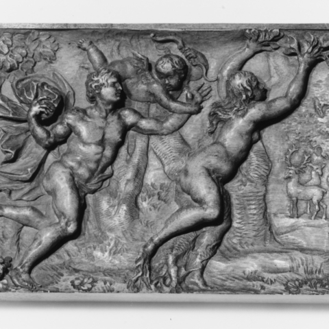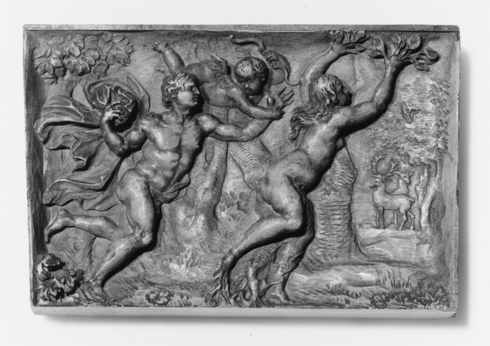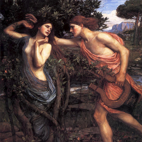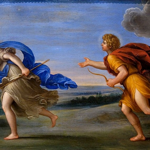 Η Δάφνη είναι το αντιπρότυπο της κόρης που υπόκειται στους κοινωνικούς κανόνες του γάμου. Σαν θηλυκός Ιππόλυτος και αγαπημένη νύμφη της Άρτεμης, αδελφής του Απόλλωνα, περνούσε τον χρόνο της στα βουνά, αποφεύγοντας τη συναναστροφή των ανδρών και κυνηγώντας. Και γι' αυτή την παρθένο νύμφη τα προβλήματα ανακύπτουν με τον έρωτα. Την ερωτεύτηκε ο Λεύκιππος, ο γιος του βασιλιά της Ήλιδας Οινόμαου. Ο νέος γρήγορα παραιτήθηκε από την προσπάθεια να την κάνει γυναίκα του, επινόησε όμως ένα τέχνασμα για να βρίσκεται κοντά της: Έπλεξε κοτσίδα τα μαλλιά του, που τα άφησε να μακρύνουν για να τα προσφέρει στον ποταμό Αλφειό, ντύθηκε σαν κόρη, παρουσιάστηκε στη Δάφνη ως κόρη του πατέρα του και την παρακάλεσε να τον/την αφήνει να κυνηγά μαζί της. Η φιλία που αναπτύχθηκε μεταξύ τους ξύπνησε τη ζήλια του Απόλλωνα που, θέλοντας να εκδικηθεί, εμφύσησε στις κοπέλες την επιθυμία να κάνουν μπάνιο στα νερά του ποταμού. Εκείνες υποχρέωσαν τον διστακτικό Λεύκιππο να ξεντυθεί, ανακάλυψαν το πραγματικό του φύλο και τον σκότωσαν με τα ακόντια και τα μαχαίρια τους. Σύμφωνα με άλλες εκδοχές, οι θεοί τον έκαναν αόρατο. Ο Απόλλωνας τότε όρμηξε να αρπάξει τη Δάφνη. Κυνηγημένη η κόρη, έτρεχε ως τη στιγμή που, καθώς θα την έπιανε, ζήτησε από τον πατέρα της να τη μεταμορφώσει. (Εικ. 48, 49, 50, 51, 52, 53, 54, 55, 56, 57, 58, 59, 60, 61, 62, 63, 64, 65) Μεταμορφώθηκε σε δάφνη, το αγαπημένο φυτό του θεού, το οποίο θα έφερε στο εξής στην κεφαλή του. Η δαφνηφορία θα έφτανε μέχρι την κεφαλή της πολιτικής εξουσίας στη Ρώμη. (Οβ., Μετ. 1.452-567)