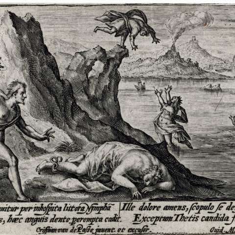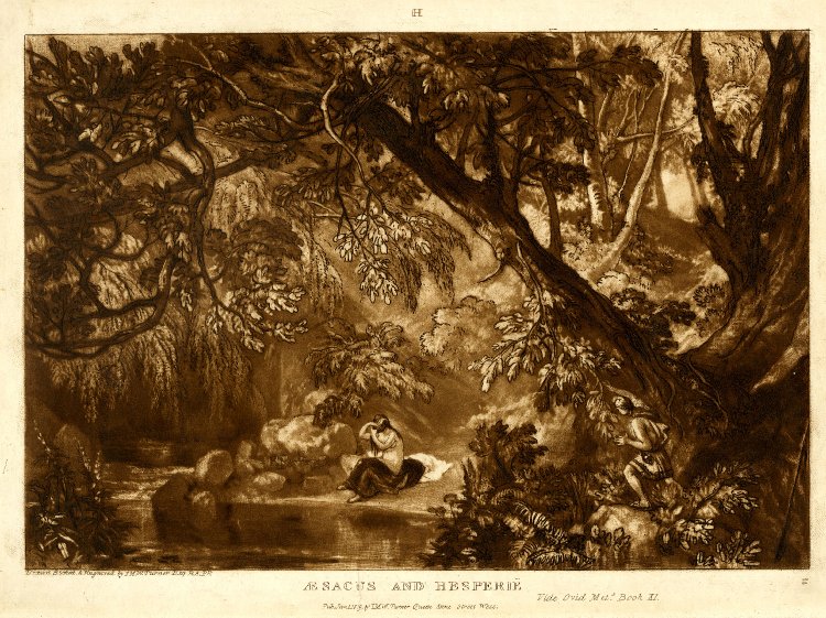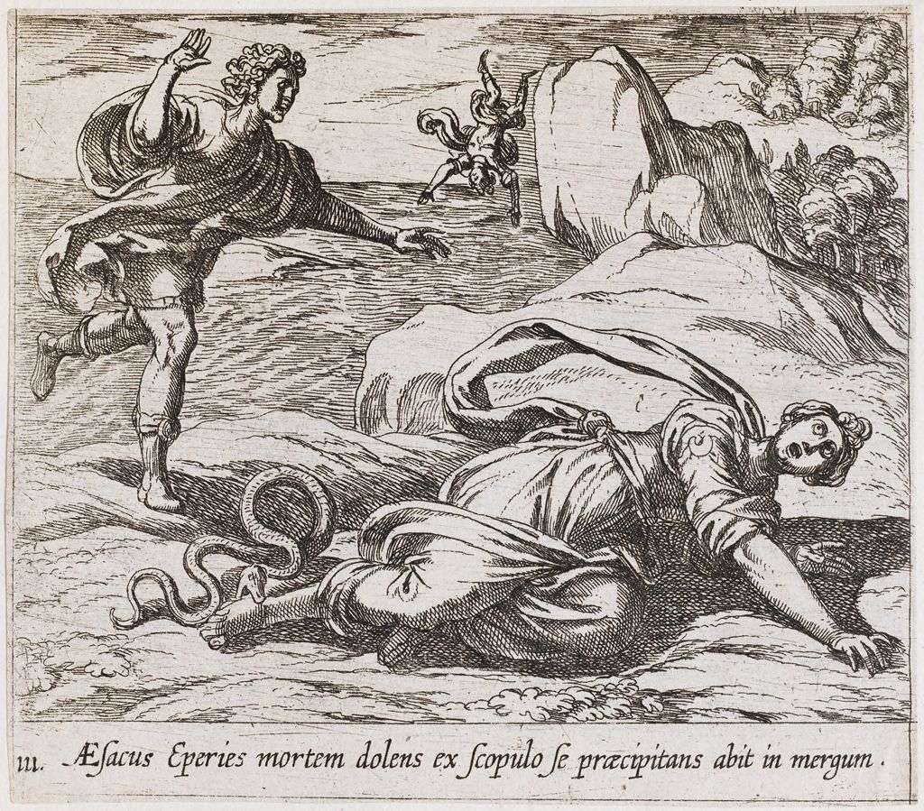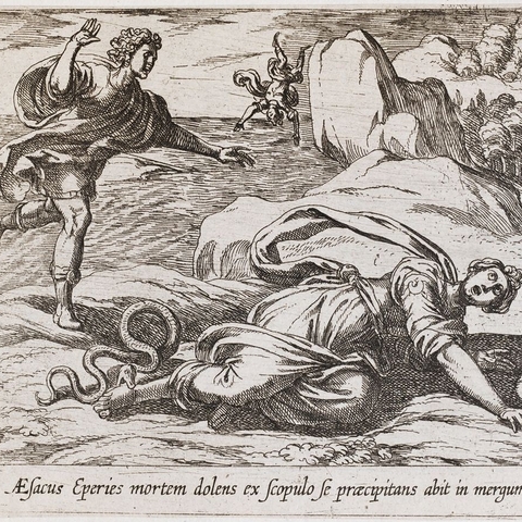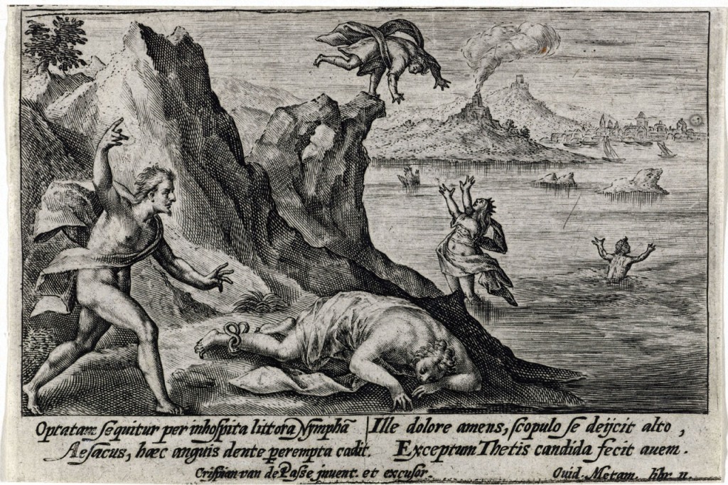 Ο Αίσακος παντρεύτηκε την κόρη του Κεβρήνα Αστερόπη. Ο θρήνος του για τον θάνατό της προκάλεσε τον οίκτο των θεών, ή μόνο της Θέτιδας, που τον μεταμόρφωσαν σε πουλί, αρπακτικό ή θαλασσοπούλι. Ο Οβίδιος (Μεταμορφώσεις, 11.749 κ.ε.) διηγείται την ιστορία παραλλάσσοντάς την και προσθέτοντας λεπτομέρειες που αιτιολογούν και τη μεταμόρφωση του Αίσακου στο πουλί αἴθυια. Πιο συγκεκριμένα: Ο Αίσακος ήταν νόθος γιος του Πριάμου και της Νύμφης Αλεξιρρόης, κόρης του ποτάμιου θεού Γρανικού. Μια μέρα στην εξοχή αντίκρυσε τη Νύμφη Εσπερία που την ερωτεύθηκε αμέσως και την κυνήγησε. Στην προσπάθειά της η Νύμφη να ξεφύγει, δεν πρόσεξε και πάτησε ένα δηλητηριώδες φίδι, από το δάγκωμα του οποίου πέθανε. Απαρηγόρητος ο Αίσακος ρίχτηκε από βράχο στη θάλασσα, αλλά καθώς έπεφτε μεταμορφώθηκε από την Τηθύ σε θαλασσοπούλι, που προσπαθεί διαρκώς να φτάσει στα βάθη της θάλασσας βουτώντας. Το πουλί αυτό ήταν η αἴθυια, επιδέξιος βουτηχτής (γι' αυτό και σήμερα λέγεται και βουτήχτρα). (Εικ. 143, 144, 145, 146, 147, 148, 149, 150)