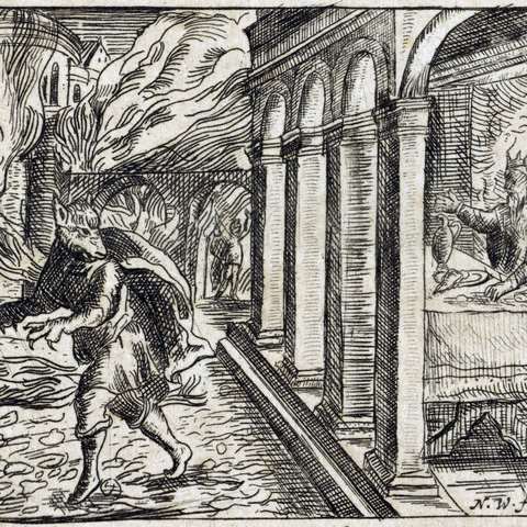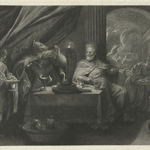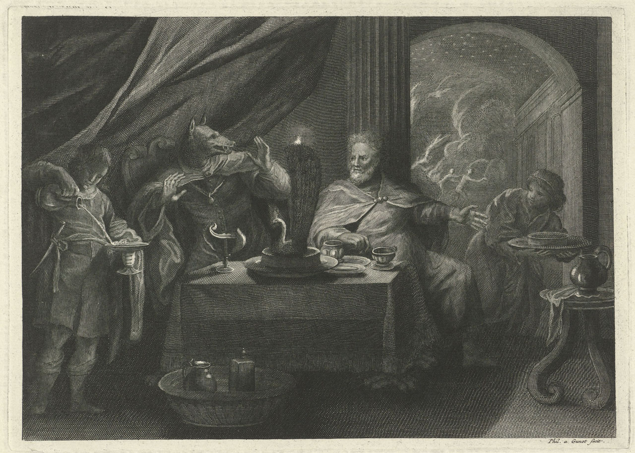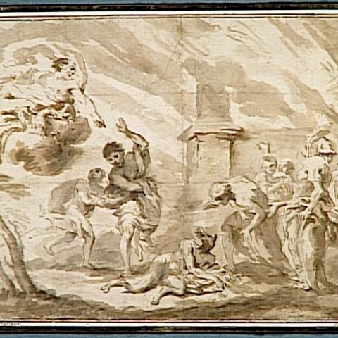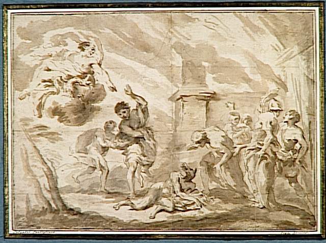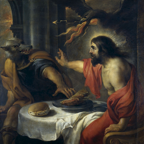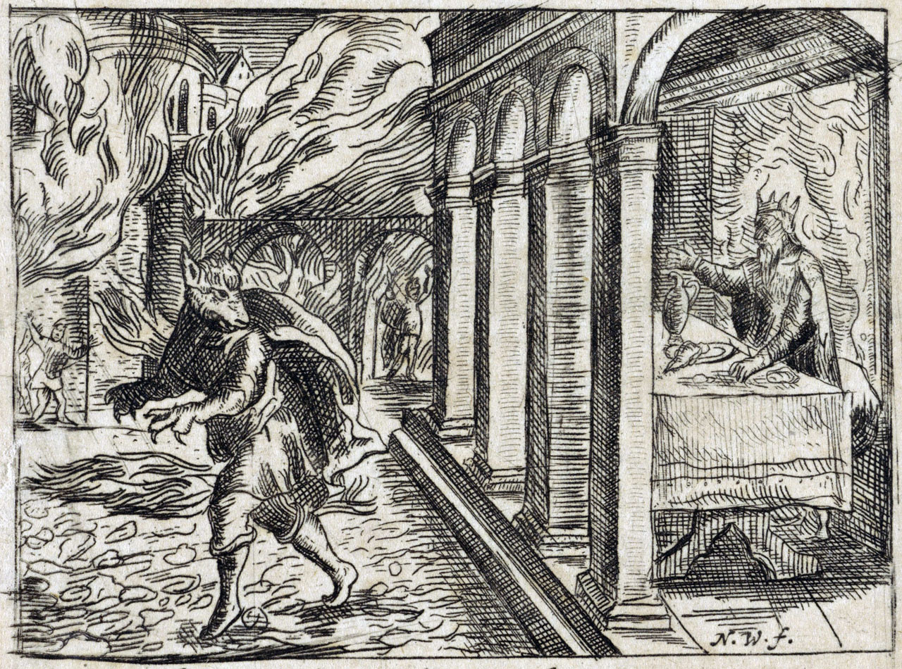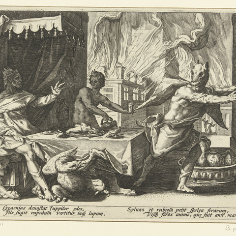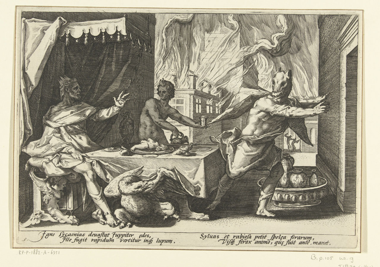 Από την πλευρά της μητέρας του παππούς του ήταν ο Λυκάονας, βασιλιάς της Αρκαδίας, ο οποίος, για να εκδικηθεί τον Δία που είχε αποπλανήσει την κόρη του Καλλιστώ, ή για να δοκιμάσει τη νοημοσύνη του Δία, τον κάλεσε σε τραπέζι, προσφέροντάς του ως εκλεκτό έδεσμα τον σφαγμένο και διαμελισμένο Αρκάδα. Οργισμένος ο Δίας, με αποστροφή ανέτρεψε το τραπέζι, μεταμόρφωσε τον Λυκάονα σε λύκο, έκαψε με κεραυνό την Αρκαδία και ύστερα πήρε τα κομμάτια του σφαγμένου παιδιού του, τα κόλλησε και ξανάδωσε ζωή στο παιδί που έγινε γενάρχης των Αρκάδων.[5] (Εικ. 541, 542, 543, 544, 545)