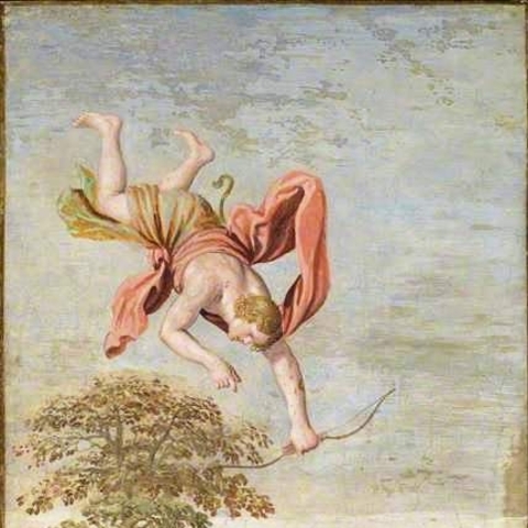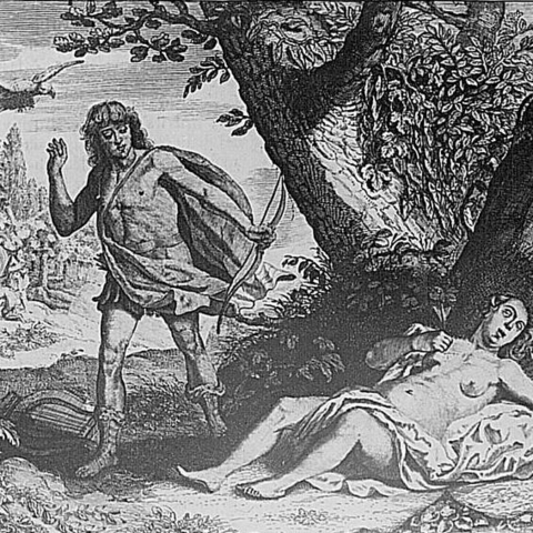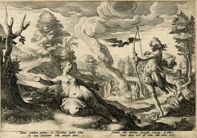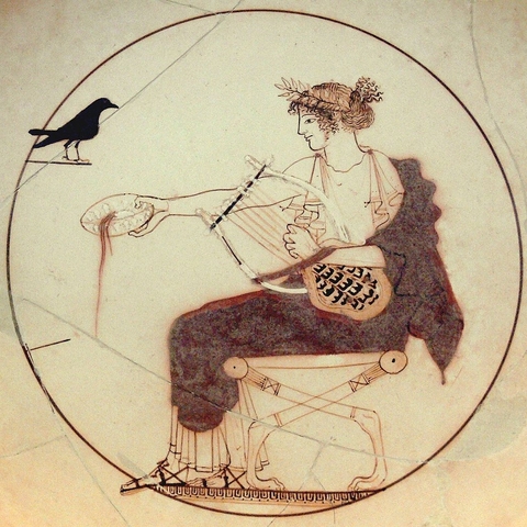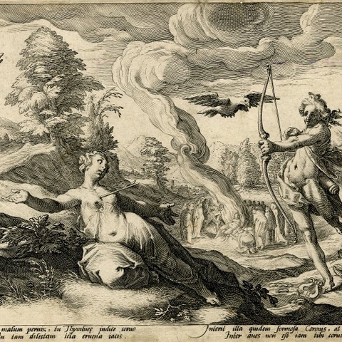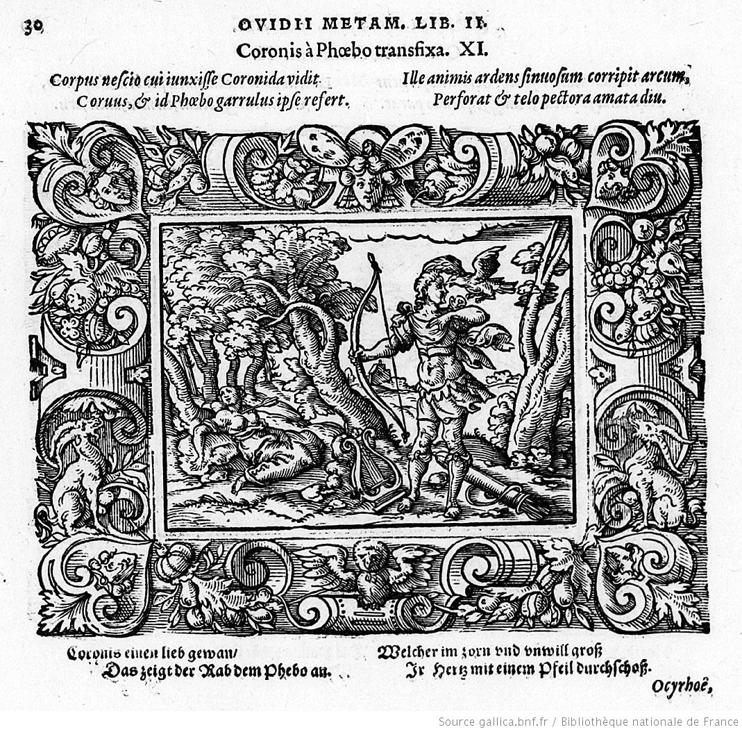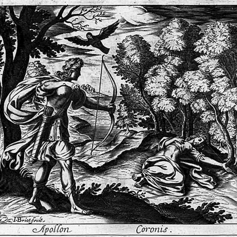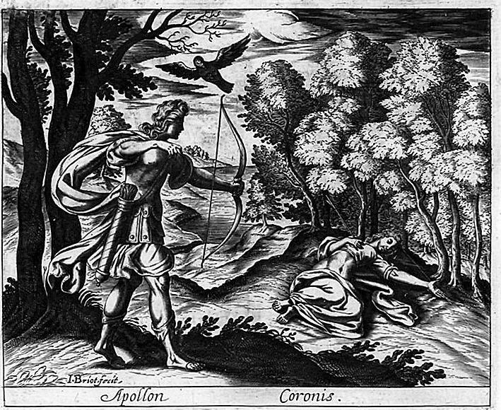 Ο Πίνδαρος, στον Πυθιόνικο για τον Ιέρωνα τον Συρακόσιο, παραδίδει την ιστορία της γέννησης του Ασκληπιού, καρπό του έρωτα του θεού της μαντικής για την Κορωνίδα, κόρη του Θεσσαλού βασιλιά Φλεγύα. Εκείνη, τον καιρό που περίμενε το παιδί της και ενάντια στη βούληση του πατέρα της που ήθελε άλλο γάμο, δόθηκε στον Ίσχη, γιο του Έλατου και αδελφό του Καινέα. Και ο Απόλλωνας την κουρούνα που του έφερε την είδηση (άλλοι λένε ότι η τέχνη του του αποκάλυψε την αλήθεια) την καταράστηκε και από άσπρη που ήταν την έκανε μαύρη. (Εικ. 585) Όσο για την Κορωνίδα, τη σκότωσε για την απιστία της. Αλλά όπως ο Δίας δεν μπορούσε να αφήσει τον γιο του Διόνυσο να καεί μαζί με τη μητέρα του Σεμέλη και τράβηξε το παιδί από τα σπλάχνα της, το ίδιο και ο Απόλλωνας, άρπαξε το μωρό από την κοιλιά της μάνας του, την ώρα που το σώμα της Κορωνίδας καιγόταν στη νεκρική πυρά.[6] (Εικ. 586, 587, 588, 589, 590, 591, 592, 593, 594)