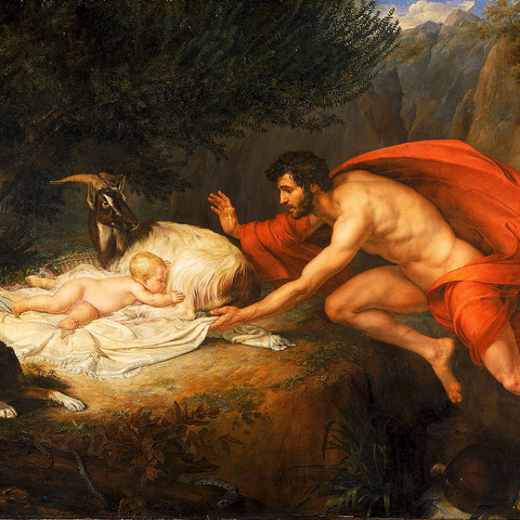 Για να εξηγηθεί η έντονη παρουσία του Ασκληπιού στην Επίδαυρο της Πελοποννήσου, ο καταγωγικός μύθος του ήρωα και θεού της ιατρικής τροποποιήθηκε ελαφρά. Ο παππούς του Φλεγύας ήταν πολεμοχαρής ληστής που ήρθε στην Πελοπόννησο υποτίθεται για να την επισκεφθεί και να τη θαυμάσει, στην πραγματικότητα όμως για να διαπιστώσει το μάχιμο των κατοίκων και πόσοι ήταν, ώστε να καταστρώσει το σχέδιό του για να την καταλάβει. Τον συνόδευε η κόρη του που δεν του είχε αποκαλύψει την εγκυμοσύνη της από τον Απόλλωνα. Με το που έφτασαν στη γη των Επιδαυρίων, η Κορωνίδα γέννησε, στους πρόποδες του βουνού που τότε ονομαζόταν Μύρτιο, Τίτθιο στην εποχή του Παυσανία. Το παιδί που γέννησε το άφησε εκτεθειμένο στο βουνό. Κι εκείνο επιβίωσε χάρη σε μια κατσίκα που το θήλασε και σε ένα σκύλο που το προστάτευε από άλλα ζώα. Ο κύρης των δυο ζώων, ο βοσκός Αρέσθανας, βγήκε σε αναζήτηση της χαμένης κατσίκας -γιατί βρήκε τα ζώα του λειψά στο μέτρημα. Μαζί με την κατσίκα του βρήκε και το εκτεθειμένο παιδί που θέλησε να το πάρει για να το μεγαλώσει. Όμως μόλις πλησίασε, το παιδί περιβλήθηκε από τη λάμψη μιας αστραπής. Αυτό προκάλεσε τρόμο στον βοσκό, τόσο που άφησε το παιδί μόνο του στην προστασία του μυστηρίου που το περιέβαλλε. (Εικ. 595, 596)