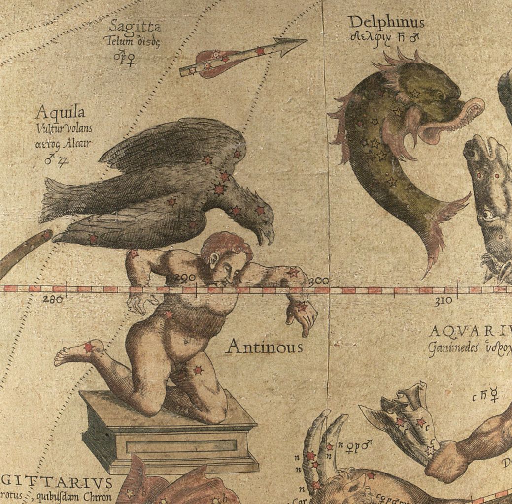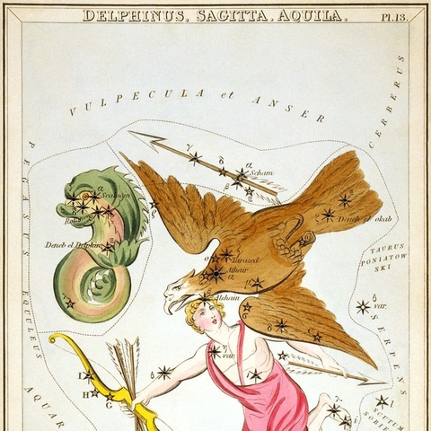 Ο Απόλλωνας τους σκότωσε, γιατί έδωσαν στον Δία τον κεραυνό με τον οποίο ο Ολύμπιος Ζευς κατακεραύνωσε τον γιο που είχε αποκτήσει ο θεός της μαντικής από την Αρσινόη, κόρη του Λεύκιππου, ή την Κορωνίδα, κόρη του Φλεγύα, τον Ασκληπιό. Διότι, ασκώντας την τέχνη του γιατρού παρέτεινε τη ζωή των ανθρώπων και μάλιστα ανάσταινε και νεκρούς, προκαλώντας αναστάτωση στην τάξη του κόσμου. (Εικ. 603) Γυρεύοντας να ξεφύγει την οργή του πατέρα του, ο Απόλλωνας κατέφυγε στους Υπερβόρειους· εκεί έκρυψε και το υπερμέγεθες βέλος του φόνου και μετά το τοποθέτησε ανάμεσα στα αστέρια εἰς ὑπόμνημα τῆς ἑαυτοῦ μάχης (Ερατοσθ., Καταστερισμοί 1.29). (Εικ. 756, 757, 758)