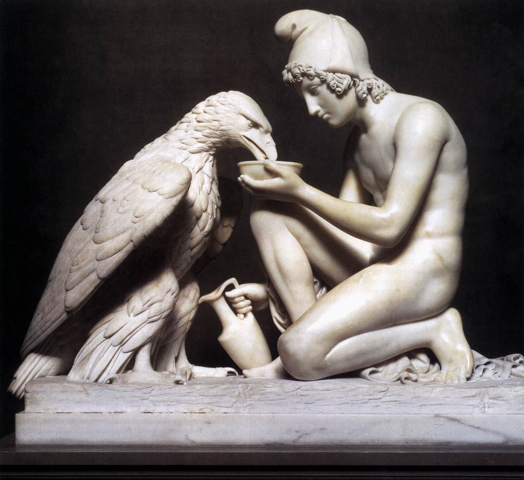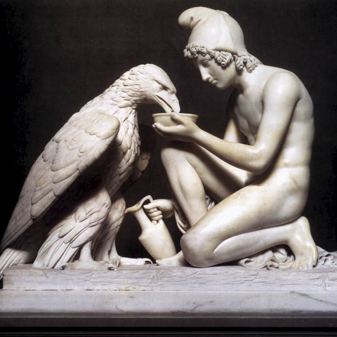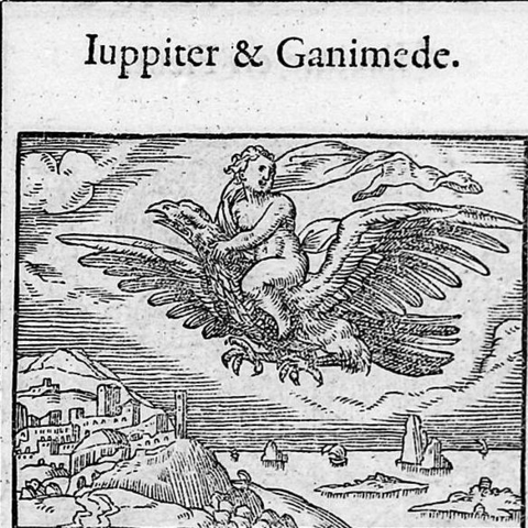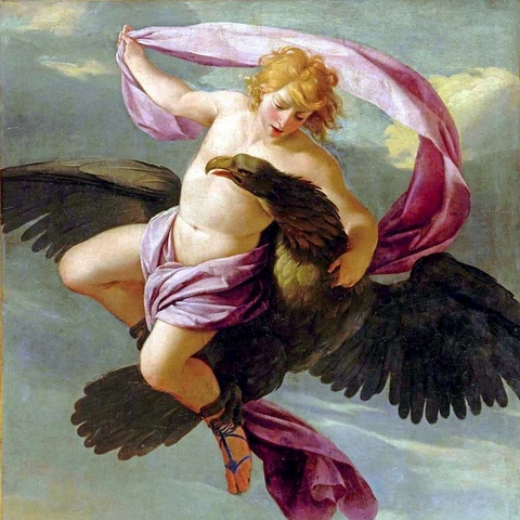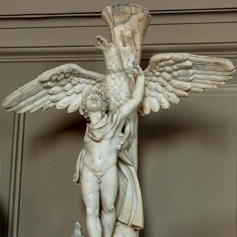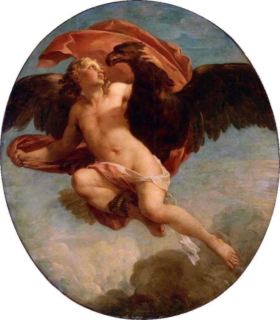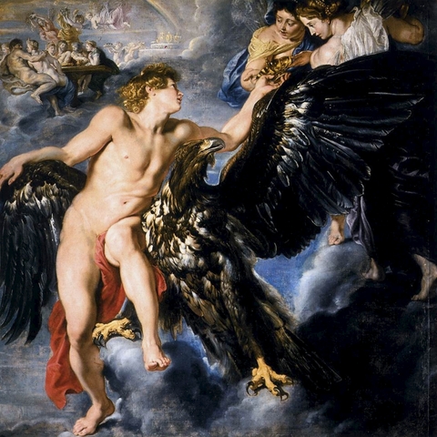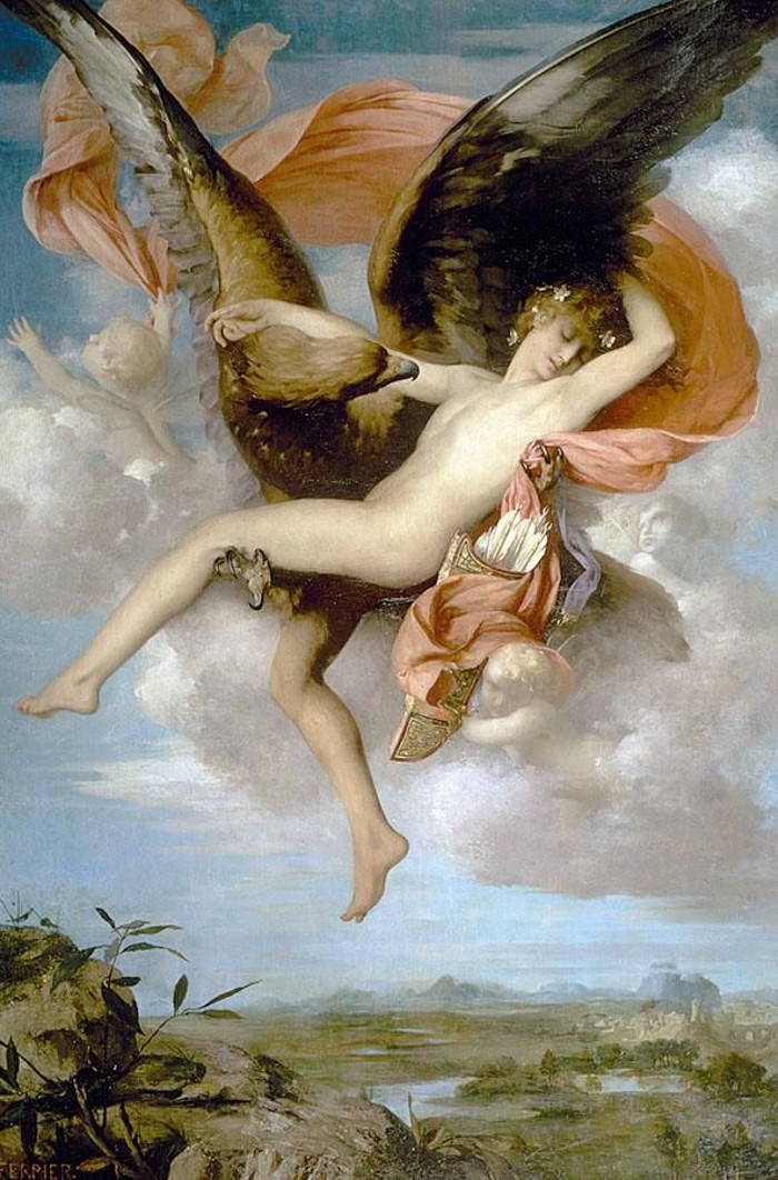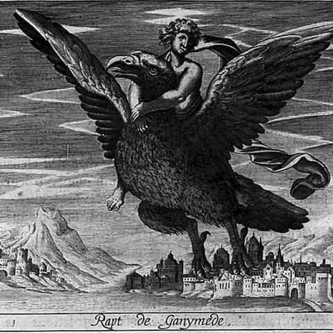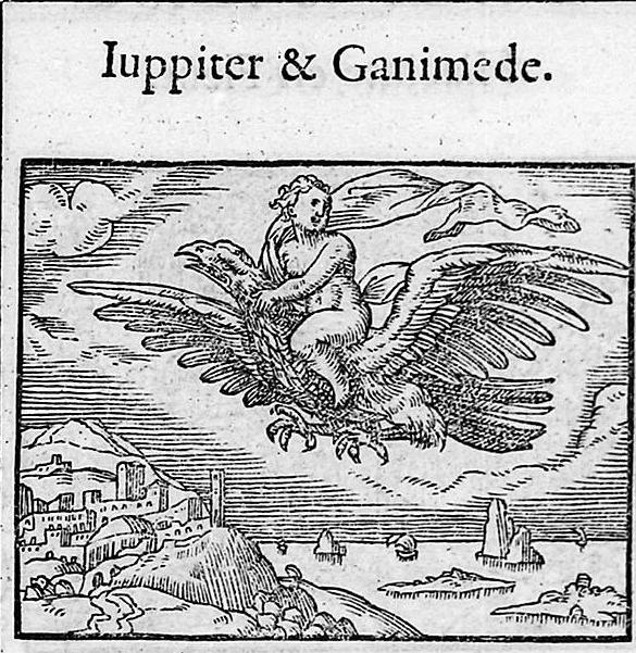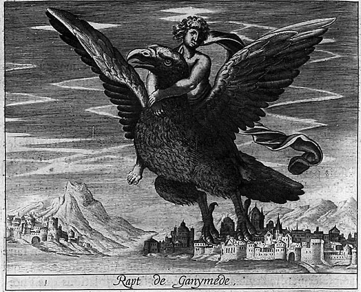 Σύμφωνα με τον Όμηρο, ο Γανυμήδης ήταν γιος του Τρώα και της Καλλιρρόης, κόρης του θεού ποταμού της Τροίας Σκάμανδρου, και ο ωραιότερος από τους θνητούς. Άλλες παραδόσεις τον θέλουν γιο του Εριχθόνιου (του παππού του στην ομηρική γενεαλογία) ή του Λαομέδοντα (του ανεψιού του στην ομηρική γενεαλογία), του Ίλου ή του Ασσάρακου (των αδελφών του στην ομηρική γενεαλογία). Ο Γανυμήδης, όπως και άλλοι βασιλόπαιδες, έβοσκε τα κοπάδια του πατέρα του στα βουνά γύρω από την Τροία, όταν τον είδε ο Δίας. Η ομορφιά του έφηβου τράβηξε τον θεό και τον απήγαγε. Σύμφωνα με μια παράδοση ο Δίας πήρε τη μορφή του αετού ή έστειλε το αγαπημένο του πουλί και μετέφερε τον νέο στον Όλυμπο, που επιφορτίστηκε με τη δουλειά του οινοχόου, να ρίχνει δηλαδή νέκταρ στο ποτήρι του Δία, αντικαθιστώντας τη θεότητα της νιότης Ήβη σε αυτό το έργο. Στον απαρηγόρητο πατέρα του Γανυμήδη, τον Τρώα, ο Δίας χάρισε τα περίφημα άλογά του, αυτά που μόνο θεοί είχαν και που στη συνέχεια έγιναν η αιτία να θανατωθεί από τον Ηρακλή ο βασιλιάς της Τροίας Λαομέδοντας· ή ένα χρυσό κλήμα, έργο του Ήφαιστου, στον άλλο υποτιθέμενο πατέρα του Γανυμήδη, τον Λαομέδοντα. Μεταγενέστερες εκδοχές θέλουν τον Δία να δέχεται πιέσεις από την Ήρα και την Ήβη, και γι' αυτό να μεταμορφώνει τον Γανυμήδη σε αστερισμό χαρίζοντας στον αιώνιο έφηβο την αθανασία -τέτευχεν ἀθανασίαν τοῖς ἀνθρώποις ἄγνωστον οὖσαν. Πρόκειται για τον αστερισμό του Υδροχόου -στην ουσία ο Δίας επιφόρτισε τον ευνοούμενό του να κάνει στον ουρανό την εργασία που επιτελούσε στον Όλυμπο. Οὗτος δοκεῖ κεκλῆσθαι ἀπὸ τῆς πράξεως Ὑδροχόος. ἔχων γὰρ ἕστηκεν οἰνοχόην καὶ ἔκχυσιν πολλὴν ποιεῖται ὑγροῦ (Ερατοσθ., Καταστ. 1.26). Η εύνοια του Δία στον Γανυμήδη δεν ωφέλησε καθόλου τους Τρώες, κάτι που προκάλεσε θρηνητική απορία στην Εκάβη· το μίσος της Ήρας εξαιτίας της απαγωγής επικράτησε. Πάντως, ο θεός τίμησε τόσο τον Γανυμήδη όσο και τον αετό που τον άρπαξε τοποθετώντας και τους δυο στον ουρανό -ο αστερισμός του υδροχόου, ο αστερισμός του αετού. (Εικ. 99, 100, 101, 102, 103, 104, 105, 106, 107, 108, 109, 110, 111, 112, 113, 114, 115, 116, 117, 118, 119, 120, 121, 122, 123, 124, 125, 126, 127, 128, 129, 130, 131)
