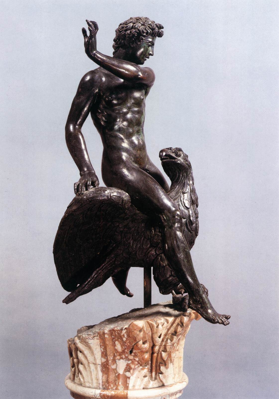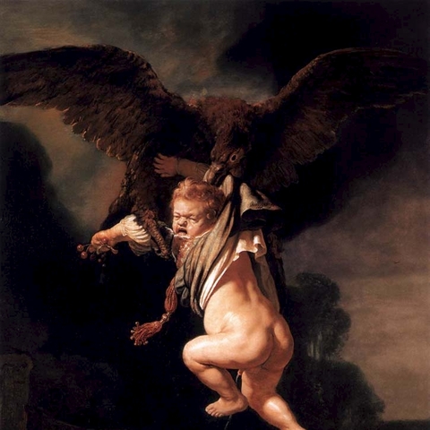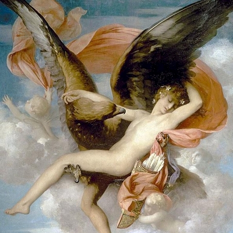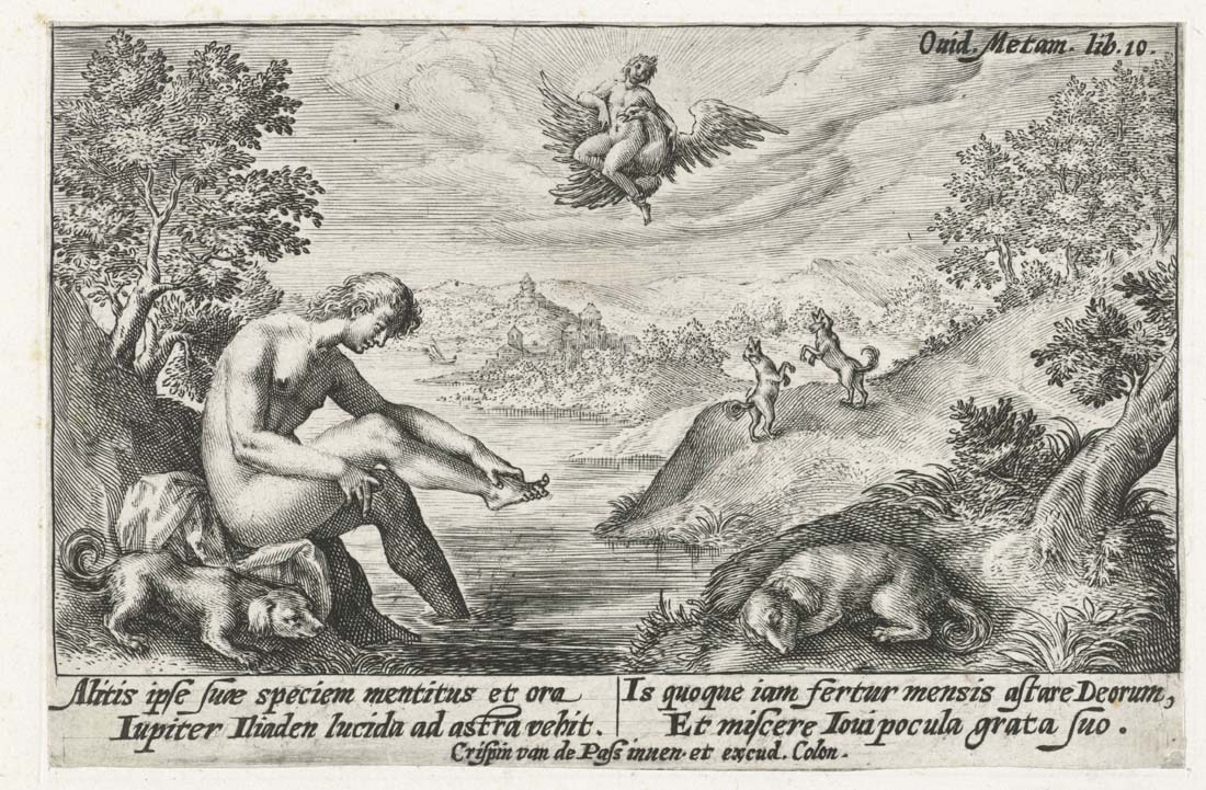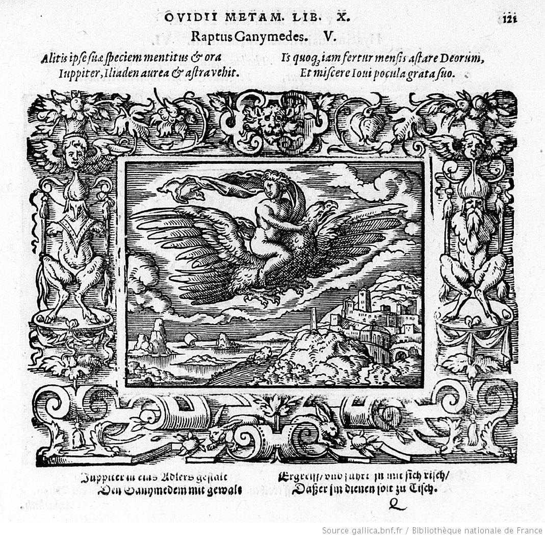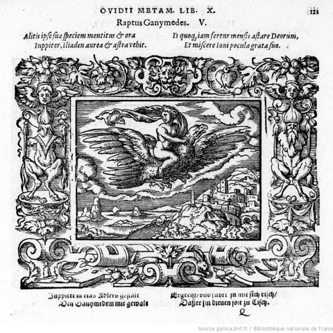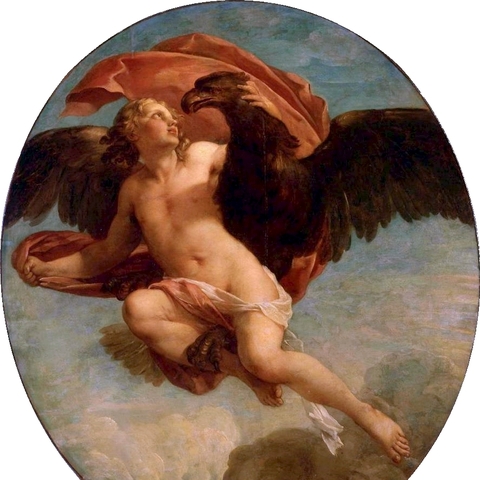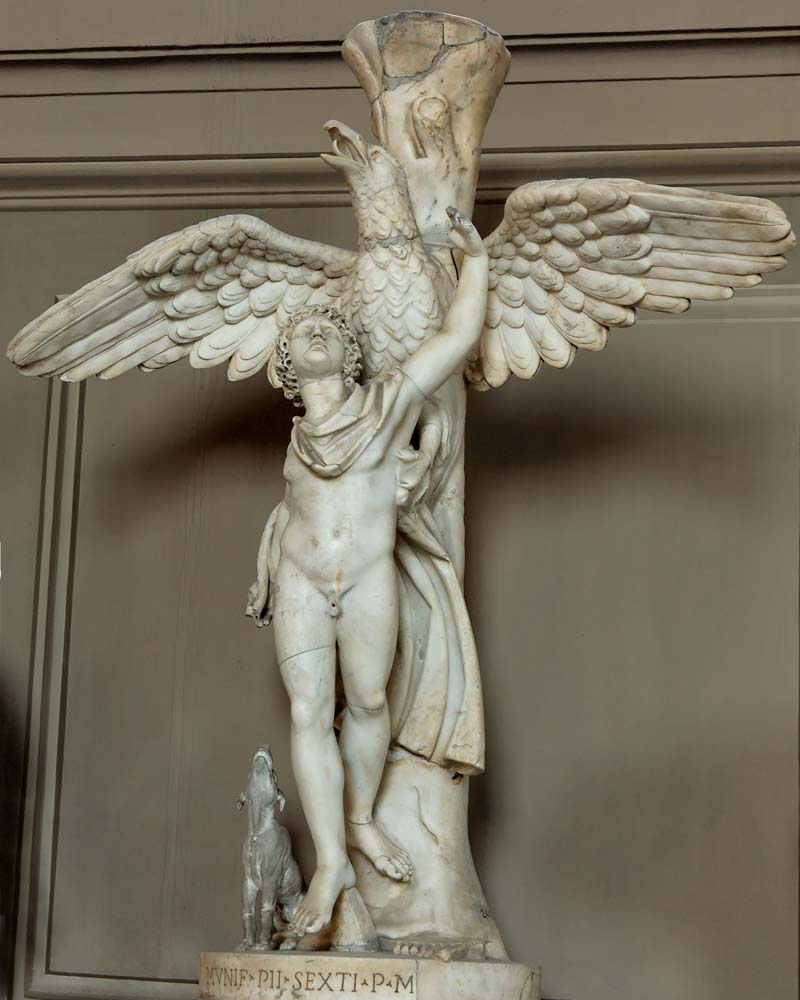 Σύμφωνα με τον Όμηρο, ο Γανυμήδης ήταν γιος του Τρώα και της Καλλιρρόης, κόρης του θεού ποταμού της Τροίας Σκάμανδρου, και ο ωραιότερος από τους θνητούς. Άλλες παραδόσεις τον θέλουν γιο του Εριχθόνιου (του παππού του στην ομηρική γενεαλογία) ή του Λαομέδοντα (του ανεψιού του στην ομηρική γενεαλογία), του Ίλου ή του Ασσάρακου (των αδελφών του στην ομηρική γενεαλογία). Ο Γανυμήδης, όπως και άλλοι βασιλόπαιδες, έβοσκε τα κοπάδια του πατέρα του στα βουνά γύρω από την Τροία, όταν τον είδε ο Δίας. Η ομορφιά του έφηβου τράβηξε τον θεό και τον απήγαγε. Σύμφωνα με μια παράδοση ο Δίας πήρε τη μορφή του αετού ή έστειλε το αγαπημένο του πουλί και μετέφερε τον νέο στον Όλυμπο, που επιφορτίστηκε με τη δουλειά του οινοχόου, να ρίχνει δηλαδή νέκταρ στο ποτήρι του Δία, αντικαθιστώντας τη θεότητα της νιότης Ήβη σε αυτό το έργο. Στον απαρηγόρητο πατέρα του Γανυμήδη, τον Τρώα, ο Δίας χάρισε τα περίφημα άλογά του, αυτά που μόνο θεοί είχαν και που στη συνέχεια έγιναν η αιτία να θανατωθεί από τον Ηρακλή ο βασιλιάς της Τροίας Λαομέδοντας· ή ένα χρυσό κλήμα, έργο του Ήφαιστου, στον άλλο υποτιθέμενο πατέρα του Γανυμήδη, τον Λαομέδοντα. Μεταγενέστερες εκδοχές θέλουν τον Δία να δέχεται πιέσεις από την Ήρα και την Ήβη, και γι' αυτό να μεταμορφώνει τον Γανυμήδη σε αστερισμό χαρίζοντας στον αιώνιο έφηβο την αθανασία -τέτευχεν ἀθανασίαν τοῖς ἀνθρώποις ἄγνωστον οὖσαν. Πρόκειται για τον αστερισμό του Υδροχόου -στην ουσία ο Δίας επιφόρτισε τον ευνοούμενό του να κάνει στον ουρανό την εργασία που επιτελούσε στον Όλυμπο. Οὗτος δοκεῖ κεκλῆσθαι ἀπὸ τῆς πράξεως Ὑδροχόος. ἔχων γὰρ ἕστηκεν οἰνοχόην καὶ ἔκχυσιν πολλὴν ποιεῖται ὑγροῦ (Ερατοσθ., Καταστ. 1.26). Η εύνοια του Δία στον Γανυμήδη δεν ωφέλησε καθόλου τους Τρώες, κάτι που προκάλεσε θρηνητική απορία στην Εκάβη· το μίσος της Ήρας εξαιτίας της απαγωγής επικράτησε. Πάντως, ο θεός τίμησε τόσο τον Γανυμήδη όσο και τον αετό που τον άρπαξε τοποθετώντας και τους δυο στον ουρανό -ο αστερισμός του υδροχόου, ο αστερισμός του αετού. (Εικ. 99, 100, 101, 102, 103, 104, 105, 106, 107, 108, 109, 110, 111, 112, 113, 114, 115, 116, 117, 118, 119, 120, 121, 122, 123, 124, 125, 126, 127, 128, 129, 130, 131)