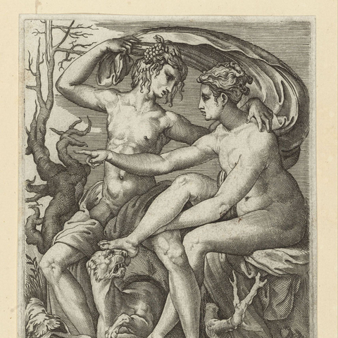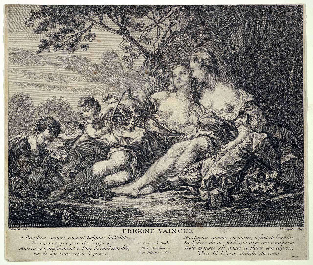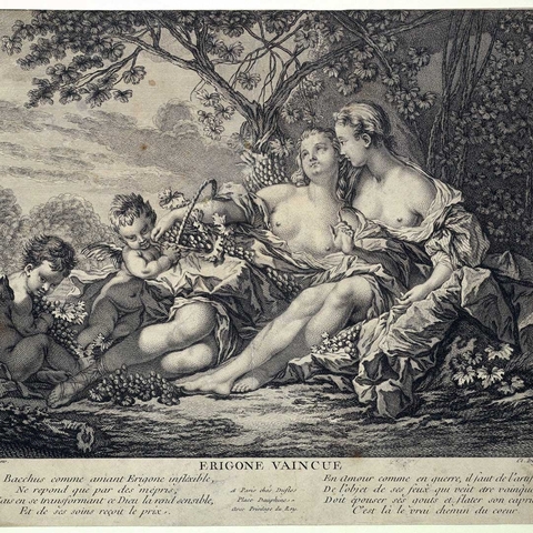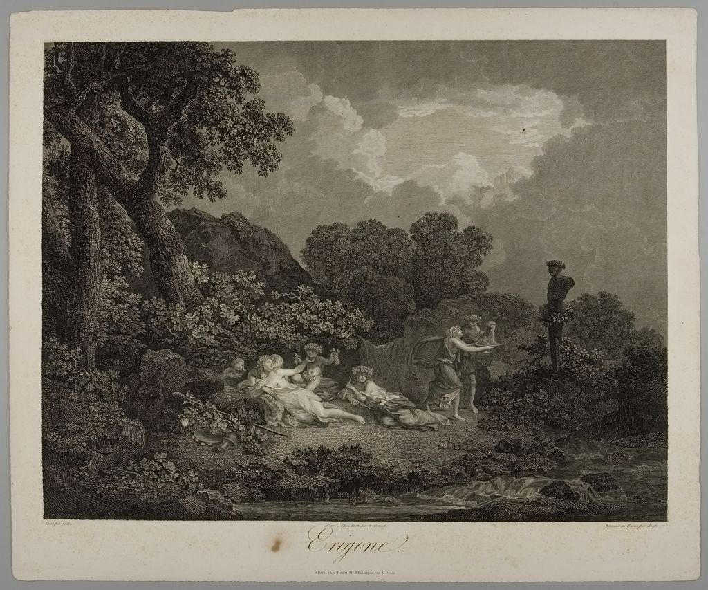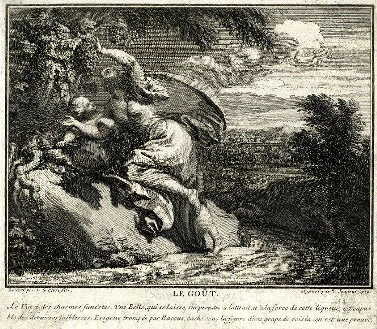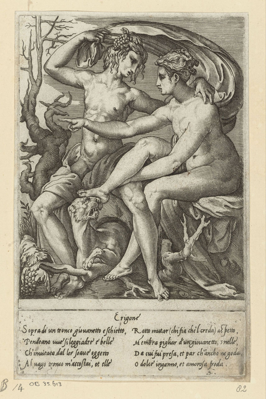Η μία Ηριγόνη είναι κόρη του Αθηναίου Ικάριου, τον οποίο επισκέφτηκε ο Διόνυσος. Ο Απολλόδωρος προσδιορίζει ότι αυτό έγινε στα χρόνια που βασίλευε ο Πανδίονας στην Αθήνα, μετά τον Εριχθόνιο· τότε ήλθε και η Δήμητρα. Τη Δήμητρα τη φιλοξένησε στην Ελευσίνα ο Κελεός, ενώ τον Διόνυσο ο Ικάριος, και ο κάθε θεός έφερνε στην πόλη της Αθηνάς τα δώρα του. (Εικ. 1008, 1009, 1010) Ο Διόνυσος ερωτεύτηκε την Ηριγόνη και μαζί απέκτησαν ένα γιο, τον Στάφυλο. Ο θεός έδωσε στον Ικάριο ένα κλήμα ή, κατά άλλους, έναν ασκό κρασί, και του δίδαξε όλα τα σχετικά με την παρασκευή του κρασιού. (Εικ. 1011, 1012, 1013, 1014, 1015, 1016, 1017) Αυτός θέλησε να μοιραστεί την καινούρια γνώση με άλλους ανθρώπους, πρώτα με κάποιους βοσκούς, οι οποίοι δοκίμασαν το ποτό και, καθώς τους προκάλεσε μεγάλη ευχαρίστηση, εξακολουθούσαν να πίνουν, και μάλιστα ανέρωτο κρασί, ἂκρατον οἶνον, και σε μεγάλες ποσότητες. Εξαιτίας της μέθης τους πίστεψαν ότι ο Ικάριος ήθελε να τους δηλητηριάσει, γι' αυτό τον σκότωσαν με τα ραβδιά τους. Την επόμενη μέρα κατάλαβαν τι έγινε και τον έθαψαν. Σύμφωνα με άλλες εκδοχές οι βοσκοί άφησαν το πτώμα του Ικάριου άταφο, το εγκατέλειψαν. Και στις δύο εκδοχές η Ηριγόνη ψάχνει απεγνωσμένα τον πατέρα της, ενώ τον τόπο της ταφής ή τον τόπο όπου ήταν άταφο το σώμα το υπέδειξε το πιστό σκυλί του Ικάριου, η Μαίρα, που τον ακολουθούσε παντού. Η Ηριγόνη θρήνησε τον πατέρα της και μη αντέχοντας τον πόνο της αυτοκτόνησε, κρεμάστηκε στο δέντρο, στη ρίζα του οποίου βρισκόταν το σώμα του Ικάριου. Ο ατιμώρητος θάνατος του Ικάριου και της Ηριγόνης προκάλεσε την οργή του Διόνυσου που έστειλε περίεργη θεομηνία στην Αθήνα. Χτυπημένες από τρέλα οι νεαρές κοπέλες της Αθήνας, απαγχονίζονταν. Το μαντείο των Δελφών χρησμοδότησε ότι έπρεπε να τιμωρηθούν οι εγκληματίες και να καθιερώσουν γιορτή προς τιμή της κρεμασμένης Ηριγόνης, κατά την οποία κρεμούσαν νέες κοπέλες στα δέντρα. Το έθιμο διατηρήθηκε για αιώνες, και στη Ρώμη στη γιορτή Liberalia προς τιμή του Διόνυσου, μόνο που τα πραγματικά θύματα αντικαταστάθηκαν από δίσκους, στους οποίους παριστάνονταν πρόσωπα -ο καιρός των ανθρωποθυσιών πλέον περνούσε ανεπιστρεπτί. Μαρτυρίες, επίσης, μιλούν για εορταστική αναπαράσταση του δράματος του θανάτου του Ικάριου και του απαγχονισμού της Ηριγόνης από ανύπαντρες κοπέλες που ανέβαιναν σε αιώρες και τραγουδούσαν στον ρυθμό της άσεμνα τραγούδια. (Εικ. 1018)
