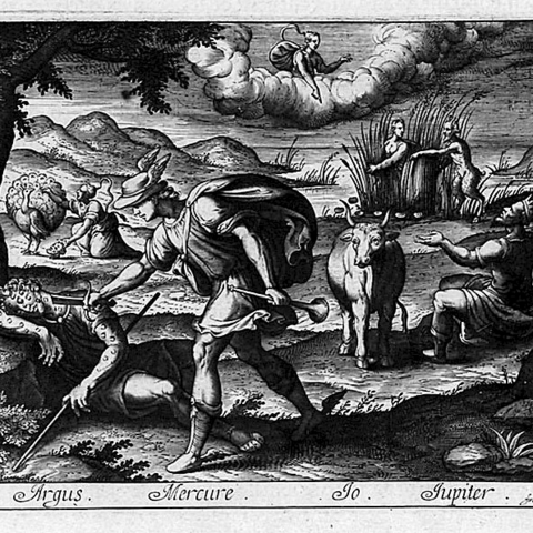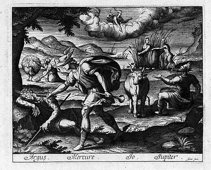 Όταν ο Δίας διέταξε τον Ερμή να κλέψει τη μεταμορφωμένη σε αγελάδα Ιώ από τον πανόπτη Άργο, στάθηκε αδύνατο να το κάνει κρυφά, γιατί ο Ιέρακας φανέρωσε το σχέδιο. Έτσι, ο Ερμής αναγκάστηκε να σκοτώσει τον φύλακα της Ιώς, για να πετύχει τον στόχο του. (Εικ. 1032, 1033) Είναι πολύ πιθανό ότι οι θεοί μεταμόρφωσαν τον Ιέρακα στο ομώνυμο πουλί, αν και δεν υπάρχει σαφής αναφορά στις πηγές (Απολλόδ. 2.1.3).
