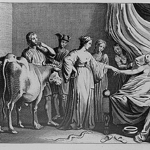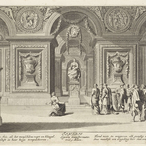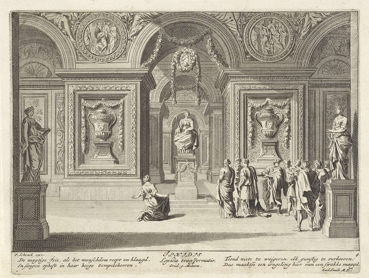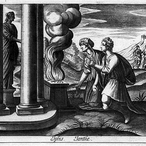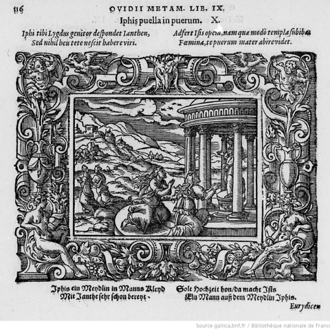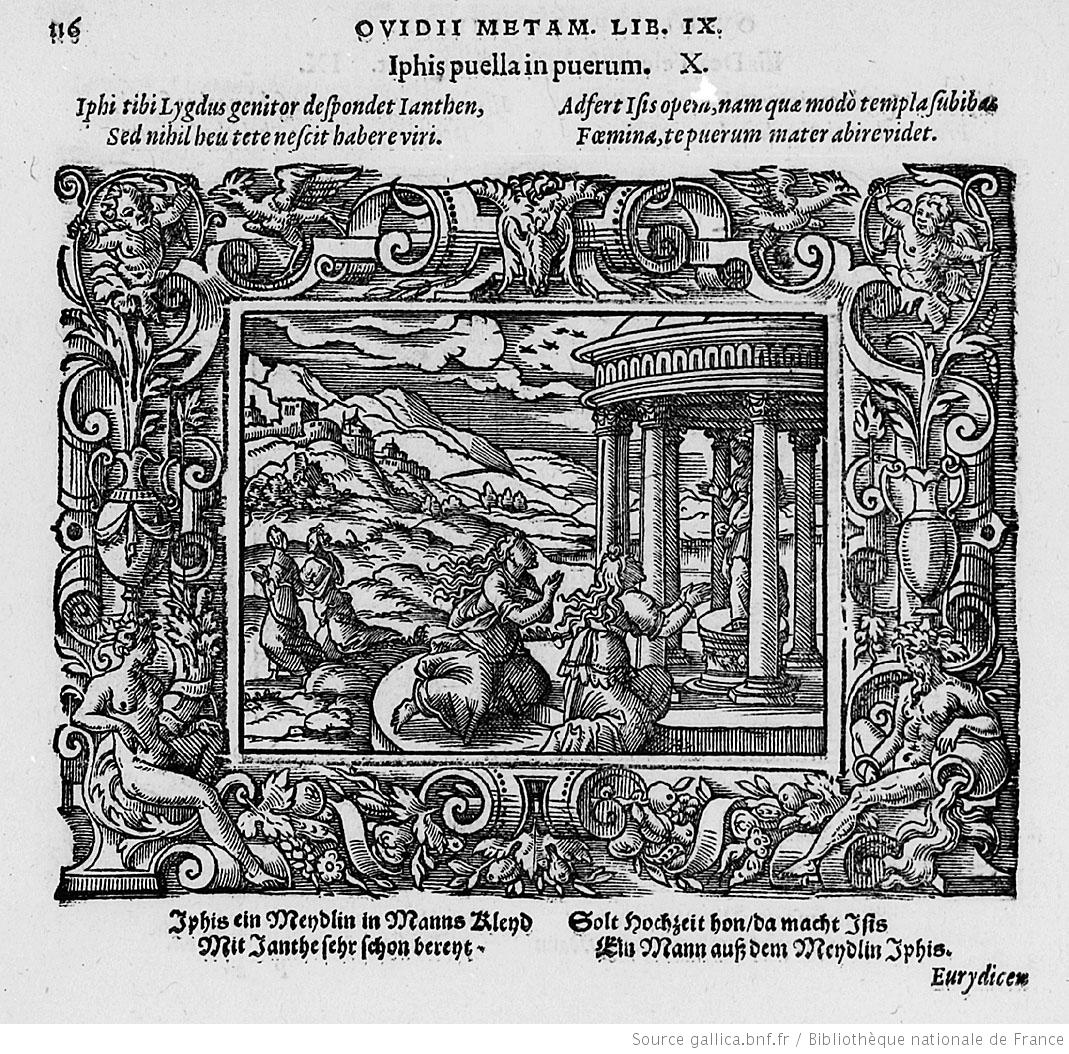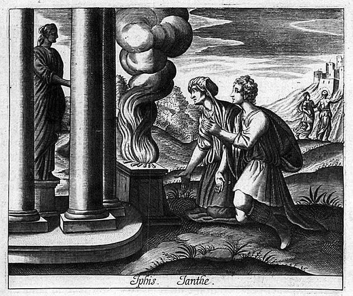 Το αμφίσημο όνομα Ίφις προδίδει την ιστορία μιας μεταμόρφωσης από το ένα φύλο στο άλλο, από κορίτσι σε αγόρι. Η Ίφις ήταν κόρη ελεύθερων αλλά φτωχών Κρητών από τη Φαιστό, του Λίγδου και της Τελέθουσας. Όταν η Τελέθουσα έμεινε έγκυος, ο Λίγδος της παρήγγειλε να του παρουσιάσει το παιδί μόνο αν ήταν αγόρι, αν ήταν κορίτσι να το σκοτώσει. Λίγο πριν γεννήσει, η Τελέθουσα είδε σε όραμα τη θεά Ίσιδα σε όλο το μεγαλείο και με όλη τη συνοδεία της που την πρόσταξε να αναθρέψει το παιδί όποιο κι αν ήταν το φύλο του. Το παιδί γεννήθηκε και η μητέρα, υπακούοντας στις θεϊκές προσταγές, για να σώσει το κορίτσι, το έντυσε αγόρι και το παρουσίασε σαν αγόρι, ενώ ο πατέρας τού έδωσε το όνομα που είχε ο δικός του πατέρας. Ο έρωτας της ξεχωριστής για την ομορφιά και την καταγωγή της Ιάνθης για τον δεκατριάχρονο Ίφι και ο αρραβώνας τους που τόσο επιζητούσε ο πατέρας του/της έφερε σε δύσκολη θέση την Τελέθουσα αλλά και το κορίτσι που ντρεπόταν για το άνομο πάθος του για την ομόφυλή της Ιάνθη. Οι προσευχές της στην Ίσιδα προκάλεσαν τον οίκτο της θεάς που, θέλοντας να απαλλάξει τη μητέρα από τις συνέπειες μιας αποκάλυψης, μεταμόρφωσε την Ίφιδα σε αγόρι. (Εικ. 1144, 1145, 1146, 1147, 1148, 1149)